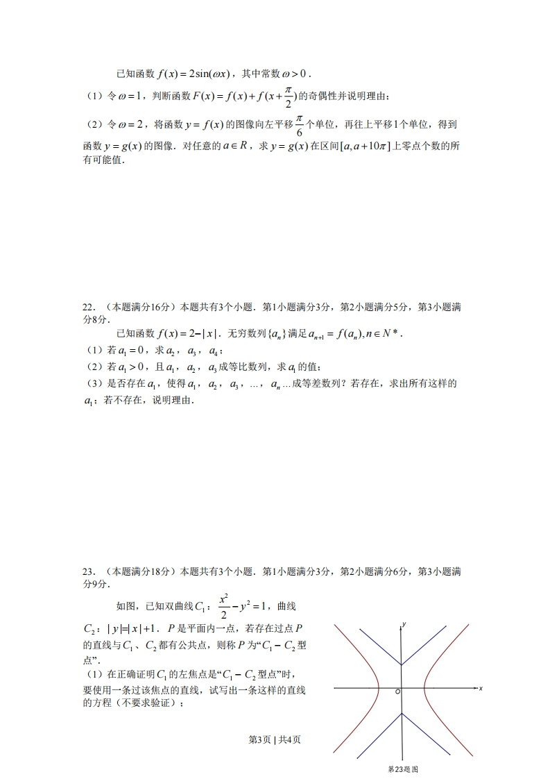 绝密★启用前2013年普通高等学校招生全国统一考试(上海卷)数学试卷(文史类)(满分150分,考试时间120分钟)考生注意1.本场考试时间120分钟,试卷共4页,满分150分,答题纸共2页.2.作答前,在答题纸正面填写姓名、准考证号,反面填写姓名,将核对后的条形码贴在答题纸指定位置3.所有作答务必填涂或书写在答题纸上与试卷思号对应的区域,不得错位.在试卷上作答一律不得分.4,用2B铅笔作答选择题,用黑色字迹钢笔、水笔或圆珠笔作答非选择题,一、填空题(本大题共有14题,满分56分)考生应在答题纸相应编号的空格内直接填写结果,每个空格填对得4分,否则一律得零分,1.不等式,x<0的解为一2.r-2.在等差数列{an}中,若a+a2+a3+a4=30,则4+a3=3.设m∈R,m2+m-2+m2-1)i是纯虚数,其中i是虚数单位,则m=一x y4.若=0,=,则=一5.己知△4BC的内角A、B、C所对的边分别是a,b,c.若a2+ab+b2-c2=0,则角C的大小是」6.某学校高一年级男生人数占该年级学生人数的40%.在一次考试中,男、女生平均分数分别为75、80,则这次考试该年级学生平均分数为7.设常数aeR.若的二项展开式中x?项的系数为-10,则a=8.方程9+1=3的实数解为一3-19.若cosxcos y+-sin xsin y=3则cos(2xr-2列=—10.己知圆柱2的母线长为1,底面半径为r,O是上地面圆心,A、B是下底面圆心上两个不同的点,BC是母线,如图.若直线OA与BC所成角的大小为则11.盒子中装有编号为1,2,3,4,5,6,7的七个球,从中任意取出两个,则这两个球的编号之积为偶数的概率是_(结果用最简分数表示)·12.设AB是椭圆T的长轴,点C在T上,且∠CBA=T.若第10题图AB=4,BC=√2,则厂的两个焦点之间的距离为一·13.设常数a>0,若9x+g≥a+1对一切正实数x成立,则a的取值范围为一14.己知正方形ABCD的边长为1.记以A为起点,其余顶点为终点的向量分别为a,、第1页1共4页a2、a:以C为起点,其余顶点为终点的向量分别为C、C2、c3·若i,j,k,I∈{1,2,3}且i≠j,k≠1,则(何+a)(C+G)的最小值是一二、选择题(本大题共有4题,满分20分)每题有且只有一个正确答案,考生应在答题纸的相应编号上,将代表答案的小方格涂黑,选对得5分,否则一律得零分15.函数f(x)=x2-1(x≥)的反函数为f(x),则f-(2)的值是()(A)V5(B)-V5(c)1+V2(D)1-V216.设常数a∈R,集合A={x|(x-1)(x-a)≥0},B={xx≥a-l}.若AUB=R,则a的取值范围为()(A)(-0,2)(B)(-0,2](C)(2,+0)(D)「2,+0)17.钱大姐常说“好货不便宜”,她这句话的意思是:“好货”是“不便宜”的()(A)充分条件(B)必要条件(C)充分必要条件(D)既非充分又非必要条件18.记椭圆号+=1围成的区域(含边界)为2n(n=1,2,…),当点(x,y)分别在44n+12,22,…上时,x+y的最大值分别是M1,M2,…,则1imMn=()(A)0(B)}(C2D25三.解答题(本大题共有5题,满分74分)解答下列各题必须在答题纸相应编号的规定区域写出必要的步骤.19.(本题满分12分)●如图,正三棱锥O-ABC底面边长为2,高为1,求该三棱锥的体积及表面积.20.(本题满分14分)本题共有2个小题.第1小题满分5分,第2小题满分9分。第19题图甲厂以x千米/小时的速度匀速生产某种产品(生产条件要求1≤x≤10),每小时可获得的利润是100(5x+1-白元.13、(1)求证:生产a千克该产品所获得的利润为100a(5+二2:xx(2)要使生产900千克该产品获得的利润最大,问:甲厂应该如何选取何种生产速度?并求此最大利润.21.(本题满分14分)本题共有2个小题.第1小题满分6分,第2小题满分8分.第2页1共4页己知函数f(x)=2sin(ox),其中常数o>0.(①)令0=1,判断函数F)=八x)+fx+受)的奇偶性并说明理由:(2)令0=2,将函数y=fx)的图像向左平移工个单位,再往上平移1个单位,得到6函数y=g(x)的图像.对任意的a∈R,求y=g(x)在区间[a,a+10π]上零点个数的所有可能值.22.(本题满分16分)本题共有3个小题.第1小题满分3分,第2小题满分5分,第3小题满分8分.己知函数f(x)=2-|x.无穷数列{an}满足anH=f(an),n∈N*.(1)若41=0,求42,43,a4:(2)若41>0,且a,4,43成等比数列,求4的值:(3)是否存在41,使得4,42,43,,an…成等差数列?若存在,求出所有这样的a:若不存在,说明理由.23.(本题满分18分)本题共有3个小题.第1小题满分3分,第2小题满分6分,第3小题满分9分.如图,已知双曲线C:¥-y2=1,曲线C2:Iy曰x|+1.P是平面内一点,若存在过点P的直线与C、C2都有公共点,则称P为“C,-C2型点”.(1)在正确证明C的左焦点是“C,-C2型点”时,要使用一条过该焦点的直线,试写出一条这样的直线的方程(不要求验证):第3页|共4页第23题图