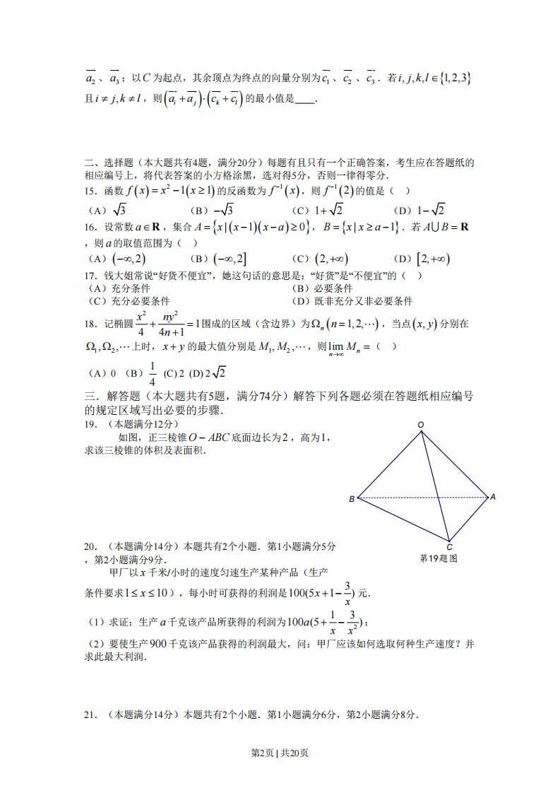 绝密★启用前2013年普通高等学校招生全国统一考试(上海卷)数学试卷(文史类)(满分150分,考试时间120分钟)考生注意1.本场考试时间120分钟,试卷共4页,满分150分,答题纸共2页.2.作答前,在答题纸正面填写姓名、准考证号,反面填写姓名,将核对后的条形码贴在答题纸指定位置3.所有作答务必填涂或书写在答题纸上与试卷思号对应的区域,不得错位.在试卷上作答一律不得分.4,用2B铅笔作答选择题,用黑色字迹钢笔、水笔或圆珠笔作答非选择题,一、填空题(本大题共有14题,满分56分)考生应在答题纸相应编号的空格内直接填写结果,每个空格填对得4分,否则一律得零分,1.不等式,x<0的解为一2r-2.在等差数列{an}中,若a+a2+a3+a4=30,则4+a3=3.设m∈R,m2+m-2+m2-1)i是纯虚数,其中i是虚数单位,则m=一x y4.若=0,山,则=5.己知△4BC的内角A、B、C所对的边分别是a,b,c.若a2+ab+b2-c2=0,则角C的大小是」6.某学校高一年级男生人数占该年级学生人数的40%.在一次考试中,男、女生平均分数分别为75、80,则这次考试该年级学生平均分数为7.设常数aeR.若的二项展开式中x?项的系数为-10,则a=8.方程9+1=3的实数解为一3-19.若cosxcos y+-sin xsin y=3则cos(2xr-2列=—10.己知圆柱2的母线长为1,底面半径为r,O是上地面圆心,A、B是下底面圆心上两个不同的点,BC是母线,如图.若直线OA与BC所成角的大小为则11.盒子中装有编号为1,2,3,4,5,6,7的七个球,从中任意取出两个,则这两个球的编号之积为偶数的概率是_(结果用最简分数表示)·12.设AB是椭圆T的长轴,点C在T上,且∠CBA-T.若第10题图AB=4,BC=√2,则厂的两个焦点之间的距离为一·13.设常数a>0,若9x+g≥a+1对一切正实数x成立,则a的取值范围为一14.己知正方形ABCD的边长为1.记以A为起点,其余顶点为终点的向量分别为a,、第1页1共20页a2、a:以C为起点,其余顶点为终点的向量分别为C、C2、c3·若i,j,k,I∈{1,2,3}且i≠j,k≠1,则(何+a)(C+G)的最小值是一二、选择题(本大题共有4题,满分20分)每题有且只有一个正确答案,考生应在答题纸的相应编号上,将代表答案的小方格涂黑,选对得5分,否则一律得零分15.函数f(x)=x2-1(x≥)的反函数为f(x),则f-(2)的值是()(A)V5(B)-V5(c)1+V2(D)1-V216.设常数a∈R,集合A={x|(x-1)(x-a)≥0},B={xx≥a-l}.若AUB=R,则a的取值范围为()(A)(-0,2)(B)(-0,2](C)(2,+0)(D)「2,+0)17.钱大姐常说“好货不便宜”,她这句话的意思是:“好货”是“不便宜”的()(A)充分条件(B)必要条件(C)充分必要条件(D)既非充分又非必要条件18.记椭圆号+=1围成的区域(含边界)为2n(n=1,2,…),当点(x,y)分别在44n+12,22,…上时,x+y的最大值分别是M1,M2,…,则1imMn=()(A)0(B)}(C2D25三.解答题(本大题共有5题,满分74分)解答下列各题必须在答题纸相应编号的规定区域写出必要的步骤.19.(本题满分12分)●如图,正三棱锥O-ABC底面边长为2,高为1,求该三棱锥的体积及表面积.20.(本题满分14分)本题共有2个小题.第1小题满分5分,第2小题满分9分。第19题图甲厂以x千米/小时的速度匀速生产某种产品(生产条件要求1≤x≤10),每小时可获得的利润是100(5x+1-白元.13、(1)求证:生产a千克该产品所获得的利润为100a(5+二2:xx(2)要使生产900千克该产品获得的利润最大,问:甲厂应该如何选取何种生产速度?并求此最大利润.21.(本题满分14分)本题共有2个小题.第1小题满分6分,第2小题满分8分.第2页1共20页己知函数f(x)=2sin(ox),其中常数o>0.(①)令0=1,判断函数F)=八x)+fx+受)的奇偶性并说明理由:(2)令0=2,将函数y=fx)的图像向左平移工个单位,再往上平移1个单位,得到6函数y=g(x)的图像.对任意的a∈R,求y=g(x)在区间[a,a+10π]上零点个数的所有可能值.22.(本题满分16分)本题共有3个小题.第1小题满分3分,第2小题满分5分,第3小题满分8分.己知函数f(x)=2-|x.无穷数列{an}满足anH=f(an),n∈N*.(1)若41=0,求42,43,a4:(2)若41>0,且a,4,43成等比数列,求4的值:(3)是否存在41,使得4,42,43,,an…成等差数列?若存在,求出所有这样的a:若不存在,说明理由.23.(本题满分18分)本题共有3个小题.第1小题满分3分,第2小题满分6分,第3小题满分9分.如图,已知双曲线C:¥-y2=1,曲线C2:Iy曰x|+1.P是平面内一点,若存在过点P的直线与C、C2都有公共点,则称P为“C,-C2型点”.(1)在正确证明C的左焦点是“C,-C2型点”时,要使用一条过该焦点的直线,试写出一条这样的直线的方程(不要求验证):第3页|共20页第23题图