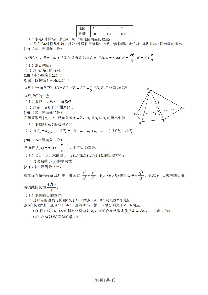 2014年高考数学试卷(文)(山东)(空白卷)虎虎1个月前发布关注0.17MB3页2614 第1页 / 共3页 第2页 / 共3页 第3页 / 共3页 已完成全部阅读,共3页 2014年高考数学试卷(文)(山东)(空白卷)此内容为免费资源,请登录后查看¥0 登录查看免费资源THE END数学 文本预览 2014年普通高等学校招生全国统一考试文科数学山东卷第1卷(共50分)一、选择题:本大题共10小题,每小题5分,共50分.在每小题给出的四个选项中,只有一项是符合题目要求的。(1)己知a,b∈R,i是虚数单位.若a+i=2-bi,则(a+b2=(A)3-4i(B)3+4i(c)4-3i(D)4+3i(2)设集合A={x|x2-2x<0},B={x|1≤x≤4},则A∩B=(A)(0,2](B)(1,2)(c)[1,2)(D)(1,4)(3)函数f(x)==的定义域为log x-1(A)(0,2)(B)(0,2](C)(2,+o)(D)[2,+0)(4)用反证法证明命题:“设a,b为实数,则方程x3++b=0至少有一个实根”时,要做的假设是(A)方程x3+am+b=0没有实根(B)方程x3+ar+b=0至多有一个实根(C)方程x3+ar+b=0至多有两个实根(D)方程x3+r+b=0恰好有两个实根(5)己知实数x,y满足a<(0y3(B)sinx>sin y(cln(x2+1)>ln(y2+1)11o)x2+>y+1(6)己知函数y=log,(x+c(a,c为常数,其中a>0,a≠1)的图象如右图,则下列结论成立的是E(A)a>0,c>1(B)a>1,01(D)00,b>0)在该约束条件下取到最2x-y-3≥0,小值2√5时,a2+b2的最小值为(A)5(B)4(c5(D)2第II卷(共100分)二、填空题:本大题共5小题,每小题5分,共25分.(11)执行右面的程序框图,若输入的x的值为1,则输出的n的值为一5开始(12)函数y=sin2x+cos2x的最小正周期为输入X(13)一个六棱锥的体积为2√3,其底面是边长为2的正六边形,侧棱长都相等n=0,则该六棱锥的侧面积为(14)否圆心在直线x-2y=0上的圆C与y轴的正半轴相切,圆C截x轴所得-4x+3s0弦的长为2√5,则圆C的标准方程为。(15)x=x+1已知双曲线-输入x云~京=1(a>0,6>0)的焦距为2C,右顶点为A,抛物线n=n+1结束x2=2py(p>0)的焦点为F,若双曲线截抛物线的准线所得线段长为2c,且|FA=c,则双曲线的渐近线方程为三、解答题:本大题共6小题,共75分(16)(本小题满分12分)海关对同时从A,B,C三个不同地区进口的某种商品进行抽样检测,从各地区进口此种商品的数量(单位:件)如右表所示.工作人员用分层抽样的方法从这些商品中共抽取6件样品进行检测.第2页1共3页地区A数量50150100(I)求这6件样品中来自A,B,C各地区商品的数量:()若在这6件样品中随机抽取2件送往甲机构进行进一步检测,求这2件商品来自相同地区的概率.(17)(本小题满分12分)π中,角A,B,C所对的边分别为a,b,c.已知a=3,cosA=,B=A(I)求b的值:(II)求△ABC的面积.(18)(本小题满分12分)如图,四棱锥P-ABCD中,⊥平面PCD,AD∥BC,AB=BC=7AD,E,F分别为线盟AD,PC的中点(I)求证:AP∥平面BEF:(II)求证:BE⊥平面PAC.(19)(本小题满分12分)在等差数列{an}中,己知公差d=2,a2是a,与a的等比中项.(I)求数列{an}的通项公式:(I)设bn=a+l'记Tn=-b+b2-b3+b-…+(-1”bn,求Tn.2(20)(本小题满分13分)设函数f(x)=alnx+X-+i,其中a为常数(I)若a=0,求曲线y=f(x)在点(1,f()处的切线方程:()讨论函数f(x)的单调性,(21)(本小题满分14分)在平面直角坐标系0y中,椭圆C行+存=1a>6>0)的离心蜜为,直线y=x被椭圆C截2得的线段长为4/105(I)求椭圆C的方程:(II)过原点的直线与椭圆C交于A,B两点(A,B不是椭圆C的顶点)点D在椭圆C上,且AD⊥AB,直线BD与x轴、y轴分别交于M,N两点.(i)设直线BD,AM的斜率分别为k1,k,证明存在常数入使得k1=k,并求出入的值:(ii)求△OMN面积的最大值.第3页|共3页 查看更多 收起部分 喜欢就支持一下吧点赞14 分享QQ空间微博QQ好友海报分享复制链接收藏