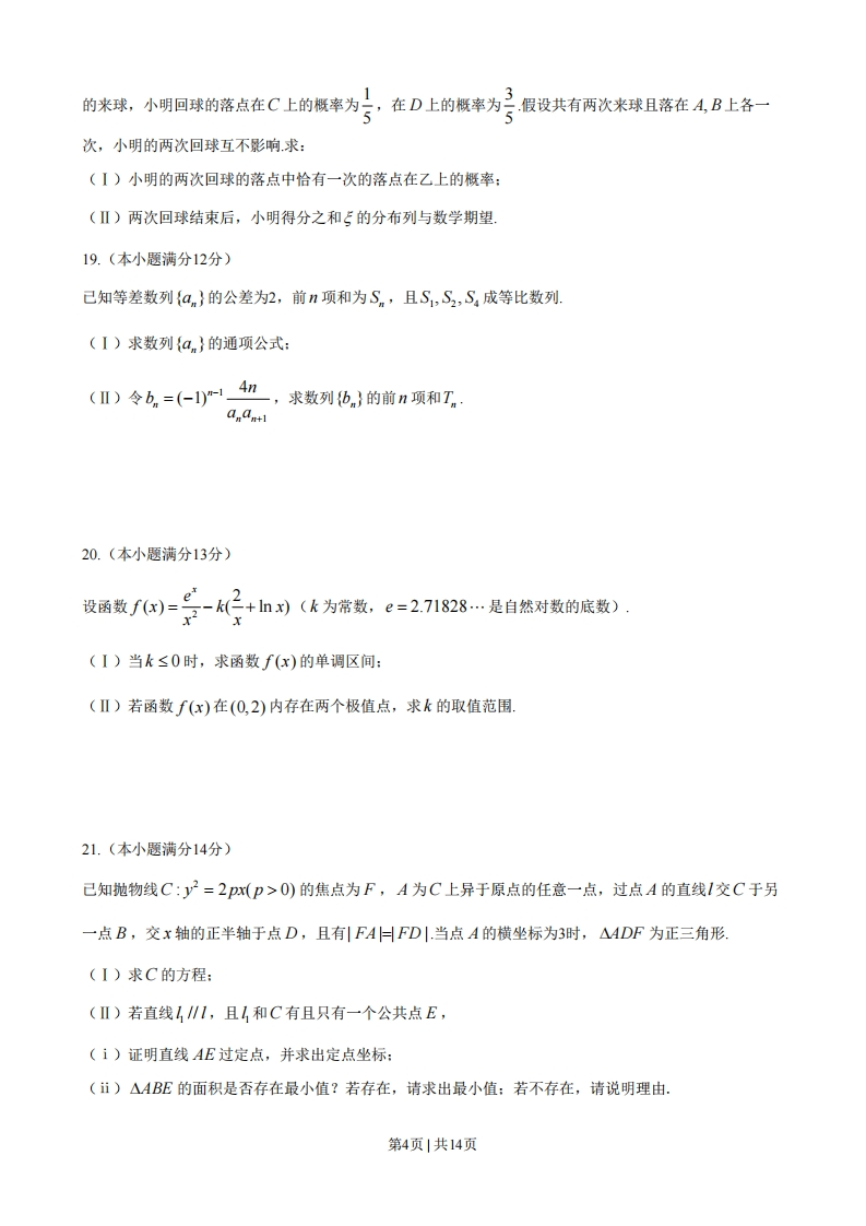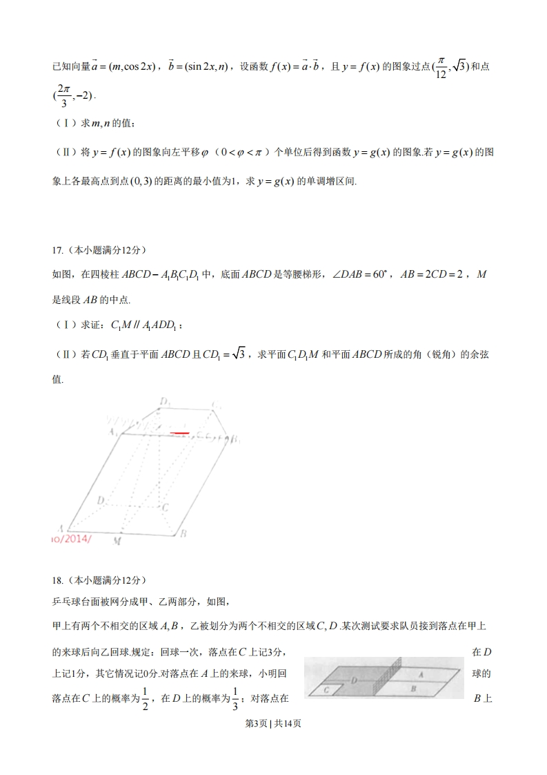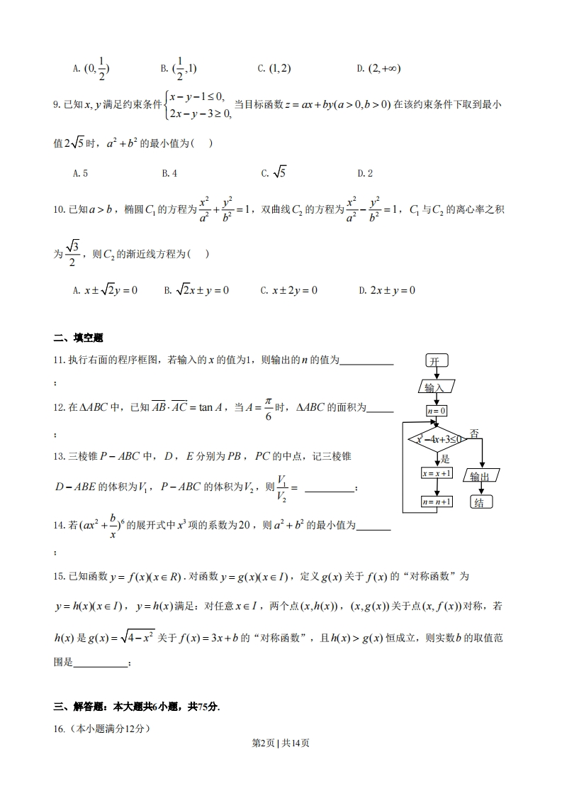 In(y2+1)C.sinx>sin y D.x3 y3x2+1y2+16.直线y=4x与曲线y=x在第一象限内围成的封闭图形的面积为()A.2W2B.4v2C.2D.47.为研究某药品的疗效,选取若干名志愿者进行临床试验,所有志↑频率/组距0.36-愿者的舒张压数据(单位:kPa)的分组区间为[12,13),[13,14)0.240.16,[14,15),[15,16),[16,17刀,将其按从左到右的顺序分别编号0.08为第一组,第二组,·,第五组.右图是根据试验数据制成的12114151617舒张/2a频率分布直方图.己知第一组与第二组共有20人,第三组中没有疗效的有6人,则第三组中有疗效的人数为()A.1B.8C.12D.188.己知函数f(x)x-2|+1,g(x)=c,若f(x)=g(x)有两个不相等的实根,则实数k的取值范围是()第1页1共14页@B(D)C.(1,2)D.(2,+o)9.已知x,y满足约束条件x-y-1≤0,当目标函数z=ax+by(a>0,b>0)在该约束条件下取到最小12x-y-3≥0,值2V5时,a2+b2的最小值为()A.5B.4C.5D.20.已知a>b,椭圆C的方程为子+片,双曲线C的方程为父-)云京=1,G与C,的离心率之积为⑤,则C,的渐近线方程为()A.x±V2y=0B.V2x±y=0C.x±2y=0D.2x±y=0二、填空题11.执行右面的程序框图,若输入的x的值为1,则输出的n的值为12.在△4BC中,已知AB.AC=anA,当A=T时,△4BC的面积为6-4r+3D13.三棱锥P-ABC中,D,E分别为PB,PC的中点,记三棱锥输出D-ABE的体积为V,P-ABC的体积为V,则二=结b14.若(ar2+2)的展开式中x2项的系数为20,则a2+b2的最小值为」15.已知函数y=f(x)x∈R).对函数y=g(x)(x∈),定义g(x)关于f(x)的“对称函数”为y=h(x)(x∈),y=h(x)满足:对任意x∈I,两个点(x,h(x),(x,g(x)关于点(x,f(x)对称,若h(x)是g(x)=√4-x2关于f(x)=3x+b的“对称函数”,且h(x)>g(x)恒成立,则实数b的取值范围是三、解答题:本大题共6小题,共75分16.(本小题满分12分)第2页|共14页已知向量a=(mcos2),石=(6in2x川,设函数f)=a-6,且y=f)的图象过点(受V)和点5-2》(I)求m,n的值:(Ⅱ)将y=f(x)的图象向左平移p(0
