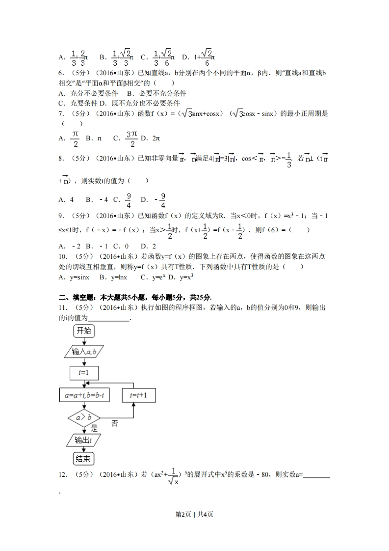 2016年山东省高考数学试卷(理科)一、选择题:本大题共10小题,每小题5分,共50分,年小题给出四个选项,只有一个选项符合愿目要求1.(5分)(2016山东)若复数z满足2z+3-2i,其中i为虚数单位,则()A.1+2iB.1-2iC.-1+2iD.-1-2i2.(5分)(2016山东)设集合A={yy=2x,x∈R},B={xk2-1<0},则AUB=()A.(-1,1)B.(0,1)C.(-1,+∞)D.(0,+∞)3.(5分)(2016山东)某高校调查了200名学生每周的自习时间(单位:小时),制成了如图所示的频率分布直方图,其中自习时间的范围是[17.5,30],样本数据分组为[17.5,20),[20,22.5),[22.5,25),25,27.5),27.5,30].根据直方图,这200名学生中每周的自习时间不少于22.5小时的人数是()频率十组距0.160.100.080.040.02017.5202252527530自习时间/小时A.56B.60C.120D.140x+y≤24.(5分)(2016山东)若变量x,y满足{2x-3y<9,则x2+y2的最大值是()x>0A.4B.9C.10D.125.(5分)(2016山东)一个由半球和四棱锥组成的几何体,其三视图如图所示.则该几何体的体积为()正(主)视图侧(左)视图俯视图第1页1共4页A.t3B.C.互D.1+33333666.(5分)(2016山东)己知直线a,b分别在两个不同的平面a,B内.则“直线a和直线b相交”是“平面α和平面B相交”的()A.充分不必要条件B.必要不充分条件C.充要条件D.既不充分也不必要条件7.(5分)(2016山东)函数f(x)=(√3sinx+cosx)(√3osx-sinx)的最小正周期是()A.2B.元C.3πD.2n28.(5分)(2016山东)已知非零向量正,满足4i3引,cos<,>=.若i1(1正3+,则实数的值为(A.4B.-4C.9D.-949.(5分)(2016山东)已知函数f(x)的定义域为R.当x<0时,f(x)x3-1:当-1≤x≤1时,f(-x)=-f(x):当x>时,f(x+马=f(x-马.则f(6)=()A.-2B.-1C.0D.210.(5分)(2016山东)若函数y=f(x)的图象上存在两点,使得函数的图象在这两点处的切线互相垂直,则称y=f(x)具有T性质.下列函数中具有T性质的是()A.y=sinx B.y=Inx C.y=ex D.y=x3二、填空题:本大题共5小题,每小题5分,共25分11.(5分)(2016山东)执行如图的程序框图,若输入的a,b的值分别为0和9,则输出的的值为开始输入a,bi=1a=a+i,b=b-i=+1
