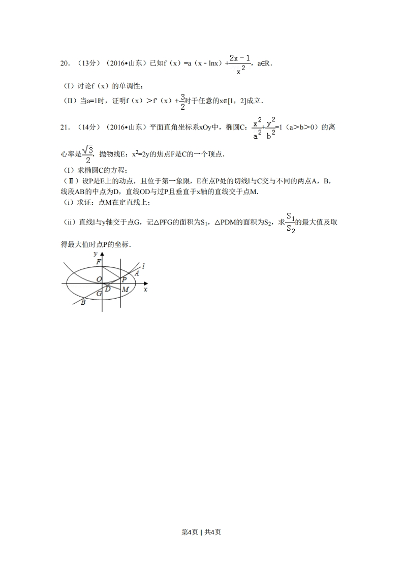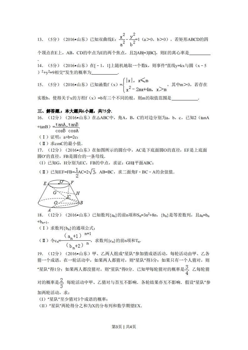0),若矩形ABCD的四a2个顶点在E上,AB,CD的中点为E的两个焦点,且2AB=3BC,则E的离心率是14.(5分)(2016山东)在[-1,1]上随机地取一个数k,则事件“直线y=kx与圆(x-5)2+y2=9相交”发生的概率为x,x≤m15.(5分)(2016山东)己知函数f(x)=,其中m>0,若存在x2-2mx+4m,x>m实数b,使得关于x的方程f(x)=b有三个不同的根,则m的取值范围是三、解答题,:本大题共6小题,共75分16.(12分)(2016山东)在△ABC中,角A,B,C的对边分别为a,b,c,己知2(anA+tanB)=tanA,tanBcosB cosA(I)证明:ab=2c:(Ⅱ)求cosC的最小值.17.(12分)(2016山东)在如图所示的圆台中,AC是下底面圆0的直径,EF是上底面圆O的直径,FB是圆台的一条母线.(I)己知G,H分别为EC,FB的中点,求证:GHI平面ABC:(I)己知EF=FB=上AC=2√5,AB=BC,求二面角F-BC-A的余弦值.E02B18.(12分)(2016山东)己知数列{an}的前n项和Sn=3n2+8n,{bn}是等差数列,且an=bn+bn+1.(I)求数列{b}的通项公式:(ant1)nt(Ⅱ)令cn=求数列{cn}的前n项和Tn(b+2)n'19.(12分)(2016山东)甲、乙两人组成“星队”参加猜成语活动,每轮活动由甲、乙各猜一个成语,在一轮活动中,如果两人都猜对,则“星队“得3分:如果只有一个人猜对,则“星队“得1分:如果两人都没猜对,则“星队“得0分.已知甲每轮猜对的概率是3乙每轮猜4对的概率是二每轮活动中甲、乙猜对与否互不影响。各轮结果亦互不影响.假设“星队”参加两轮活动,求:(I)“星队”至少猜对3个成语的概率:(Ⅱ)“星队”两轮得分之和为X的分布列和数学期望EX.第3页1共4页