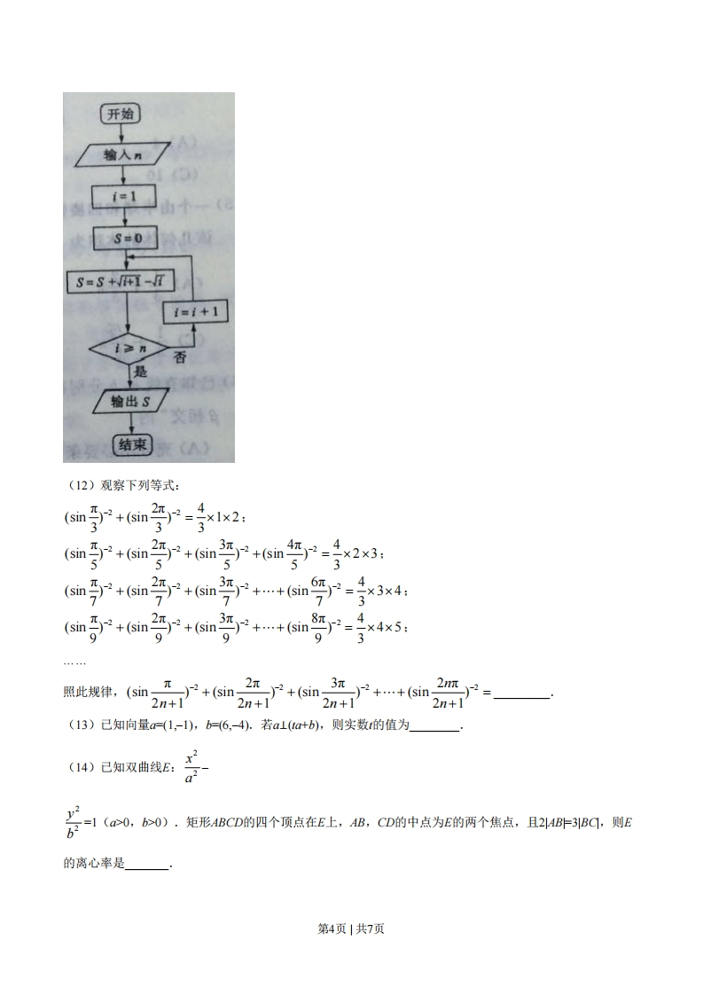 2016年普通高等学校招生全国统一考试(山东卷)数学(文科)本试卷分第缸卷和第Ⅱ卷两部分,共4页。满分150分。考试用时120分钟。考试结束后,将将本试卷和答题卡一并交回。注意事项:1.答卷前,考生务必用0.5毫米黑色签字笔将自已的姓名、座号、考生号、县区和科类填写在答题卡和试卷规定的位置上。2.第I卷每小题选出答案后,用2B铅笔把答题卡上对应题目的答案标号涂黑;如需改动,用橡皮擦干净后,在选涂其他答案标号。答案写在试卷上无效。3.第卷必须用0.5毫米黑色签字笔作答,答案必须写在答题卡各题目指定区域内相应的位置,不能写在试卷上;如需改动,先划掉原来的答案,然后再写上新的答案;不能使用涂改液、胶带纸、修正带。不按以上要求作答的答案无效。4填空题直接填写答案,解答题应写出文字说明、证明过程或演算步骤参考公式:如果事件A,B互斥,那么P(A+B)=P(A)+PB):第I卷(共50分)一、选择题:本大题共10小题,每小题5分,共50分,在每小题给出的四个选项中,只有一项是符合题目要求的(1)设集合U={1,2,3,4,5,6,A={1,3,5},B={3,4,5},则9(AUB)=第1页|共7页(A){2,6}(B){3,6}(C){1,3,4,5(D){1,2,4,6(2)若复数:=弓,其中为虚数单位,则:2(A)1+i(B)1-i(C)-1+i(D)-1-i(3)某高校调查了200名学生每周的自习时间(单位:小时),制成了如图所示的频率分布直方图,其中自习时间的范围是[17.5,30],样本数据分组为17.5,20),[20,22.5),[22.5,25),[25,27.5),[27.5,30).根据直方图,这200名学生中每周的自习时间不少于22.5小时的人数是(A)56(B)60(C)120(D)140枫率0.160.100.080.040.02017.52022.52527530自习时间小时120x+y≤2,(4)若变量x,y满足{2x-3y≤9,则x24+2的最大值是x≥0,(A)4(B)9(C)10(D)12(5)一个由半球和四棱锥组成的几何体,其三视图如图所示则该几何体的体积为正(主》视图侧(左)视图俯祝困(A))133π第2页|共7页(c)36π(D)1+262(6)己知直线a,b分别在两个不同的平面a,b内,则“直线a和直线b相交”是“平面a和平面b相交”的(A)充分不必要条件(B)必要不充分条件(C)充要条件(D)既不充分也不必要条件(7)己知圆M:x2+y2.2=0(a>0)截直线x+y=0所得线段的长度是2√5,则圆M与圆N:(x1)2+(0y-1)2=1的位置关系是(A)内切(B)相交(C)外切(D)相离(8)△ABC中,角A,B,C的对边分别是a,b,c,己知b=c,a2=2b21-sin),则4=A)至(B)号(C)晋D)君(9已知函数)的定义域为R当r<0时,21:当-1Ss1时,心一fr:当r>时,r+)x22则61(A)-2(B)-1(C)0(D)2(10)若函数y=f(x)的图象上存在两点,使得函数的图象在这两点处的切线互相垂直,则称y=f(x)具有T性质.下列函数中具有T性质的是学科&网(A)y=sinx(B)y=Inx(C)y=e*(D)y=x3第Ⅱ卷(共100分)二、填空题:本大题共5小题,每小题5分,共25分。(11)执行右边的程序框图,若输入n的值为3,则输出的S的值为第3页|共7页