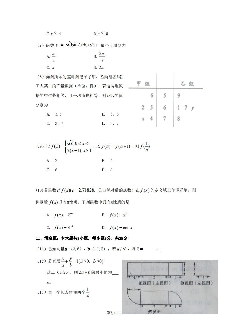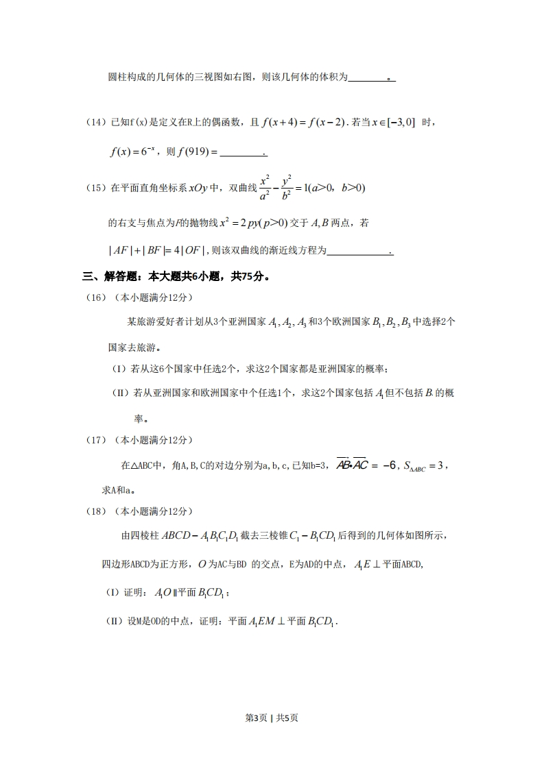 2017年普通高等学校招生全国统一考试(山东卷)文科数学一、选择题:本大题共10小题,每小题5分,共50分,在年小题给出的四个选项中,只有一项是符号题目要求的,(1)设集合M={x‖x-1k1},N={x|x<2}则M∩N=A.(-1,1)B.(-1,2)C.(0,2)D.(1,2)(2)已知i是虚数单位,若复数z满足i=1+i,则z2=A.-21B.2iC.-2D.2x-2y+5≤0,(3)己知x,y满足约束条件x+3≥0,则z=x+2y的最大值是y≤2,A.-3B.-1C.1D.3(4)已知cosr=3则c0s2x=A-1B.11开始C.-D.8f(5)己知命题p:3x∈R,输人xx2-x+1≥0:命题q:若a23B.x>4第1页1共5页C.x≤4D.x≤5(7)函数y=V3sin2.x+cos22x最小正周期为4交B.2πC.πD.2π(8)如图所示的茎叶图记录了甲、乙两组各5名工人某日的产量数据(单位:件)。若这两组数甲组乙组据的中位数相等,且平均值也相等,则x和y的值65分别为26A.3,5B.5,5478C.3,7D.5,7(9)设f(x)=反,00,b>0)a b过点(1,2),则2a+b的最小值为。正视图(主视图)侧视图(左视图)(13)由一个长方体和两个(8第2页|俯视图圆柱构成的几何体的三视图如右图,则该几何体的体积为」(14)己知f(x)是定义在R上的偶函数,且f(x+4)=f(x-2).若当x∈[-3,0]时,f(x)=6-x,则f(919)=5》在平面直角生标系0,中,双自线苦一茶=1o0>06>0的右支与焦点为F的抛物线x2=2)(p>0)交于A,B两点,若|AF|+|BF上=4|OF|,则该双曲线的渐近线方程为三、解答题:本大题共6小题,共75分。(16)(本小题满分12分)某旅游爱好者计划从3个亚洲国家A,A2,A和3个欧洲国家B,B2,B中选择2个国家去旅游。(I)若从这6个国家中任选2个,求这2个国家都是亚洲国家的概率:(Ⅱ)若从亚洲国家和欧洲国家中个任选1个,求这2个国家包括A但不包括B.的概率。(17)(本小题满分12分)在△ABC中,角A,B,C的对边分别为a,b,c,己知b=3,A8AC=-6,SABc=3,求A和a.(18)(本小题满分12分)由四棱柱ABCD-AB,C,D截去三棱锥C,一B,CD后得到的几何体如图所示,四边形ABCD为正方形,O为AC与BD的交点,E为AD的中点,AE⊥平面ABCD,(I)证明:AO平面B,CD:(Ⅱ)设M是OD的中点,证明:平面A,EM⊥平面BCD:第3页1共5页