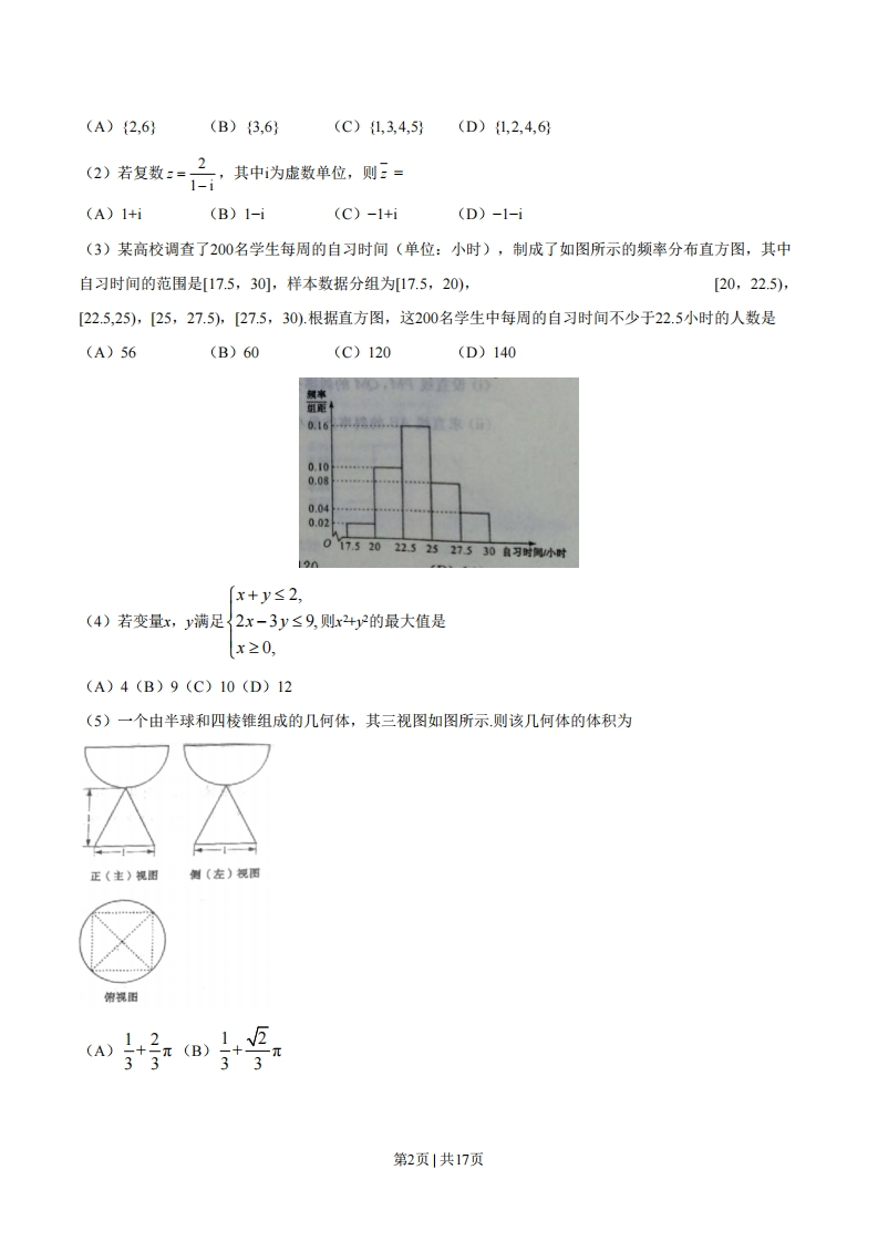 2016年普通高等学校招生全国统一考试(山东卷)数学(文科)本试卷分第缸卷和第Ⅱ卷两部分,共4页。满分150分。考试用时120分钟。考试结束后,将将本试卷和答题卡一并交回。注意事项:1.答卷前,考生务必用0.5毫米黑色签字笔将自已的姓名、座号、考生号、县区和科类填写在答题卡和试卷规定的位置上。2.第I卷每小题选出答案后,用2B铅笔把答题卡上对应题目的答案标号涂黑;如需改动,用橡皮擦干净后,在选涂其他答案标号。答案写在试卷上无效。3.第卷必须用0.5毫米黑色签字笔作答,答案必须写在答题卡各题目指定区域内相应的位置,不能写在试卷上;如需改动,先划掉原来的答案,然后再写上新的答案;不能使用涂改液、胶带纸、修正带。不按以上要求作答的答案无效。4填空题直接填写答案,解答题应写出文字说明、证明过程或演算步骤参考公式:如果事件A,B互斥,那么P(A+B)=P(A)+PB):第I卷(共50分)一、选择题:本大题共10小题,每小题5分,共50分,在每小题给出的四个选项中,只有一项是符合题目要求的(1)设集合U={1,2,3,4,5,6,A={1,3,5},B={3,4,5},则9(AUB)=第1页1共17页(A){2,6}(B){3,6}(C){1,3,4,5(D){1,2,4,6(2)若复数:=二,其中为虚数单位,则:=2(A)1+i(B)1-i(C)-1+i(D)-1-i(3)某高校调查了200名学生每周的自习时间(单位:小时),制成了如图所示的频率分布直方图,其中自习时间的范围是[17.5,30],样本数据分组为17.5,20),[20,22.5),[22.5,25),[25,27.5),[27.5,30).根据直方图,这200名学生中每周的自习时间不少于22.5小时的人数是(A)56(B)60(C)120(D)140枫率0.160.100.080.040.02017.52022.52527530自习时间小时120x+y≤2,(4)若变量x,y满足{2x-3y≤9,则x24+2的最大值是x≥0,(A)4(B)9(C)10(D)12(5)一个由半球和四棱锥组成的几何体,其三视图如图所示则该几何体的体积为正(主》视图侧(左)视图俯祝困(A)33π第2页|共17页(c)36π(D)1+262(6)己知直线a,b分别在两个不同的平面a,b内,则“直线a和直线b相交”是“平面a和平面b相交”的(A)充分不必要条件(B)必要不充分条件(C)充要条件(D)既不充分也不必要条件(7)己知圆M:x2+y2.2=0(a>0)截直线x+y=0所得线段的长度是2√5,则圆M与圆N:(x1)2+(0y-1)2=1的位置关系是(A)内切(B)相交(C)外切(D)相离(8)△ABC中,角A,B,C的对边分别是a,b,c,己知b=c,a2=2b21-sin),则4=A)至(B)号(C)晋D)君(9已知函数)的定义域为R当r<0时,21:当-1Ss1时,心一fr:当r>时,r+)x22则61(A)-2(B)-1(C)0(D)2(10)若函数y=f(x)的图象上存在两点,使得函数的图象在这两点处的切线互相垂直,则称y=f(x)具有T性质.下列函数中具有T性质的是学科&网(A)y=sinx(B)y=Inx(C)y=e*(D)y=x3第Ⅱ卷(共100分)二、填空题:本大题共5小题,每小题5分,共25分。(11)执行右边的程序框图,若输入n的值为3,则输出的S的值为第3页1共17页