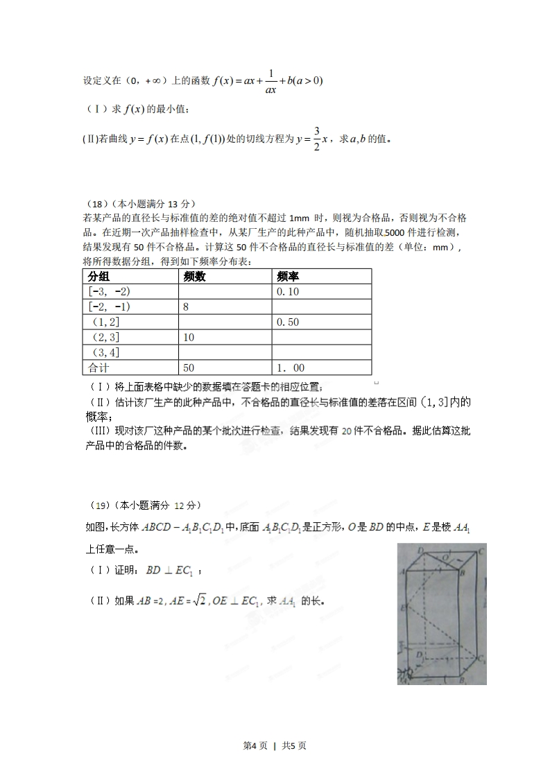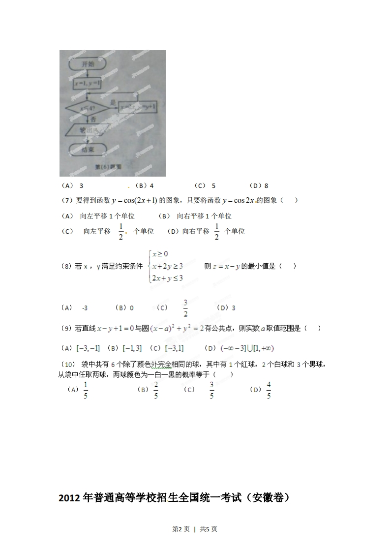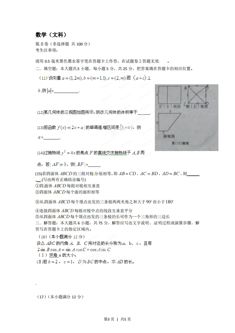 2012年普通高等学校招生全国统一考试(安徽卷)数学(文科)本试卷分第1卷(选择题)和第Ⅱ卷(非选择题)两部分,第1卷第1至2页,第山卷第3至第4页。全卷满分150分,考试时间120分钟。考生注意事项:1.务必在试题卷、答题卡自己的姓名、座位号,并认真粘贴的条形码中姓名座位号是否一致。务必面规定的地方填写姓名和座位号后两位。2.答第1卷时,每小题选出答案后,用2B铅笔把答题卡上对应题目的答案标号涂黑。如需改动,用橡皮擦干净后,再选涂其他答案标号。3.答第Ⅱ卷时,必须使用0.5毫米的黑色墨水签字笔在答题卡上书写,要求字体工整、笔迹清晰。作图题可先用铅笔在答题卡规定的位置绘出,确认后再用0.5毫米的黑色墨水签字笔描清楚。必须在题号所指示的答题区域作答,超出答题区域书写的答案无效,在试题卷、草稿纸上答题无效。4考试结束,务必将试卷和答题卡一并上交。第I卷(选择题共50分)一、选择题:本大题共10小题,每小题5分,共50分,在每小题给出的四个选项中,只有一项是符合题目要求的。(1)复数z满足(z-i)i=2+i,则z=()(A)-1-i(B)1-i(c)-1+3i(D)1-2i(2)设集合A={x-3≤2x-1≤3},集合B为函数y=1g(x-)的定义域,则A∩B=()(A)(1,2)(B)[1,2](c)【1,2)(D)(1,2](3)1og:9)Qog:4)=()(A)1(B)(c)2(D)4(4)命题“存在实数x,使x>1”的否定是()(A)对任意实数x,都有×>1(B)不存在实数%使X≤1(c)对任意实数x,都有×≤1(D)存在实数x使×≤1(5)公比为2的等比数列{an}的各项都是正数,且aa1=16,则a5=()(A)1(B)2(c)4(D)8(6)如图所示,程序框图(算法流程图)的输出结果是()第1页|共5页第(6)严里(A)3.(B)4(c)5(D)8(7)要得到函数y=Cos(2x+1)的图象,只要将函数y=cos2x的图象()(A)向左平移1个单位(B)向右平移1个单位1(c)向左平移2·个单位(D)向右平移2个单位x≥0(8)若x,y满足约束条件x+2y23则z=x-y的最小值是()2x+y≤3(A)3(B)0(c)3(D)3(9)若直线x-y+1=0与圆(x-a)2+y2=2有公共点,则实数a取值范围是()(A)[-3.-1](B)[-1,3](c)[-3,1](D)(-0-3]U[1.+0)(10)袋中共有6个除了颜色外完全相同的球,其中有1个红球,2个白球和3个黑球,从袋中任取两球,两球颜色为一白一黑的概率等于()1(B)(c)(D)2012年普通高等学校招生全国统一考试(安徽卷)第2页1共5页数学(文科)第.Ⅱ卷(非选择题共100分)考生注事项:请用0.5毫米黑色墨水签字笔在答题卡上作答,在试题卷上答题无效二.填空题:本大题共5小题,每小题5分,共25分,把答案填在答题卡的相应位置。(11)设向量a=(1.2m).b=(m+1).c=(2.m)若(a+c月1b则a个正(主)视图侧(左)视图(12某几何体的三视图如图所示,则该几何体的体积等于(13若函数f(x)2x+a的单调递增区间是3.+∞),则a=俯视图第(12)题图(14过抛物线y2=4x的焦点F的直线交该抛物线于AB两点,若AF=3,则BF=(15)若四面体ABCD的三组对棱分别相等,即AB=CD,AC=BD,AD=BC,则一(写出所有正确结论编号)①四面体ABCD每组对棱相互垂直②四面体ABCD每个面的面积相等③从四面体ABCD每个顶点出发的三条棱两两夹角之和大于90而小于180④连接四面体ABCD每组对棱中点的线段互垂直平分⑤从四面体ABCD每个顶点出发的三条棱的长可作为一个三角形的三边长三.解答题:本大题共6小题,共75分,解答应写出文字说明、证明过程或演算步骤,解答写在答题卡上的指定区域内。(16)(本小题满分12分)设△ABC的内角A、RC所对边的长分别为ab、c,且有2sin B cos d=sin AcosC+cos Asin C(I)求角A的大小:(I若b=2,c=1,D为BC的中点,求D的长。(17)(本小题满分12分)第3页丨共5页