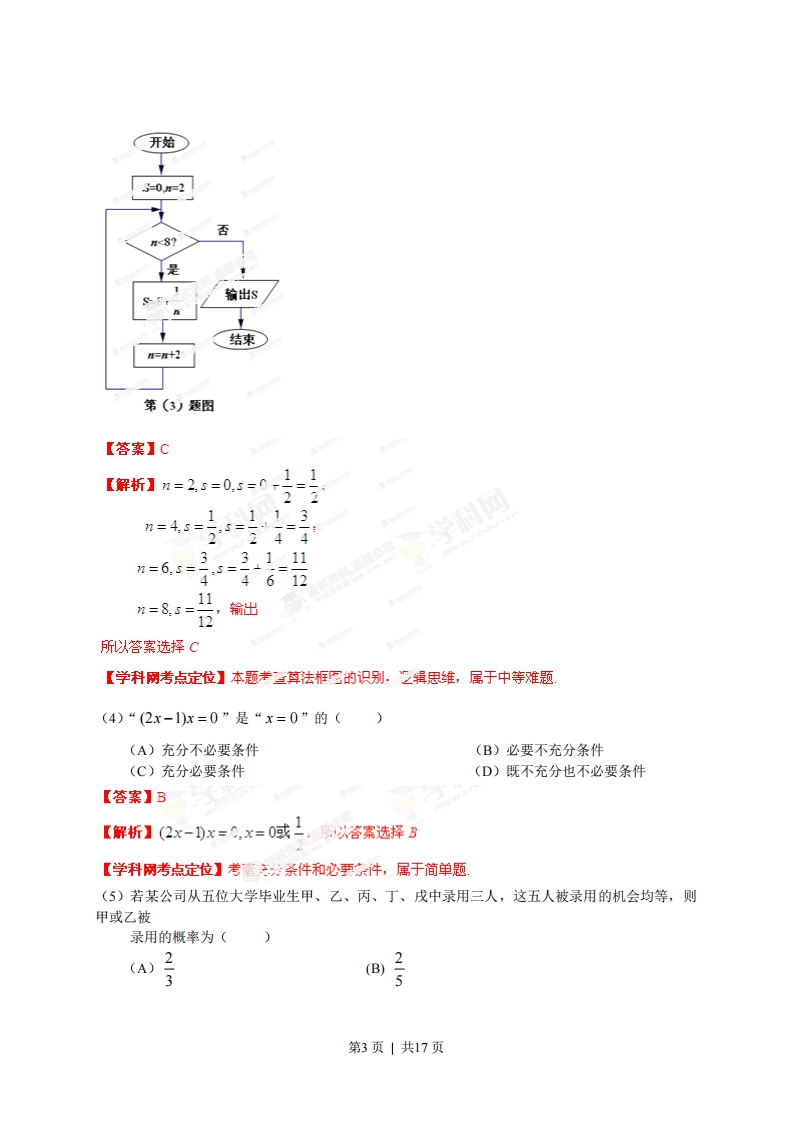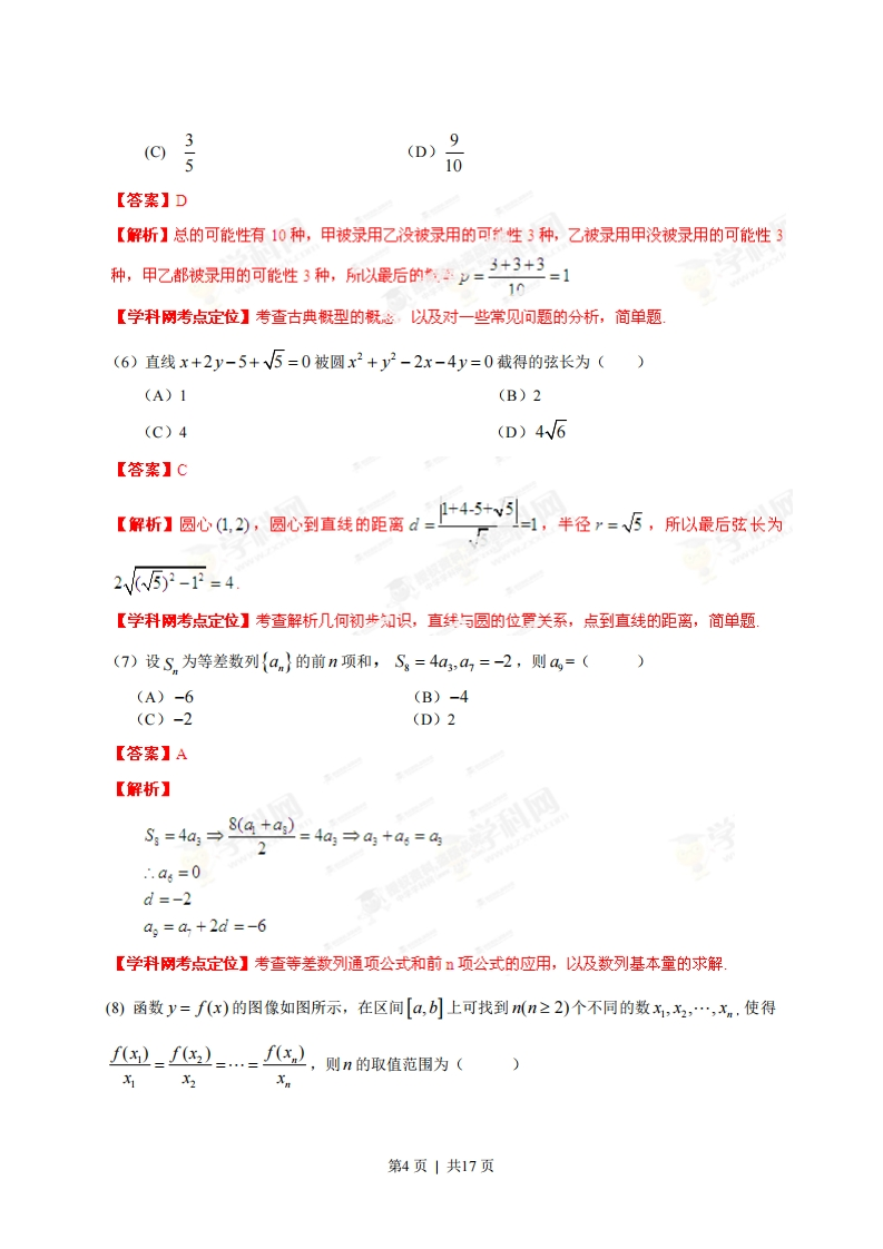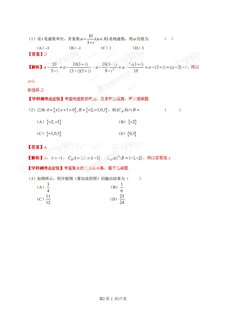 2013年普通高等学校招生仝国统一芳试(安徽卷文科)[学科网试卷总评]2013年安徽文科卷相对于2012年安徽文科卷的难度来说有所加大.从试卷命题特点方面:(1】对主十知识《款、数列.圆锥曲线、立体几何、三角数、慨率统计)的重点考查,尤其是函数,考了四道小题,六题,而且函数小题两道是以压轴题的形式出现;(2)注重能力的考查:一方面在知识函汇处命题,如第19题:另一方面重视对数学能力和思想方法的考查,如计算能力考查〔等9.13.17.题),转化思想的考查(第8,1020题),数形结合的考查(第6,8,10题)等等:(3)注重理论联系实际,如第17题概率统计;(4)注重对创新意识的考查,如第21题.从试卷难度方面:选择填空跟以往的试卷一样从易到难,但在做的过程中不是那么顺畅。第1题考查复数,难度不大;第2题考查集合的交与补以及不等式求法:第3题程序框图,简单;第4题充分必要条件,容易题:第5题古典慨型,只要考生能够理解题意,基本没问题:第6题直线与圆的方程,考查圆中弦长的求法,第7题等差数列基本量的求解,简单,第11题考查函数定义域的求法,简单;第12题常规的线性规划题,雄度不大;第14题,抽象函数解析式的求解,难度中等。选择题第8,9,10题,填空题第13,15题附二加大.宽8题考直s数转化思想以及数形结合,难度很大,考生不一定能想到方法;第9题三角,对下江余弦定型的考查,计算量大:第10题函数零点的考查,难度很大,不容易做好,第13题平面向量,释二积的运算,需要细心:第15题立体几何的截面间题,是考生平时学习中最不容易弄明二.“方。大题第16题三角函数:容易,主要考查恒等变形,三角还数图像变换,考生需注图像变换时语普的描叙,大题第17题概率统计:难度不大,对计算的要求很高,在那种高达环境下必质有个良好心态才能做好;大题第18题立体几何:难度中等,常规性的考查了三棱锥州积的求汁,在选择可点的过程中,需要考生注意看清垂直关系;大题第19题数列:综合性强,将函数求导利用到数列求通项中,只要学生能够细心,拿下这道题还是没有问题的:大题第20题函数:题型新颖,考查考生对新问题冷静处理的能力,对区间长度的准确理解;大题第21题:难度较大,计算量大,点比校多,也容易把考生绕进去,要将这题做好,需要一定的计算基本功。本解析为学科网名师解析团队原创,授权学科网独家使用,如有盗用,依法追责!一.选择题选择题:本大题共10小题。每小题5分,共50分。在每个小题给出的四个选项中,只有一项是符合题目要求的。第1页|共17页(1)设i是虚数单位,若复数a-10(a∈R)是纯虚数,则a的值为()3-i(A)-3(B)-1(C)1(D)3【答案】D【解析】a-10=a-106+D=a-103-=a'3+2=a-3-i(3-03+)9-2=a-(3+)=(a-3)-i,所以10=3,故选择D【学科网考点定位】考查纯虑数的乙,及复共的运算,尼于简单题。(2)己知A={x|x+1>0},B={-2,-1,0,1},则(CRA)∩B=(A){-2,-l}(B){-2(c){-l,0,1}(D){0,y【答案】A【解析】A:x>-1,CsA={