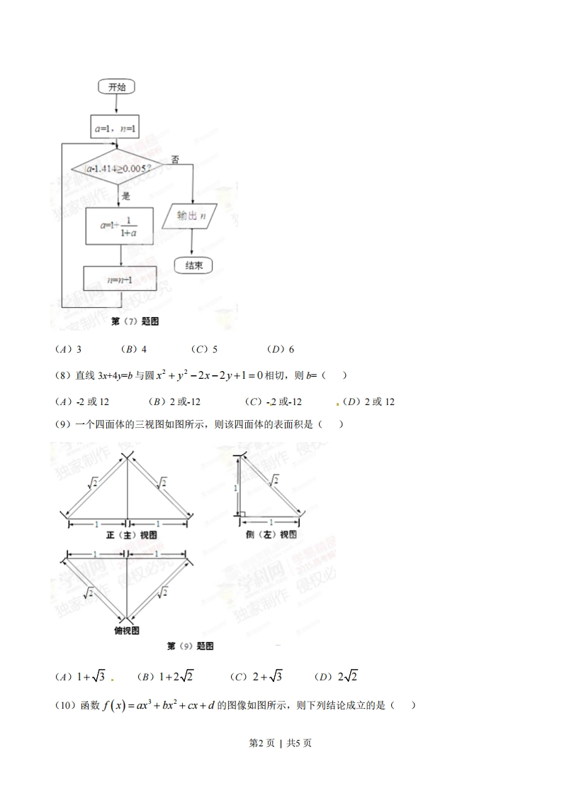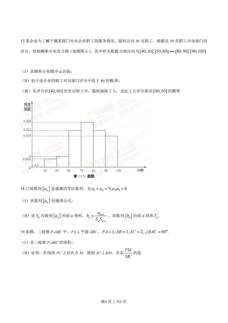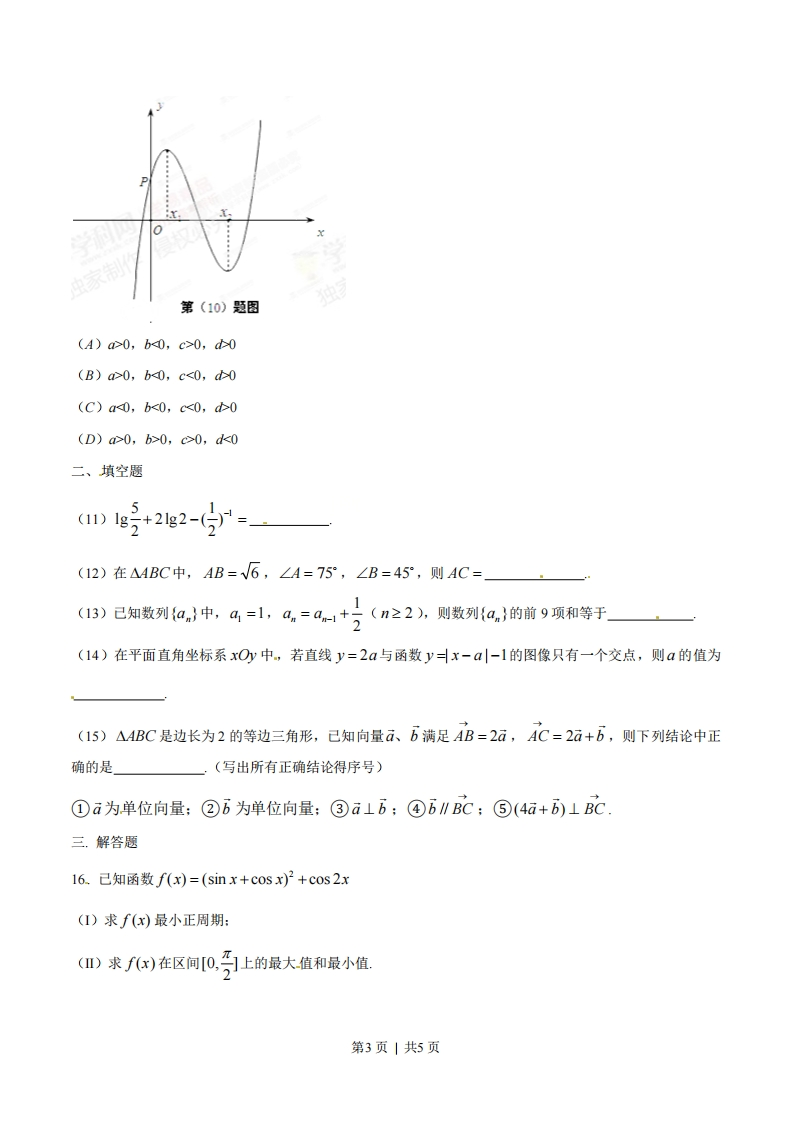 2015年普通高等学校招生全国统一考试(安徽卷)数学(文科)一、选择题(1)设i是虚数单位,则复数(1-i)(1+21)=()(A)3+3i(B)-1+31(3)3+i(D)-1+i(2)设全集U={1,2,3,4,5,6},A={1,2},B={2,3,4},则A∩(CuB)=()(A){1,2,5,6}(B){(C){2}(D){1,2,3,4}(3)设p:x<3,q:10,b<0,c>0,d0(B)a>0,b0,c<0,d0(C)a<0,b<0,c<0,d0(D)a>0,b>0,c>0,dk0二、填空题()+22-(5(12)在△4BC中,AB=√6,∠A=75°,∠B=45°,则AC=1(13)已知数列{an}中,4,=1,an=am-1+。(n≥2),则数列{an}的前9项和等于(14)在平面直角坐标系xOy中,若直线y=2a与函数y=x-a-1的图像只有一个交点,则a的值为(15)△4BC是边长为2的等边三角形,已知向量ā、b满足AB=2ā,AC=2ā+b,则下列结论中正确的是」,(写出所有正确结论得序号)①ā为单位向量:②b为单位向量:③ā⊥b;④b∥BC;⑤(4ā+bLBC三.解答题16.己知函数f(x)=(sinx+cosx)2+cos2x(I)求f(x)最小正周期:()求fx)在区间[0,]上的最大值和最小值,第3页|共5页