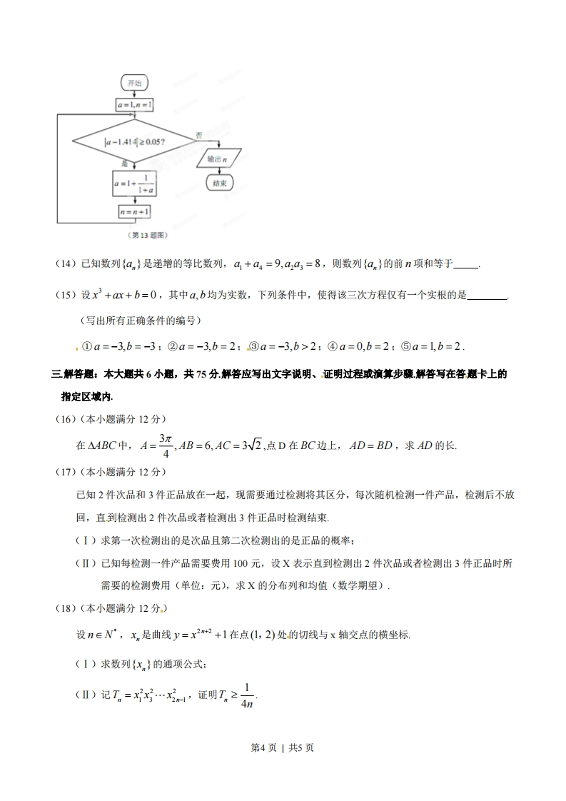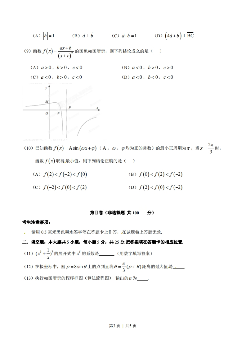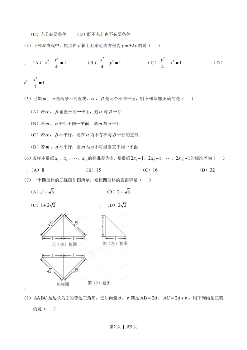 1,则p是q成立的()(A)充分不必要条件(B)必要不充分条件第1页|共5页(C)充分必要条件(D)既不充分也不必要条件(4)下列双曲线中,焦点在y轴上且渐近线方程为y=±2x的是()·(A)x2-=1(B)4s1(c)(D)44-2s1-=14(5)己知m,n是两条不同直线,,B是两个不同平面,则下列命题正确的是()(A)若a,B垂直于同一平面,则a与B平行(B)若m,n平行于同一平面,则m与n平行(C)若α,B不平行,则在:内不存在与B平行的直线(D)若m,n不平行,则m与n不可能垂直于同一平面(6)若样本数据x,x2,,1的标准差为8,则数据2x-1,22-1,…,2xo-1的标准差为().(A)8(B)15(C)16(D)32(7)一个四面体的三视图如图所示,则该四而体的表面积是()(A).1+V5(B)2+V5(C)1+2W2(D)2W2正(主)视图侧(左)视图俯视图第(7)题图(8)△ABC是边长为2的等边三角形,己知向量ā,b满足AB=2a,AC=2ā+b,则下列结论正确的是()第2页|共5页(A)=1(B)a⊥b(c)a.b=1(D)(4a+B)1BC(9)函数f()=+b的图象如图所示,则下列结论成立的是()(x+c)月(A)a>0,b>0,c<0(B)a<0,b>0,c>0(C)a<0,b>0,c<0(D)a<0,b<0,c<0(10)己知函数f(x)=Asin(ox+p)(A,o,p均为正的常数)的最小正周期为π,当x=时·3函数f(x)取得最小值,则下列结论正确的是()(A)f(2)
