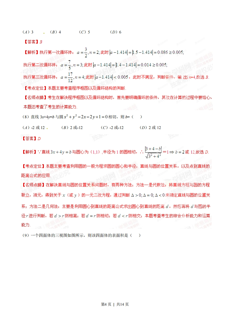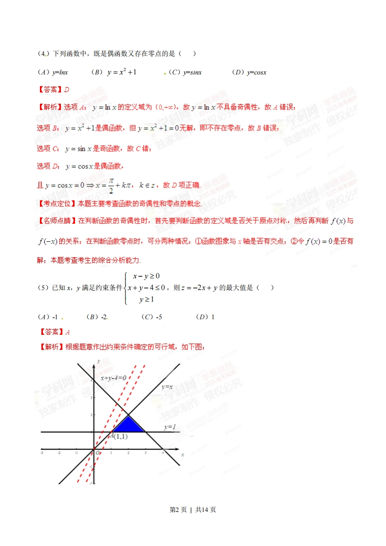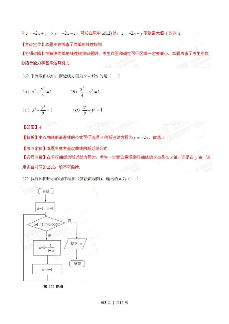 2015年普通高等学校招生全国统一考试(安徽卷)数学(文科)一、选择题(1)设i是虚数单位,则复数(1-i)(1+21)=()(A)3+31(B)-1+3i(3)3+i(D)-1+H【答案】C【解析】因为(1-)1+2)=1+2i-i-22=3+i,故选C【考点定位】本题主要考查复数的乘法运算公式【名师点睛】在应用复数的乘法运算公式时,一定要注意-22的运尊结果,本题很好的考查了考生的基本运算能力(2)设全集U={1,2,3,4,5,6},A={1,2},B={2,3,4},则A∩(CuB)=()(A){1,2,5,6}(B){(c){2)(D){1,2,3,4}【答案】B【解析】,CrB=红,5,6}..n(CB)=选B独家制作【考点定位】本题主要是考查了集合的交集、补集运算【名师点睛】学生在求CB时,切不可遗漏,造成解答错,本题考查了考生的基本运算能力(3)设p:x<3,q:1