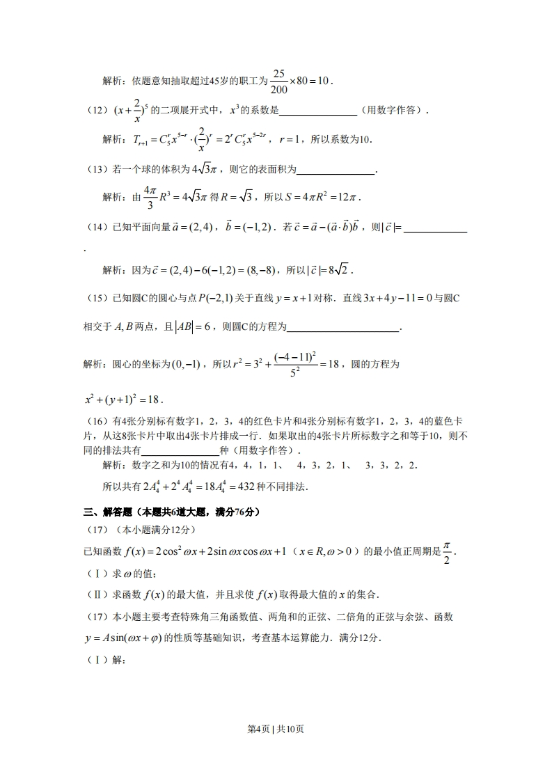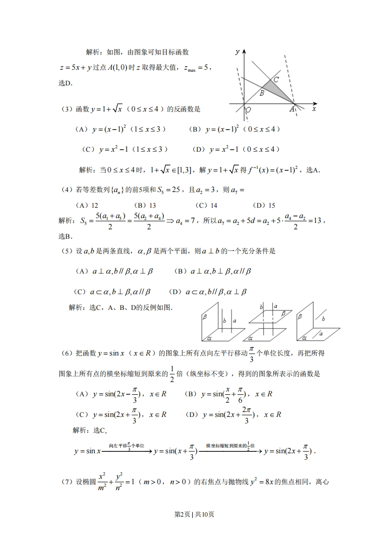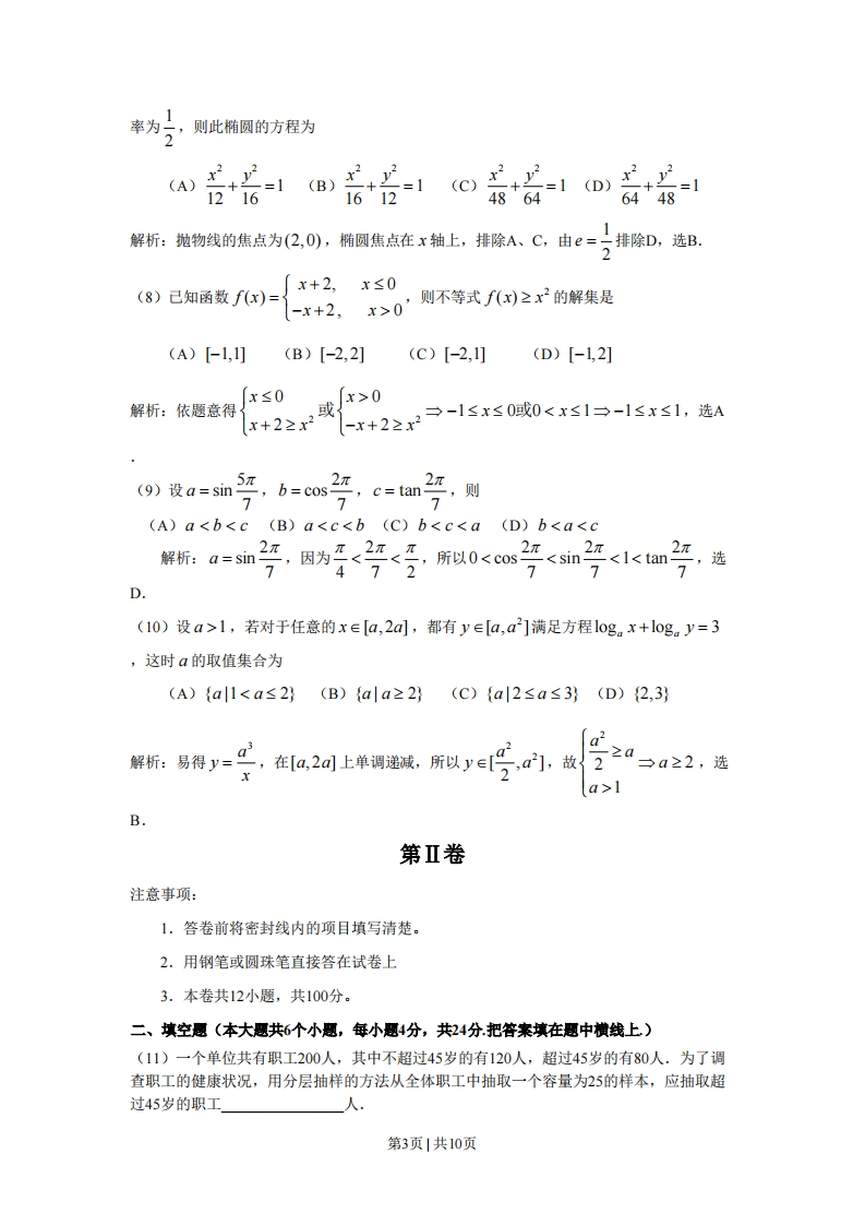 0,n>0)的右盐放与抛物线了广=8:的在点相同,商心第2页|共10页1率为二,则此椭圆的方程为A)+∠=1(B)+1216=16448解析:抛物线的焦点为(2,0),椭圆焦点在x轴上,排除A、C,由e=排除D,选B.x+2,x≤0(8)己知函数f(x)=-x+2,x>01则不等式f(x)≥x2的解集是(A)-1,1](B)[-2,2](c)【-2,1](D)[-1,2]x≤0x>0解析:依题意得x+2≥x2-x+2≥x-1≤r≤0减0号则7.c=tan2(A)a1,若对于任意的x∈[a,2a,都有y∈[a,a]满足方程log。x+log。y=3,这时a的取值集合为(A){al11B.第Ⅱ卷注意事项:1.答卷前将密封线内的项目填写清楚。2.用钢笔或圆珠笔直接答在试卷上3.本卷共12小题,共100分。二、填空愿(本大题共6个小题,每小题4分,共24分.把答案填在题中横线上)(11)一个单位共有职工200人,其中不超过45岁的有120人,超过45岁的有80人.为了调查职工的健康状况,用分层抽样的方法从全体职工中抽取一个容量为25的样本,应抽取超过45岁的职工人第3页1共10页