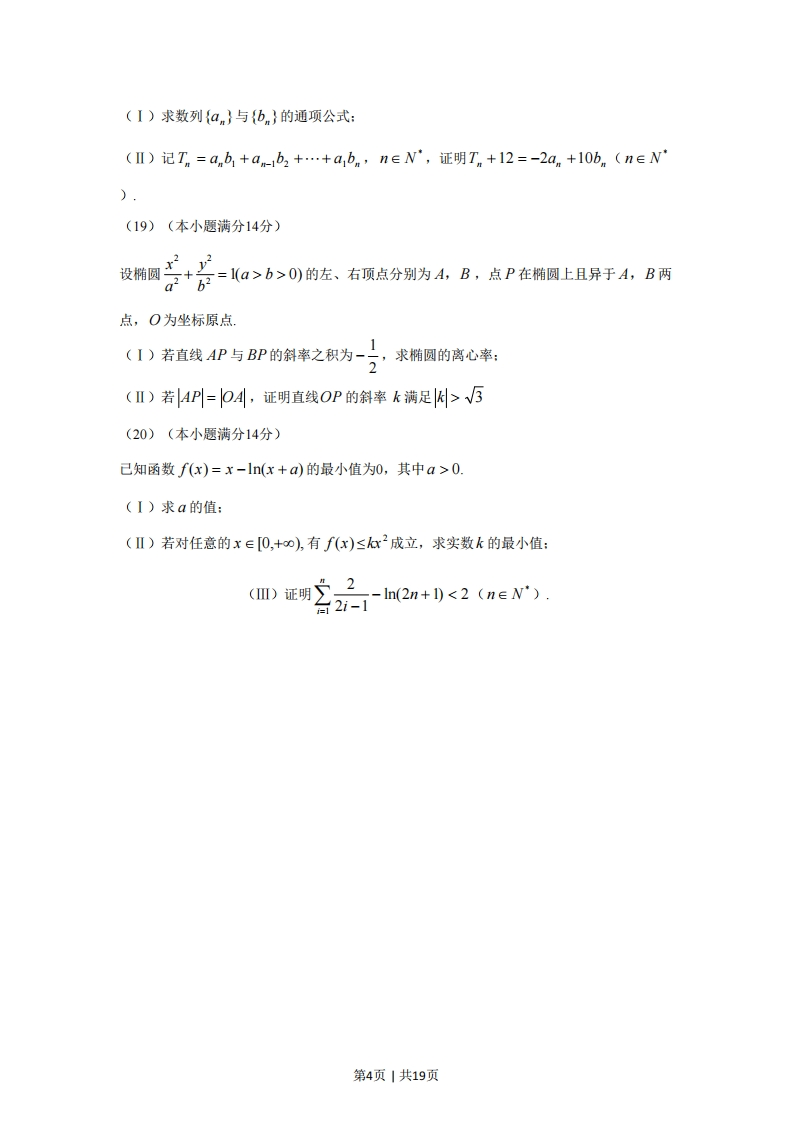 2012年普通高等学校招生统一考试数学天津(理科)一、选择题:在每小题给出的四个选项中,只有一项是符合题目要求的,(1)是虚数单位,复数7-3+i(A)2+i(B)2-i(C)-2+i(D)2-i(2)设p∈R,则“p=0”是“f(x)=c0s(x+p)(x∈R)为偶函数”的开始(A)充分而不必要条件(B)必要而不充分条件输入x(C)充分必要条件(D)既不充分与不必要条件Ixl>1(3)阅读右边的程序框图,运行相应的程序,当输入x的值「是为-25时,输出x的值为x=x-1(A)-1(B)1(C)3(D)9X=2x+1(4)函数f(x)=2+x3-2在区间(0,1)内的零点个数是输出×(A)0(B)1(C)2(D)3结束(5)在(2x2-的二项展开式中,x的系数为(A)10(B)10(C)40(D)40(6)在△4BC中,内角A,B,C所对的边分别是a,b,c,己知8b=5c,C-=2B,则cosC=7(A)7(B)-2525@2(D)25(7)已知△MBC为等边三角形,AB=2,设点P,Q满足AP=元AB,AO=(1-)AC第1页1共19页1eR,若0.C乎=3则1(A)(B)1±V222(C)1±√10(D)-3±2222(8)设m,n∈R,若直线(m+1)x+(n+1)y-2=0与圆(x-1)2+y-1)2=1相切,则m+n的取值范围是(A)1-V5,1+V5](B)(-o,l-V5]U1+V5,+o)(C)[2-2V2,2+2W2](D)(-o,2-2V2]U[2+2V2,+0)第Ⅱ卷二、填空题:本大题共6小题,每小题5分,共30分.(9)某地区有小学150所,中学75所,大学25所.现采用分层抽样的方法从这些学校中抽取30所学校对学生进行视力调查,应从小学中抽取所学校,中学中抽取所学校,正视图(10)一个几何体的三视图如图所示(单位:m),则该几何体的体积为m3仿祝空(11)已知集合A=K∈R+2<3,集合B={x∈R|(x-m)(x-2)<0},且A∩B=(-1,n),则m=,n=(12)己知抛物线的参数方程为x=2pt,(为参数),其中p>0,焦点为,准线为1y=2pt过抛物线上一点M作I的垂线,垂足为E.若EFMFI,点M的横坐标是3,则p=(13)如图,己知AB和AC是圆的两条弦,过点B作圆的切线与AC的延长线相交于点D.过点C作BD的平行线与圆相交于点E,与AB相交于点F,AF=3,PB=1,EF=3,则线段CD的长为第2页|共19页x2-1(14)己知函数y=的图象与函数y=k红-2的图象恰有两个交点,则实数k的取x-1值范围是三.解答题:本大题共6小题共0分.解答应写出文字说明,证明过程或演算步漂(15)(本小题满分13分)己知函数fx)=sin(2x+T)+sin(2x-T)+2cos2x-1,x∈R3(I)求函数f(x)的最小正周期:()求函数)在区同-子孕上的最大值和最小位(16)(本小题满分13分)现有4个人去参加某娱乐活动,该活动有甲、乙两个游戏可供参加者选择为增加趣味性,约定:每个人通过掷一枚质地均匀的骰子决定自己去参加哪个游戏,掷出点数为1或2的人去参加甲游戏,掷出点数大于2的人去参加乙游戏。(I)求这4个人中恰有2人去参加甲游戏的概率:(Ⅱ)求这4个人中去参加甲游戏的人数大于去参加乙游戏的人数的概率:(Ⅲ)用X,Y分别表示这4个人中去参加甲、乙游戏的人数,记5=X-Y,,求随机变量5的分布列与数学期望E5(17)(本小题满分13分)如图,在四棱锥PABCD中,PA⊥平面ABCD,AC⊥AD,AB⊥BC,∠BAC=45°,PA=AD=2,AC=1.(I)证明PC⊥AD:⊙(Ⅱ)求二面角A-PC-D的正弦值:(Ⅲ)设E为棱PA上的点,满足异面直线BE与CD所成的角为30°,求AE的长(18)(本小题满分13分)己知{a,}是等差数列,其前n项和为Sn,{bn}是等比数列,且a1=b=2,a4+b4=27,S4-b4=10第3页|共19页