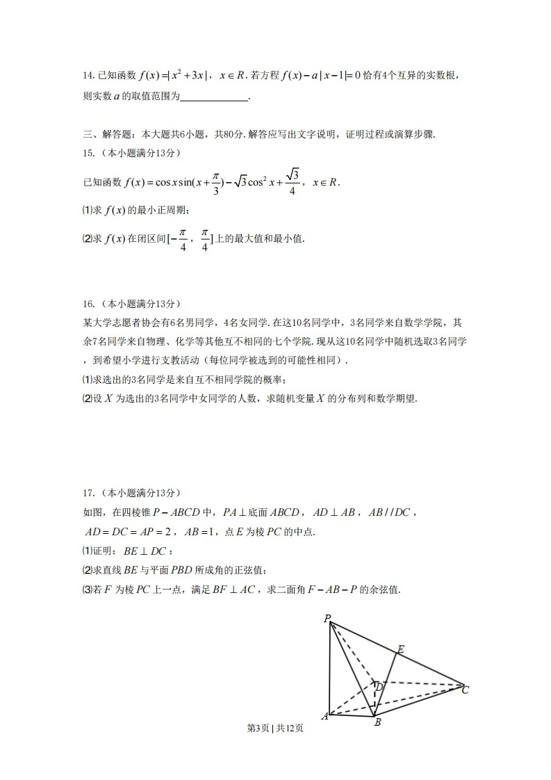 2014年普通高等学校招生全国统一考试(天津卷)理科数学本试卷分第I卷(选择题)和第Ⅱ卷(非选择题)两部分,共150分,考试用时120分钟。第I卷1至2页,第Ⅱ卷3至5页。第I卷一、选择题(本大题共8小题,每小题5分,共40分)在每小题给出的四个选项中,只有一项是符合题目要求的.1.i是虚数单位,复数7+13+4i17,31A.1-iB.-1+iC.17.252525D.-7+7x+y-2≥02.设变量x、y满足约束条件x-y-2≤0,则目标函数z=x+2y的最小值为y21A.2B.3C.4D.53.阅读下边的程序框图,运行相应的程序,输出S的值为结束输出S开始=1T=2i+1S=S×Ti=i+1A.15B.105C.245D.9454.函数f(x)=log1(x2-4)的单调递增区间为A.(0,+0)B.(-0,0)C.(2,+o)D.(-0,-2)吧知双曲线子--Q>0,6>0)的一条新近线平行于直线:J=2x+10,双曲线的一个焦点在直线1上,则双曲线的方程为A-=1y2=1520205C.3x23y2=1D.3x23y2=12510010025第1页1共12页6.如图,△4BC是圆的内接三角形,∠BAC的平分线交圆于点D,交BC于点E,过点B的圆的切线与AD的延长线交于点F,在上述条件下,给出下列四个结论:①BD平分∠CBF:②FB2=FD·FA:③AE·CE=BE·DE:④AF,BD=AB·BF.则所有正确结论的序号是A.①②B.③④C.①②③D.①②④7.设a、b∈R,则“a>b”是“aa>b|b|”的A.充分不必要条件B.必要不充分条件C.充要条件D.既不充分也不必要条件8.己知菱形ABCD的边长为2,∠BAD=120°,点E、F分别在边BC、DC上,B6=BC,DF=uDC若示=1,C正.示=-号,则+u27B.c.D.3612第卷二、填空题:本大题共6小题,每小题5分,共30分9.某大学为了解在校本科生对参加某项社会实践活动的意向,拟采用分层抽样的方法,从该校四个年级的本科生中抽取一个容量为300的样本进行调查.己知该校一年级、二年级、三年级、四年级的本科生人数之比为4:5:5:6,则应从一年级本科生中抽取名学生。10.一个几何体的三视图如图所示(单位:m),则该几何正视图创视图体的体积为m.11.设{a}是首项为a,公差为-1的等差数列,Sn为其前n项和,若S、S2、S,成等比数列,则a的值为12.在△ABC中,内角A、B、C所对的边分别是a、b、俯视图1c.已知b-c=二a,2sinB=3sinC,则cosA的值为413.在以O为极点的极坐标系中,圆p=4sin0和直线psin0=a相交于A、B两点.若△AOB是等边三角形,则a的值为第2页1共12页14.己知函数f(x)x2+3x|,x∈R.若方程f(x)-a|x-1=0恰有4个互异的实数根,则实数a的取值范围为三、解答题:本大题共6小题,共80分.解答应写出文字说明,证明过程或演算步骤。15.(本小题满分13分)已知函数f)=cossin((x+受-V5cos'x+,x∈R.34(1求f(x)的最小正周期:2求f)在闭区间[-产,上的最大值和最小值.4’416.(本小题满分13分)某大学志愿者协会有6名男同学,4名女同学.在这10名同学中,3名同学来自数学学院,其余7名同学来自物理、化学等其他互不相同的七个学院.现从这10名同学中随机选取3名同学,到希望小学进行支教活动(每位同学被选到的可能性相同),(1)求选出的3名同学是来自互不相同学院的概率:(2设X为选出的3名同学中女同学的人数,求随机变量X的分布列和数学期望,17.(本小题满分13分)如图,在四棱锥P-ABCD中,PA⊥底面ABCD,AD⊥AB,AB/IDC,AD=DC=AP=2,AB=1,点E为棱PC的中点.(1)证明:BE⊥DC:2求直线BE与平面PBD所成角的正弦值:(3若F为棱PC上一点,满足BF⊥AC,求二面角F-AB-P的余弦值.P第3页1共12页