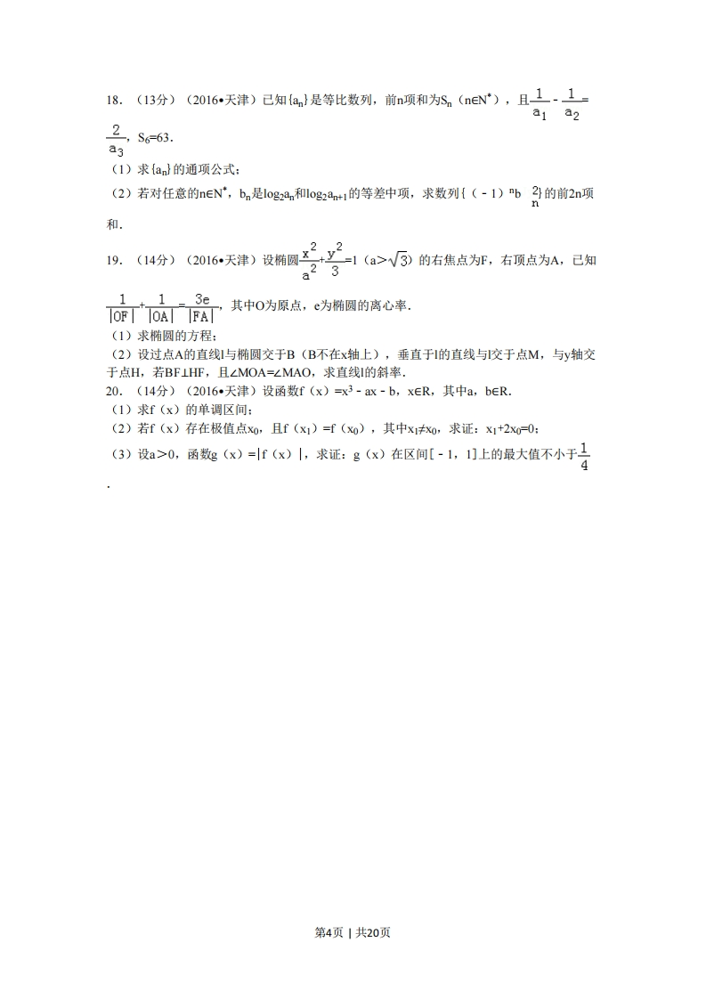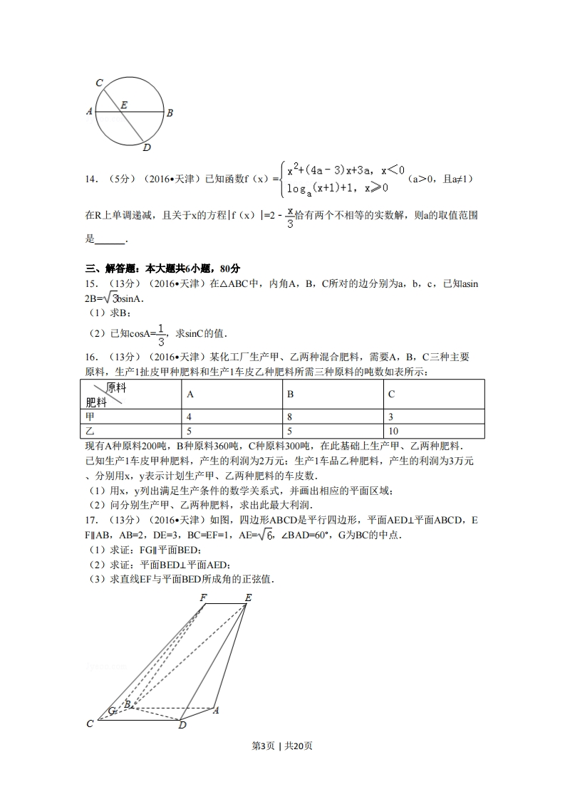 2016年天津市高考数学试卷(文科)一、选择题:在每小题给出的四个选项中,只有一项是符合要求的1.(5分)(2016天津)已知集合A={1,2,3},B={y|y=2x-1,x∈A},则AnB=()A.{1,3}B.{1,2}C.{2,3}D.{1,2,3}2.(5分)(2016•天津)甲、乙两人下棋,两人下成和棋的概率是二,甲获胜的概率是1,则甲不输的概率为()A吾B号c吉D号3.(5分)(2016·天津)将一个长方体沿相邻三个面的对角线截去一个棱锥,得到的几何体的正视图与俯视图如图所示,则该几何体的侧(左)视图为()正视图俯视图AB24.(5分)(2016天津)已知双曲线×-y=1(a>0,b>0)的焦距为2√5,且双曲a2 b2线的一条渐近线与直线2x+y=0垂直,则双曲线的方程为()2y21A.B.x2-y-14c.3x2.3y2205D.323y25205.(5分)(2016天津)设x>0,yER,则“x>y是“x>y|"的()A.充要条件B.充分不必要条件C.必要而不充分条件D.既不充分也不必要条件第1页|共20页6.(5分)(2016天津)己知f(x)是定义在R上的偶函数,且在区间(-∞,0)上单调递增,若实数a满足f(2-)>f(-√2),则a的取值范围是()A(分B.(,贵u侵)C合受D侵)27.(5分)(2016天津)已知△ABC是边长为1的等边三角形,点D、E分别是边AB、BC的中点,连接DE并延长到点F,使得DE=2EF,则AFBC的值为()A语B言c}D贵888.(5分)(2016天津)已知函数f(x)=sin20x+1inwx-1(w>0),XER,若f(x22)在区间(π,2元)内没有零点,则ω的取值范围是()A0,寻B.0,u唱1》C0,D.0,言u哈8二、填空题本大题6小题,每题5分,共30分9.(5分)(2016·天津)i是虚数单位,复数z满足(1+i)z=2,则z的实部为10.(5分)(2016天津)己知函数f(x)=(2x+1)ex,P(x)为f(x)的导函数,则F(0)的值为11.(5分)(2016•天津)阅读如图所示的程序框图,运行相应的程序,则输出S的值为开始S=4=1否S26?S=2S是S=S-6n=n+1n>32香是输出S结束12.(5分)(2016天津)己知圆C的圆心在x轴正半轴上,点(0,√5)圆C上,且圆心到直线2x~y0的距离为45,则圆C的方程为13.(5分)(2016天津)如图,AB是圆的直径,弦CD与AB相交于点E,BE=2AE=2,BD=ED,则线段CE的长为第2页|共20页Ex2+(4a-3)x+3a,x<014.(5分)(2016·天津)己知函数f(x)(a>0,且a时1)10g2(x+1)+1,x>0在R上单调递减,且关于x的方程If(x)|=2-恰有两个不相等的实数解,则a的取值范围3是三、解答题:本大题共6小题,80分15.(13分)(2016天津)在△ABC中,内角A,B,C所对的边分别为a,b,c,己知asin2B=V3bsinA.(1)求B:(2)已知cosA=1求sinC的值,16.(13分)(2016天津)某化工厂生产甲、乙两种混合肥料,需要A,B,C三种主要原料,生产1扯皮甲种肥料和生产1车皮乙种肥料所需三种原料的吨数如表所示:原料AB肥料甲43乙5510现有A种原料200吨,B种原料360吨,C种原料300吨,在此基础上生产甲、乙两种肥料.己知生产1车皮甲种肥料,产生的利润为2万元:生产1车品乙种肥料,产生的利润为3万元、分别用x,y表示计划生产甲、乙两种肥料的车皮数.(1)用x,y列出满足生产条件的数学关系式,并画出相应的平面区域:(2)问分别生产甲、乙两种肥料,求出此最大利润.17.(13分)(2016·天津)如图,四边形ABCD是平行四边形,平面AEDL平面ABCD,EFlAB,AB=2,DE=3,BC=EF=1,AE=V6,∠BAD=60°,G为BC的中点.(1)求证:FG平面BED:(2)求证:平面BEDL平面AED:(3)求直线EF与平面BED所成角的正弦值.D第3页1共20页