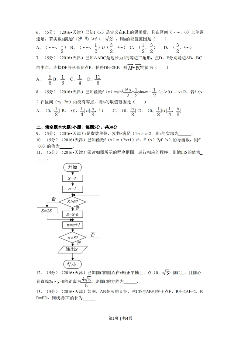 2016年天津市高考数学试卷(文科)一、选择题:在每小题给出的四个选项中,只有一项是符合要求的1.(5分)(2016天津)已知集合A={1,2,3},B={y|y=2x-1,x∈A},则AnB=()A.{1,3}B.{1,2}C.{2,3}D.{1,2,3}2.(5分)(2016•天津)甲、乙两人下棋,两人下成和棋的概率是二,甲获胜的概率是1,则甲不输的概率为()A吾B号c吉D号3.(5分)(2016·天津)将一个长方体沿相邻三个面的对角线截去一个棱锥,得到的几何体的正视图与俯视图如图所示,则该几何体的侧(左)视图为()正视图俯视图A.B24.(5分)(2016天津)已知双曲线×-y=1(a>0,b>0)的焦距为2√5,且双曲a2 b2线的一条渐近线与直线2x+y=0垂直,则双曲线的方程为()2y21A.B.x2.y-=14c.3x2.3y2205D.3x2.3y2=15205.(5分)(2016天津)设x>0,yER,则“x>y是“x>y|"的()A.充要条件B.充分不必要条件C.必要而不充分条件D.既不充分也不必要条件第1页1共4页6.(5分)(2016天津)己知f(x)是定义在R上的偶函数,且在区间(-∞,0)上单调递增,若实数a满足f(2-)>f(-√2),则a的取值范围是()A(分B.(,贵u侵)C合受D侵)27.(5分)(2016天津)已知△ABC是边长为1的等边三角形,点D、E分别是边AB、BC的中点,连接DE并延长到点F,使得DE=2EF,则AFBC的值为()A语B言C}D贵888.(5分)(2016天津)已知函数f(x)=sin20x+1inwx-1(w>0),XER,若f(x22)在区间(π,2元)内没有零点,则ω的取值范围是()A0,寻B.0,u唱1》C0,D.0,言u哈8二、填空题本大题6小题,每题5分,共30分9.(5分)(2016·天津)i是虚数单位,复数z满足(1+i)z=2,则z的实部为10.(5分)(2016天津)己知函数f(x)=(2x+1)ex,P(x)为f(x)的导函数,则F(0)的值为11.(5分)(2016•天津)阅读如图所示的程序框图,运行相应的程序,则输出S的值为开始S=4=1否S26?S=2S是S=S-6n=n+1n>32香是输出S结束12.(5分)(2016天津)己知圆C的圆心在x轴正半轴上,点(0,√5)圆C上,且圆心到直线2x~y0的距离为45,则圆C的方程为513.(5分)(2016天津)如图,AB是圆的直径,弦CD与AB相交于点E,BE=2AE=2,BD=ED,则线段CE的长为第2页1共4页CEx2+(4a-3)x+3a,x<014.(5分)(2016·天津)己知函数f(x)(a>0,且a时1)10g2(x+1)+1,x>0在R上单调递减,且关于x的方程If(x)|=2-恰有两个不相等的实数解,则a的取值范围3是三、解答题:本大题共6小题,80分15.(13分)(2016天津)在△ABC中,内角A,B,C所对的边分别为a,b,c,己知asin2B=V3bsinA.(1)求B:(2)已知cosA=1求sinC的值,16.(13分)(2016天津)某化工厂生产甲、乙两种混合肥料,需要A,B,C三种主要原料,生产1扯皮甲种肥料和生产1车皮乙种肥料所需三种原料的吨数如表所示:原料AB肥料甲43乙5510现有A种原料200吨,B种原料360吨,C种原料300吨,在此基础上生产甲、乙两种肥料.己知生产1车皮甲种肥料,产生的利润为2万元:生产1车品乙种肥料,产生的利润为3万元、分别用x,y表示计划生产甲、乙两种肥料的车皮数.(1)用x,y列出满足生产条件的数学关系式,并画出相应的平面区域:(2)问分别生产甲、乙两种肥料,求出此最大利润.17.(13分)(2016·天津)如图,四边形ABCD是平行四边形,平面AEDL平面ABCD,EFlAB,AB=2,DE=3,BC=EF=1,AE=V6,∠BAD=60°,G为BC的中点.(1)求证:FGI平面BED:(2)求证:平面BEDL平面AED:(3)求直线EF与平面BED所成角的正弦值.D第3页1共4页