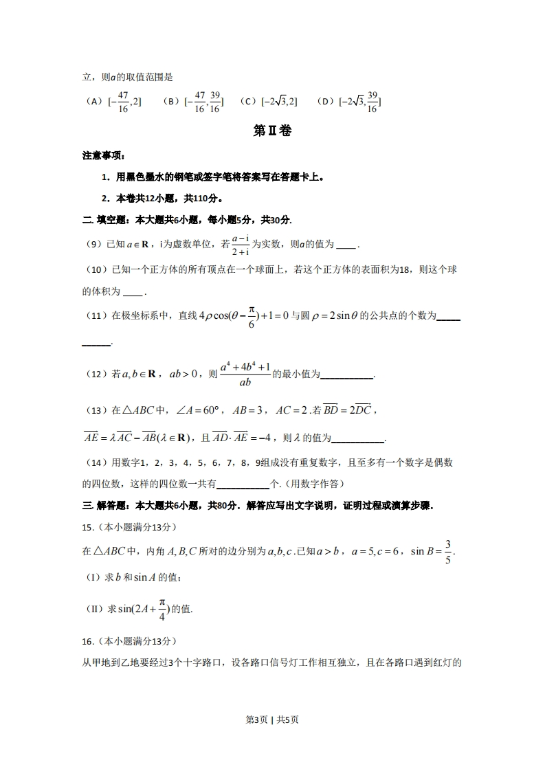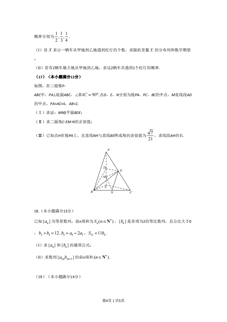 2017年普通高等学校招生全国统一考试天津数学(理工类)本试卷分为第I卷(选择题)和第Ⅱ卷(非选择题)两部分,共150分,考试用时120分钟。第I卷1至2页,第Ⅱ卷3至5页。答卷前,考生务必将自己的姓名、准考证号填写在答题考上,并在规定位置粘贴考试用条形码。答卷时,考生务必将答案涂写在答题卡上,答在试卷上的无效。考试结束后,将本试卷和答题卡一并交回。祝各位考生考试顺利!第I卷注煮事项:1每小题选出答案后,用铅笔将答题卡上对应题目的答案标号涂黑。如需改动,用橡皮擦干净后,再选涂其他答案标号。2.本卷共8小题,每小题5分,共40分。参考公式:如果事件A,B互斥,那么如果事件A,B相互独立,那么P(AUB)=P(A)+P(B).P(AB)=P(A)P(B).·棱柱的体积公式V=Sh.球的体积公式V=3πR其中S表示棱柱的底面面积,其中R表示球的半径.h表示棱柱的高.一、选择题:在年小题给出的四个选项中,只有一项是符合题目要求的,(1)设集合A=1,2,6},B={2,4},C={x∈R|-1≤x≤5,则(AUB)∩C=(A){2}(B){1,2,4}(C){1,2,4,6}(D){x∈R|-1≤x≤5}2x+y≥0,x+2y-220,(2)设变量x,y满足约束条件则目标函数z=x+y的最大值为x≤0,y≤3,3(A)(D)33(B)1(c)2第1页1共5页(3)阅读右面的程序框图,运行相应的程序,若输入N的值为24,则输出N的值为开始○输入N0,b>0)的左焦点为F,离心率为反若经过F和P(0,4)两点的直线平行于双曲线的一条渐近线,则双曲线的方程为(A)=1(®)21c-二=1o)-上=144884884(6)己知奇函数fx)在R上是增函数,g(x)=xf(x).若a=g(-log25.),b=g(2),c=g(3),则a,b,c的大小关系为(A)a0,1ok若/受=2,告=0,且f(x)的最小正周期大于2π,则(A)0=’ps3’9s、x(8)o=1(c)o=(D)12122417π0=30=24[x2-x+3,x≤1(8)己知函数f(x)=x+2x>1设aeR,若关于x的不等式fx)25+al在R上恒成第2页1共5页立,则a的取值范围是w名(B)[-47391616(c)[-2W5,2]第Ⅱ卷注意事项:1,用黑色量水的钢笔或签字笔将答案写在答题卡上。2,本卷共12小题,共110分。二填空题:本大题共6小题,每小题5分,共30分.(9)已知a∈R,为虚数单位,若二为实数,则a的值为一2+i(10)己知一个正方体的所有顶点在一个球面上,若这个正方体的表面积为18,则这个球的体积为(11)在极坐标系中,直线4pc0(0-)+1=0与圆p=2sin0的公共点的个数为一6(12)若a.beR,ab>0,则。+46+l的最小值为ab(13)在△ABC中,∠A=60°,AB=3,AC=2.若BD=2DC,AE=元AC-AB(∈R),且AD.AE=-4,则1的值为(14)用数字1,2,3,4,5,6,7,8,9组成没有重复数字,且至多有一个数字是偶数的四位数,这样的四位数一共有个.(用数字作答)三解答愿:本大愿共6小题,共80分.解答应写出文字说明,证明过程或演算步骤.15.(本小题满分13分)在△4BC中,内角4,B,C所对的边分别为a,bc.已知a>b,a=5c=6,sinB=31(I)求b和sinA的值:()求sin(2A+)的值416.(本小题满分13分)从甲地到乙地要经过3个十字路口,设各路口信号灯工作相互独立,且在各路口遇到红灯的第3页1共5页