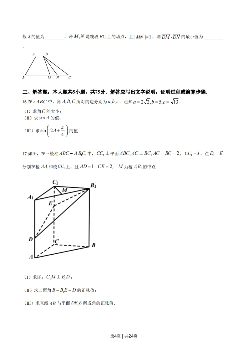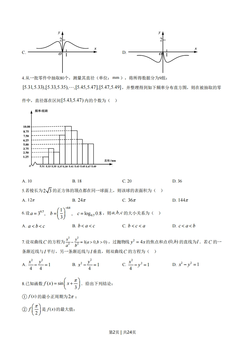 绝密★启用前2020年普通高等学校招生全国统一考试(天津卷)数学本试卷分为第1卷(选择题)和第卷(非选择题)两部分,共150分,考试用时120分钟。第I卷1至3页,第卷4至6页.答卷前,考生务必将自已的姓名、考生号、考场号和座位号填写在答题卡上,并在规定位置粘贴考试用条形码。答卷时,考生务必将答案涂写在答题卡上,答在试卷上的无效。考试结束后,将本试卷和答题卡一并交回。祝各位考生考试顺利!第卷注意事项:1,每小题选出答案后,用铅笔将答题卡上对应题目的答案标号涂黑。如需改动,用橡皮擦干净后,再选涂其他答案标号。2.本卷共9小题,每小题5分,共45分.参考公式:如果事件A与事件B互斥,那么P(AUB)=P(A)+P(B).如果事件A与事件B相互独立,那么P(AB)=P(A)P(B).球的表面积公式S=4πR2,其中R表示球的半径,一、选释题:在每小题给出的四个选项中,只有一项是符合题目要求的,1.设全集U={-3,-2,-1,0,1,2,3},集合A={-1,0,1,2},B={-3,0,2,3},则A∩(B)=()A.{-3,3}B.{0,2}c.{-1,D.{-3,-2,-1,1,3}2.设a∈R,则“a>1”是“a2>a”的()A.充分不必要条件B.必要不充分条件C.充要条件D.既不充分也不必要条件4x3.函数y=x2+1的图象大致为()第1页|共24页4.从一批零件中抽取80个,测量其直径(单位:mm),将所得数据分为9组:[5.31,5.33),[5.33,5.35),,[5.45,5.47,[5.47,5.49],并整理得到如下频率分布直方图,则在被抽取的零件中,直径落在区间[5.43,5.47)内的个数为()人類率/组距10.008.757.506.255.003752.501.25直径/mm5315.335355.375395415.43545547549A.10B.18C.20D.365.若棱长为2√3的正方体的顶点都在同一球面上,则该球的表面积为()A.12元B.24元C.36πD.144π-086.设a=30.7c=l0go,0.8,则a,b,c的大小关系为()A.a0,b>0),过抛物线=4的焦点和点(0,b)的直线为1.若C的条渐近线与1平行,另一条渐近线与1垂直,则双曲线C的方程为()A.22=1B.x2-=1D.x2-y2=14444-y2=18.己知函数f(x)=sinx+-给出下列结论:①f(x)的最小正周期为2π:②f是f(x)的最大值:第2页|共24页③把函数y=sinx的图象上所有点向左平移个单位长度,可得到函数y=fx)的图象.3其中所有正确结论的序号是A.①B.①③c.②③D.①②③9.己知函数f(x)=-X,无0若函数g()=fx)-k2-2(化∈R)恰有4个零点,则k的取值范围x<0.是()A(U25.+B.(--2JU(0.2)C.(-0,0U0,2W2)D.(-0,0)U(2√2,+0)绝密★启用前2020年普通高等学校招生全国统一考试(天津卷)数学第卷注意事项:1.用黑色墨水的钢笔或签字笔将答案写在答题卡上.2,本卷共11小题,共105分.二、填空题:本大题共6小题,每小题5分,共30分。试题中包含两个空的,答对1个的给3分,全部答对的给5分10.i是虚数单位,复数8-i2+i11.在x+的展开式中,x2的系数是」12.己知直线x-√3y+8=0和圆x2+y2=2(r>0)相交于A,B两点.若|AB=6,则r的值为13.已知甲、乙两球落入盒子的概率分别为2和了假定两球是否落入盒子互不影响,则甲、乙两球都落入盒子的概率为:甲、乙两球至少有一个落入盒子的概率为14已知a>0,b>0,且ab=1,则+是+82a 2b a+b的最小值为15如图,在闪边形ABCD中,∠B=60,B=3,C=6,且而=C,而而=-子则实第3页|共24页