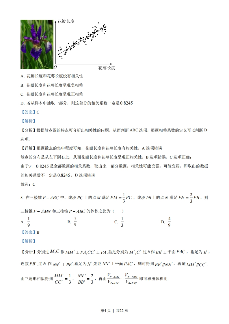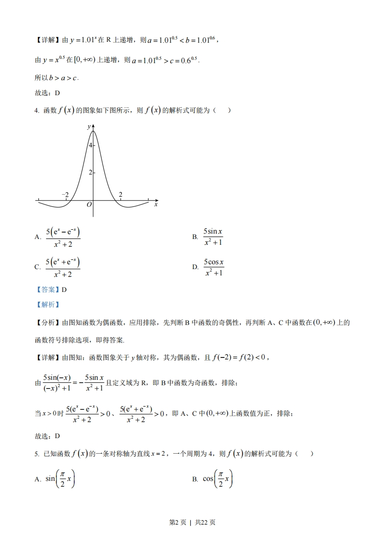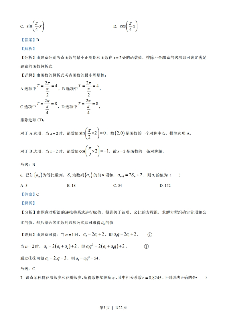 2023年普通高等学校招生全国统一考试(天津卷)数学一、选释题(在每小题给出的四个选项中,只有一项是符合题目要求的)1已知集合0=L2,345A=13B=12,4号,则ABUA=()A.{1,3,5}B.{1,3}C.{1,2,4}D.{12,4,5}【答案】A【解析】【分析】对集合B求补集,应用集合的并运算求结果:【详解】由AB={3,5},而A={1,3},所以aBUA={L,3,5}故选:A2.“a2=b2”是“a2+b2=2ab"的()A.充分不必要条件B.必要不充分条件C.充分必要条件D.既不充分又不必要条件【答案】B【解析】【分析】根据充分、必要性定义判断条件的推出关系,即可得答案【详解】由a2=b2,则a=±b,当a=-b≠0时a2+b2=2ab不成立,充分性不成立:由a2+b2=2ab,则(a-b)2=0,即a=b,显然a2=b2成立,必要性成立:所以a2=b2是ad2+b2=2ab的必要不充分条件.故选:B3.若a=1.015,b=1.010.6,c=0.65,则a,b,c的大小关系为()A.c>a>bB.c>b>aC.axb>cD.b>a>c【答案】D【解析】【分析】根据对应幂、指数函数的单调性判断大小关系即可.第1页|共22页【详解】由y=1.01'在R上递增,则a=1.015c=0.645所以b>a>c.故选:D4.函数f(x)的图象如下图所示,则f(x)的解析式可能为()25(e-e)5sinxB.x2+2x2+1c.5(e'+e-)5cosxD.x2+2x2+1【答案】D【解析】【分析】由图知函数为偶函数,应用排除,先判断B中函数的奇偶性,再判断A、C中函数在(O,+0)上的函数符号排除选项,即得答案【详解】由图知:函数图象关于y轴对称,其为偶函数,且f(-2)=f(2)<0,由5sin-)=_5sinx(-x)2+1x2+1且定义域为R,即B中函数为奇函数,排除:当x>0时5e-e>0、x2+2e+e>0,即A、C中(0,+0)上函数值为正,排除:x2+2故选:D5.己知函数f(x)的一条对称轴为直线x=2,一个周期为4,则f(x)的解析式可能为()Bcos第2页|共22页cn任D.com【答案】B【解析】【分析】由题意分别考查函数的最小正周期和函数在x=2处的函数值,排除不合题意的选项即可确定满足题意的函数解析式【详解】由函数的解析式考查函数的最小周期性:A选项中T-2π2π=4T=1-=4π,B选项中π2T=2π8TC选项中π,D选项中28π4排除选项CD,对于A选项,当x=2时,函数值Sin=0,故(2,0)是函数的一个对称中心,排除选项A,对于B选项,当x=2时,函数值C0SS×2=-1,故x=2是函数的一条对称轴,故选:B6.已知{an}为等比数列,Sn为数列{an}的前n项和,a1=2Sn+2,则a的值为()A.3B.18C.54D.152【答案】C【解析】【分析】由题意对所给的递推关系式进行赋值,得到关于首项、公比的方程组,求解方程组确定首项和公比的值,然后结合等比数列通项公式即可求得a的值【详解】由题意可得:当n=1时,a2=2a1+2,即a,9=2a1+2,①当n=2时,a3=2(a1+a2)+2,即a9=2(a1+a9)+2,②联立①②可得41=2,q=3,则a4=a,g=54.故选:C7.调查某种群花萼长度和花瓣长度,所得数据如图所示,其中相关系数r=0.8245,下列说法正确的是()第3页|共22页