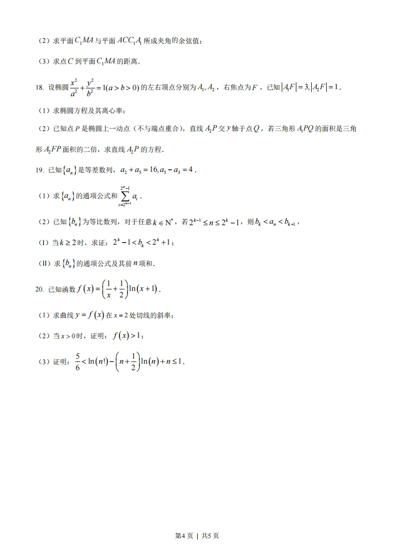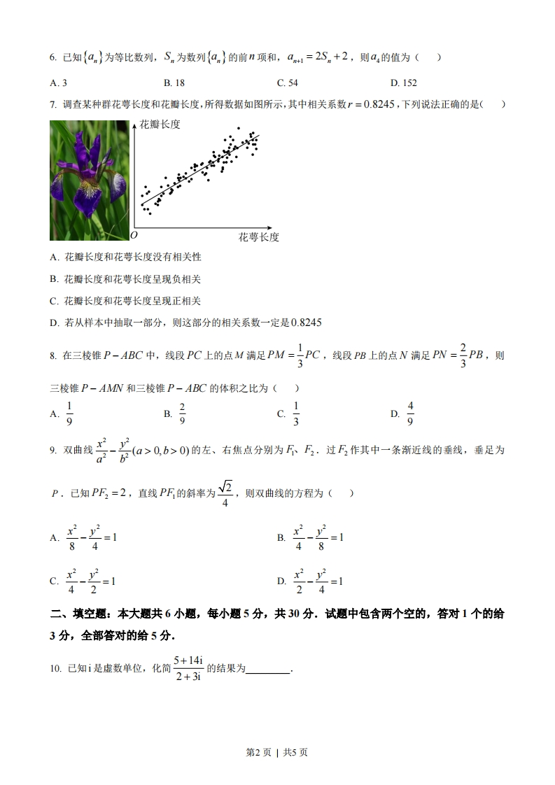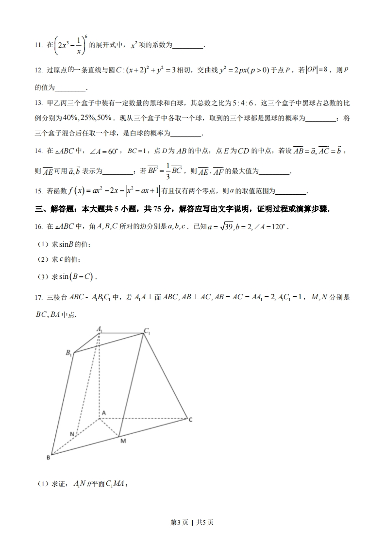 2023年普通高等学校招生全国统一考试(天津卷)数学一、选释题(在每小题给出的四个选项中,只有一项是符合题目要求的)1已知集合0=L2,345A=13B=12,4号,则ABUA=()A.{1,3,5}B.{1,3}C.{1,2,4}D.{1,2,4,5}2.“a2=b2”是“a2+b2=2ab”的()A.充分不必要条件B.必要不充分条件C.充分必要条件D.既不充分又不必要条件3.若a=1.01°5,b=1.01.6,c=0.65,则a,b,c的大小关系为()A.c>a>bB.c>b>aC a>b>cD.b>a>c4.函数f(x)的图象如下图所示,则f(x)的解析式可能为()2A5e-e)B.5sinxx2+2x2+1c.5e+e))D.5cosxx2+2x2+15.已知函数f(x)的一条对称轴为直线x=2,一个周期为4,则f(x)的解析式可能为()Bocsm任D.cw第1页|共5页6.己知{an}为等比数列,Sn为数列{an}的前n项和,a+1=2Sn+2,则a,的值为()A.3B.18C.54D.1527.调查某种群花萼长度和花瓣长度,所得数据如图所示,其中相关系数r=0.8245,下列说法正确的是()花瓣长度二花萼长度A.花瓣长度和花萼长度没有相关性B.花瓣长度和花萼长度呈现负相关C.花瓣长度和花萼长度呈现正相关D.若从样本中抽取一部分,则这部分的相关系数一定是0.8245&.在三棱锥P-ABC中,线段PC上的点M满足PM=PC,线段PB上的点N满足PN=PB,则2三棱锥P-AMN和三棱锥P-ABC的体积之比为()B.21C.309双曲线-广a>0b>0)的左、右焦点分别为个、乃,过乃作其中一条渐近线的垂线,垂足a2-P.已知P5=2,直线P5的斜率为则双曲线的方程为()4A.=1B.xy8448C.二、填空题:本大题共6小题,每小题5分,共30分.试题中包含两个空的,答对1个的给3分,全部答对的给5分.5+14i10.已知i是虚数单位,化简的结果为2+3i第2页|共5页1.在2-的展开式中,x2项的系数为12.过原点的一条直线与圆C:(x+2)2+y2=3相切,交曲线y2=2px(p>0)于点P,若OP=8,则P的值为13.甲乙丙三个盒子中装有一定数量的黑球和白球,其总数之比为5:4:6.这三个盒子中黑球占总数的比例分别为40%,25%,50%.现从三个盒子中各取一个球,取到的三个球都是黑球的概率为:将三个盒子混合后任取一个球,是白球的概率为14.在△ABC中,∠A=60°,BC=1,点D为AB的中点,点E为CD的中点,若设AB=a,AC=b,则花可用ā,6表示为一:若BF=}BC,则正A正的最大值为315.若函数f(x)=2-2x-x2-ar+有且仅有两个零点,则a的取值范围为三、解答题:本大题共5小题,共75分,解答应写出文字说明,证明过程或演算步骤16.在△ABC中,角A,B,C所对的边分别是a,b,c.己知a=√39,b=2,∠A=120°.(1)求sinB的值:(2)求C的值:(3)求sin(B-C)17.三棱台ABC-AB,C中,若A,A⊥面ABC,AB⊥AC,AB=AC=A4,=2,AC1=1,M,N分别是BC,BA中点ANM(1)求证:A,N∥平面C,MA:第3页|共5页