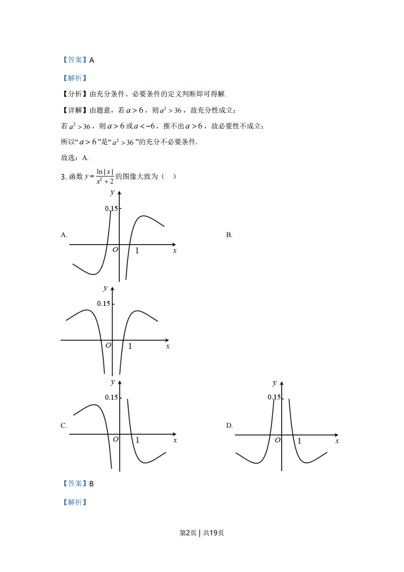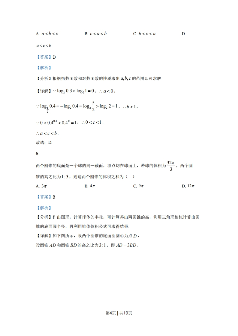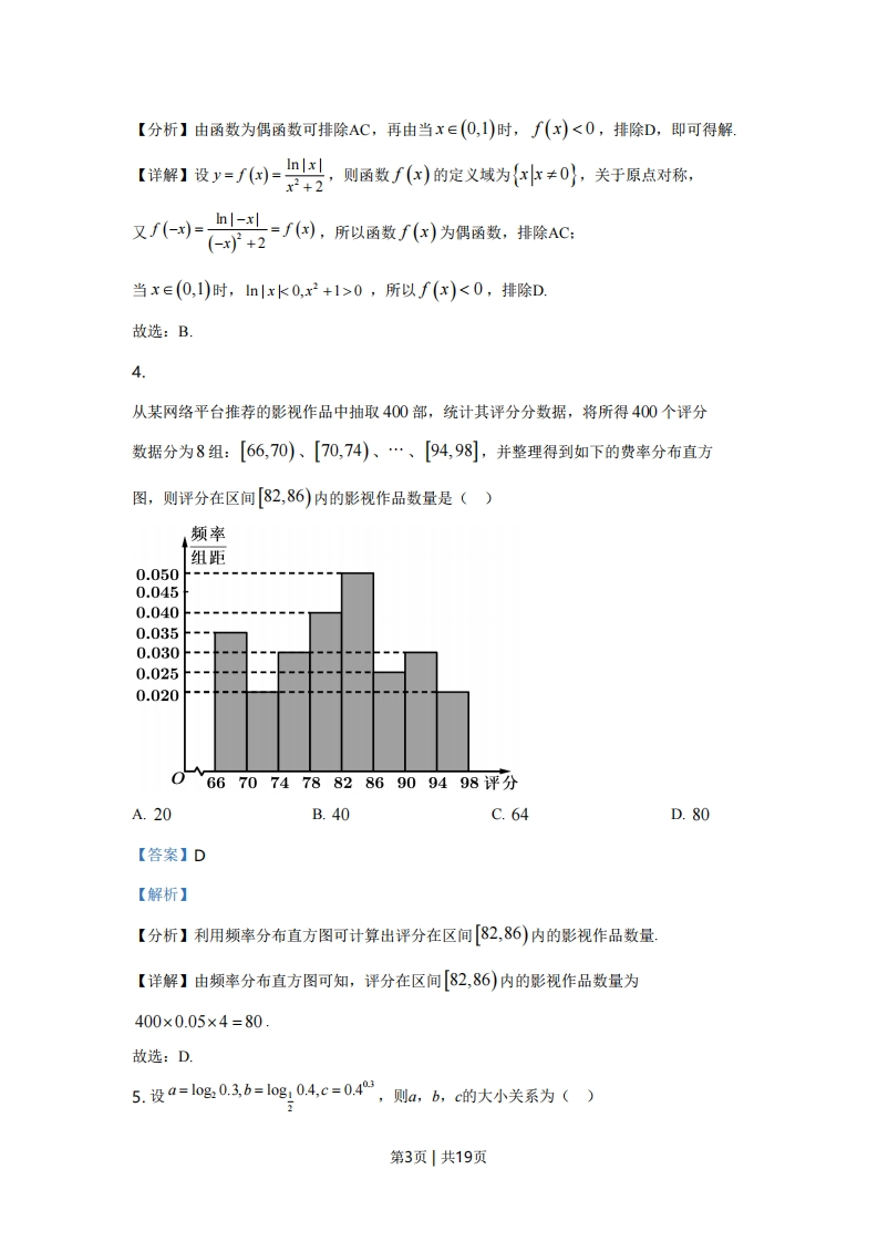 2021年普通高等学校招生全国统一考试(天津卷)数学第卷注意事项:1.每小题选出答案后,用铅笔将答题卡上对应题目的答案标号涂黑,如需改动,用橡皮擦干净后,再选涂其他答案标号,2,本卷共9小题,每小题5分,共45分参考公式:如果事件A、B互斥,那么P(AUB)=P(A)+P(B).·如果事件A、B相互独立,那么P(AB)=P(4A)P(B).·球的体积公式/一写,其中R表示球的半径。,圆锥的体积公式V=。Sh,其中S表示圆锥的底面面积,表示圆锥的高。一、选择题,在每小题给出的四个选项中,只有一项是符合题目要求的.1.设集合A={-1,0,1},B={1,3,5},C={0,2,4},则(A∩B)C=()A.(0)B.{0,1,3,5}C.{0,1,2,4}D{0,2,3,4}【答案】C【解析】【分析】根据交集并集的定义即可求出【详解】A={-1,0,1},B={1,3,5},C={0,2,4},.AnB={1},∴.(AnB)UC={0,1,2,4}故选:C2.己知a∈R,则“a>6”是“a2>36”的()A.充分不必要条件B.必要不充分条件C.充要条件D.既不允分也不必要条件第1页|共19页【答案】A【解析】【分析】由充分条件、必要条件的定义判断即可得解.【详解】由题意,若a>6,则a2>36,故充分性成立:若a2>36,则a>6或a<-6,推不出a>6,故必要性不成立:所以“a>6”是“a2>36”的充分不必要条件.故选:A3.函数y=号的图像大致为()xX2+20.15B0.150.15【答案】B【解析】第2页|共19页【分析】由函数为偶函数可排除AC,再由当x∈(O,1)时,f(x)<0,排除D,即可得解【详解】设y=句)=,则函数f)的定义域为{x≠0,关于原点对称,Γx2+2又了仁)==),所以函数f)为偶函数,排除AC:(-x)2+2当x∈(0,1)时,lnxk0,x2+1>0,所以f(x)<0,排除D.故选:B.4.从某网络平台推荐的影视作品中抽取400部,统计其评分分数据,将所得400个评分数据分为8组:[66,70)、[70,74)、…、[94,98],并整理得到如下的费率分布直方图,则评分在区间[82,86)内的影视作品数量是()4频率组距0.0500.0450.0400.0350.0300.0250.020667074788286909498评分A.20B.40C.64D.80【答案】D【解析】【分析】利用频率分布直方图可计算出评分在区间[82,86)内的影视作品数量【详解】由频率分布直方图可知,评分在区间82,86)内的影视作品数量为400×0.05×4=80故选:D5.设a=1o0.3,b=log:0.4,c=04,则a,b,c的大小关系为()第3页|共19页