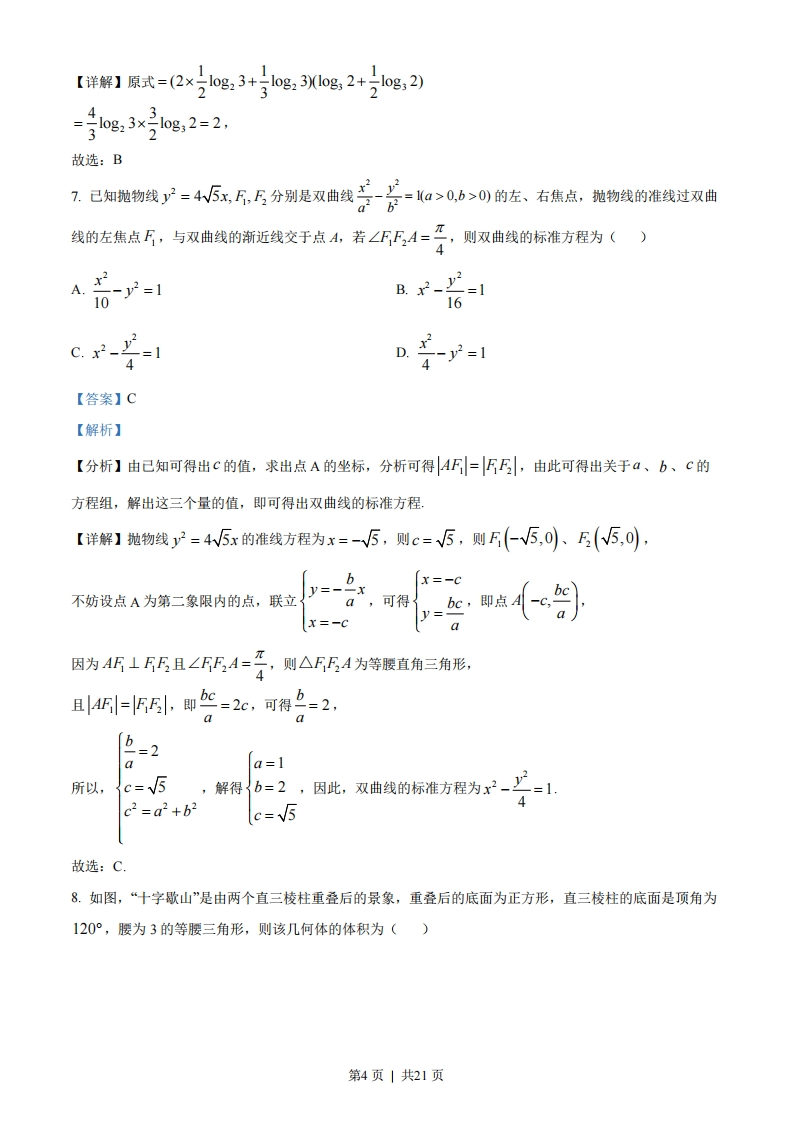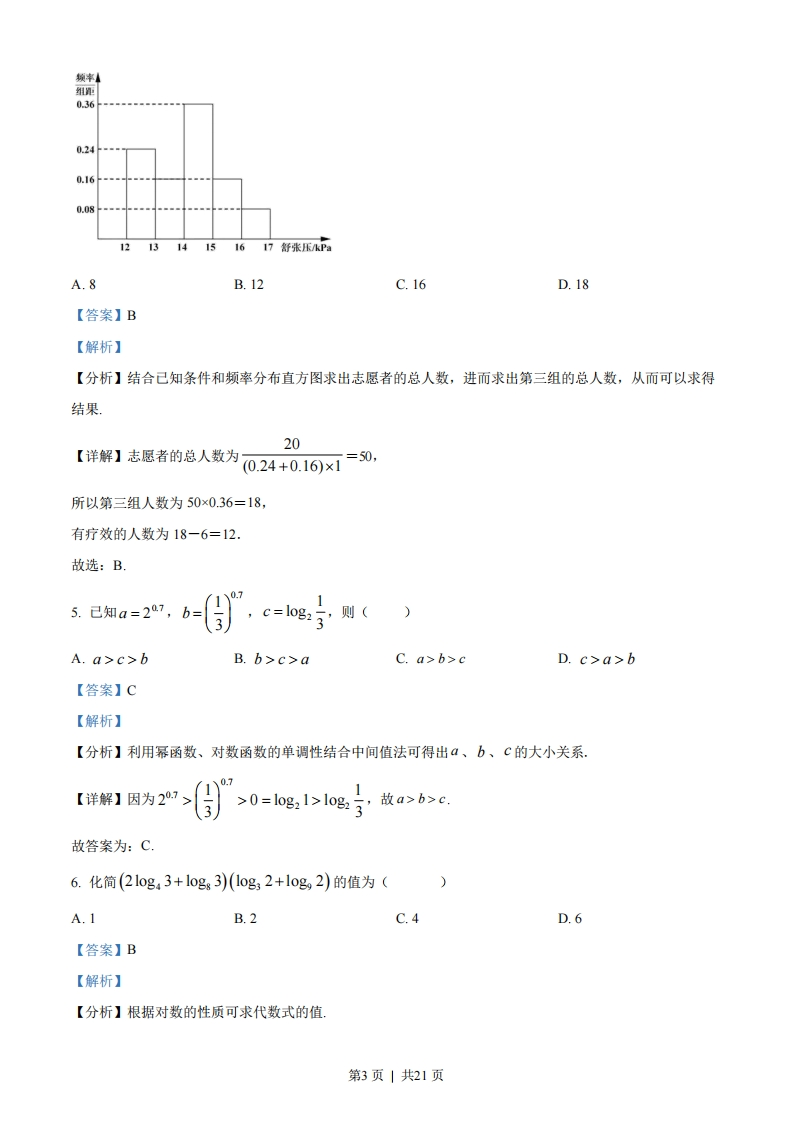 2022年普通高等学校招生全国统一考试数学(天津卷)2022.06.一、选择题:本题共9小题,每小题5分,共45分.在每小题给出的四个选项中,只有一项是符合题目要求的1.设全集U={-2,-1,0,1,2},集合A={01,2,B{-1,2},则A∩(⑨B)=()A.{0,1B.{0,l,2c.{-1,1,2}D.{0,-1,12}【答案】A【解析】【分析】先求出AB,再根据交集的定义可求A∩(©B)【详解】AB={-2,0,1},故An(aB)={0,1故选:A2.“x为整数”是“2x+1为整数的()A.充分不必要B.必要不充分C.充分必要D.既不允分也不必要【答案】A【解析】【分析】依据充分不必要条件的定义去判定“x为整数”与“2x+1为整数”的逻辑关系即可.【详解】由题意,若x为整数,则2x+1为整数,故充分性成立:当x=。时,2x+1为整数,但x不为整数,故必要性不成立:所以“x为整数”是“2x+1为整数”的充分不必要条件.故选:A3函数f)-广-的图像为()第1页|共21页【答案】D【解析】【分析】分析函数∫(x)的定义域、奇偶性、单调性及其在(-∞,O)上的函数值符号,结合排除法可得出合适的选项!【详解1高数了付-上-的定义技为中+0。---函数∫(x)为奇函数,A选项错误:又当x<0时,了付-上-≤0,c造项错误当x1时了付)-F-产二--上质数华调港带,故B选项错误:故选:D4.为研究某药品的疗效,选取若干名志愿者进行临床试验,所有志愿者的舒张压数据(单位:kP)的分组区间为[12,13),13,14),14,15),[15,16),16,17刀,将其按从左到右的顺序分别编号为第一组,第二组,,第五组,右图是根据试验数据制成的频率分布直方图.己知第一组与第二组共有20人,第三组中没有疗效的有6人,则第三组中有疗效的人数为()第2页|共21页频率组距0360.240.160.08121314151617舒张压PA.8B.12C.16D.18【答案】B【解析】【分析】结合己知条件和频率分布直方图求出志愿者的总人数,进而求出第三组的总人数,从而可以求得结果20【详解】志愿者的总人数(0.24+0.16)×7=50,所以第三组人数为50×0.36=18,有疗效的人数为18一6=12.故选:B0.715.己知a=2a7b=c=log:3则()A.a>c>bB.b>c>aC.a>b>cD.c>a>b【答案】C【解析】【分析】利用幂函数、对数函数的单调性结合中间值法可得出、b、C的大小关系.0.7【详解】因为2.73>0=1og21>log23故a>b>c.故答案为:C6.化简(21og43+1ogs3)(1og32+1og2)的值为(A.1B.2C.4D.6【答案】B【解析】【分析】根据对数的性质可求代数式的值,第3页|共21页