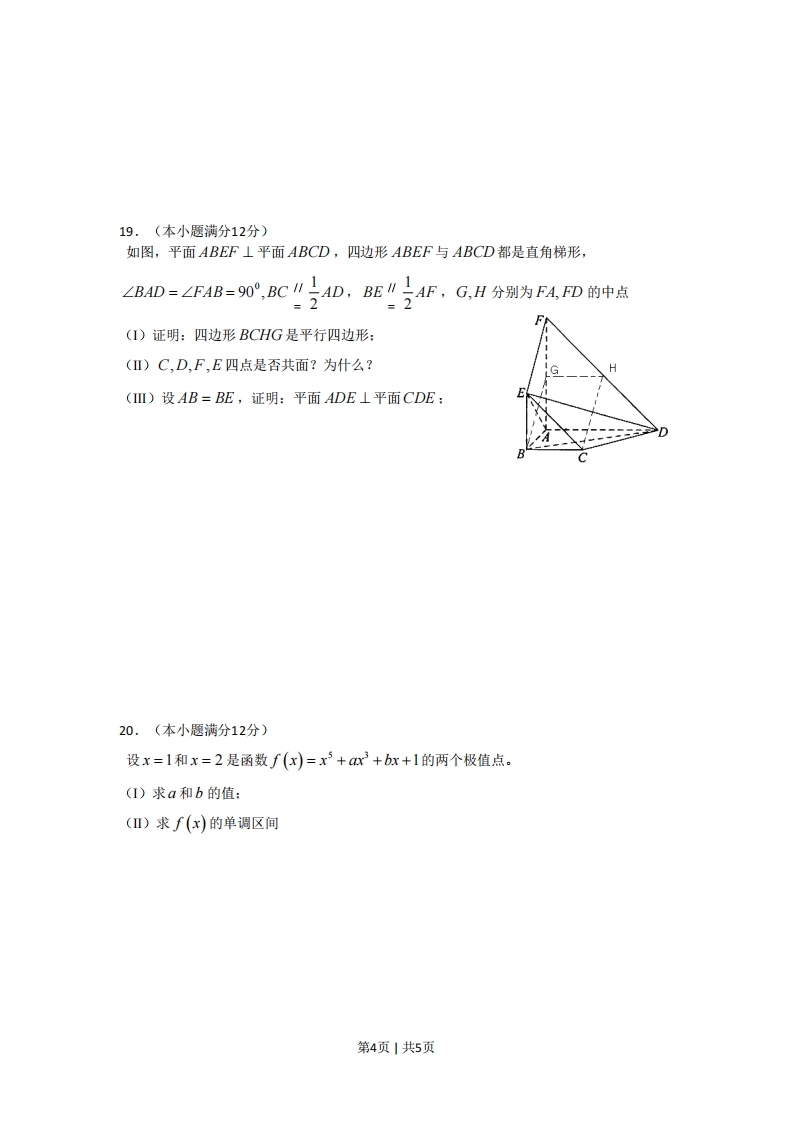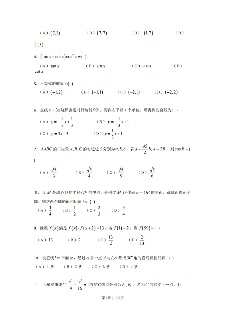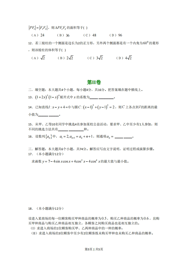 2008年普通高等学校招生全国统一考试(四川卷)数学(文科)及参考答案本试卷分第I卷(选择题)和第Ⅱ卷(非选择题)两部分,第I卷第1至第2页,第Ⅱ卷第3至第4页。全卷满分150分,考试时间120分钟。考生注意事项:1.答题前,务必在试题卷、答题卡规定的地方填写自己的座位号、姓名,并认真核对答题卡上所粘贴的条形码中“座位号、姓名、科类”与本人座位号、姓名、科类是否一致。2.答第I卷时,每小题选出答案后,用2B铅笔把答题卡上对应题目的答案标号涂黑。如需改动、用橡皮擦干净后,再选涂其他答案标号。3.答第Ⅱ卷时,必须用0.5毫米黑色墨水签字笔在答题卡上书写。在试题卷上作答无效。4.考试结束,监考员将试题卷和答题卡一并收回。参考公式:如果事件A、B互斥,那么球的表面积公式P(A+B)=P(4)+P(B)S=4πR2如果事件A、B相互独立,那么其中R表示球的半径P(4-B)=P(4)P(B)球的体积公式如果事件A在一次实验中发生的概率是p,那么V-4IR3n次独立重复实验中事件A恰好发生k次的概率其中R表示球的半径Pn(k)=Cp*(1-p)-,(k=0,l,2,…,n)第卷一.选择题:1.设集合U={1,2,3,4,5},A={1,2,3},B={2,3,4},则a(A∩B)=()(A){2,3}(B)1,4,5(c){4,5}(D){1,5}2.函数y=h(2x+x>的反函数是()】(A)=9-keR(B)y=e2x-l(x∈R)(c)y-i(e-1)(xeR)(D)y=e2-l(x∈R)3.设平面向量a=(3,5),b=(-2,1),则a-2b=()第1页1共5页(A)(7,3)(B)(7,7)(c)(1,7)(D(1,3)4.(tanx+cotx)cos2x=()(A)tanx(B)sinx(C)cosx(D)cotx5.不等式的解集为)(A)(-1,2)(B)-1,1)(c)(-2,1)(D)(-2,2)6.直线y=3x绕原点逆时针旋转90°,再向右平移1个单位,所得到的直线为()111(A)y=3x+3(B)y=--x+131(C)y=3x-3(D)y=3+17A1BC的三内角4,BC的对边边长分别为a,6c,若a=5,A=2B,则cosB=(25(A)5(B)(c)(D)468,设M是球心O的半径OP的中点,分别过M,O作垂直于OP的平面,截球面得两个圆,则这两个圆的面积比值为:()(A)(c)3(D)49.函数f(x)满足f(x)f(x+2)=13,若f()=2,则f(99)=()2(A)13(B)2(C)132(D)10.设直线1c平面a,经过外一点A与1,α都成30°角的直线有且只有:()(A)1条(B)2条(C)3条(D)4条1.已知双曲线C:。-二=1的左右焦点分别为F,5,P为C的右支上一点,且916第2页1共5页PF=FF,则△PFE的面积等于()(A)24(B)36(C)48(D)9612.若三棱柱的一个侧面是边长为2的正方形,另外两个侧面都是有一个内角为60°的菱形,则该棱柱的体积等于()(A)V2(B)2V2(C)3W2(D)4V2第Ⅱ卷二.填空题:本大题共4个小题,每小题4分,共16分。把答案填在题中横线上。13.(1+2x)(1-x)展开式中x的系数为14.已知直线1:x-y+4=0与圆C:(x-1)2+(y-1)2=2,则C上各点到1的距离的最小值为15.从甲、乙等10名同学中挑选4名参加某校公益活动,要求甲、乙中至少有1人参加,则不同的挑选方法共有种。16.设数列{an}中,41=2,a+1=an+n+1,则通项am=一三.解答题:本大题共6个小题,共74分。解答应写出文字说明,证明过程或演算步骤。17.(本小题满分12分)求函数y=7-4 sin xc0sx+4c0s2x-4c0sx的最大值与最小值.18.(本小题满分12分)设进入某商场的每一位顾客购买甲种商品的概率为0.5,购买乙种商品的概率为0.6,且购买甲种商品与购买乙种商品相互独立,各顾客之间购买商品也是相互独立的。()求进入商场的1位顾客购买甲、乙两种商品中的一种的概率:(Ⅱ)求进入商场的3位顾客中至少有2位顾客既未购买甲种也未购买乙种商品的概率。第3页1共5页