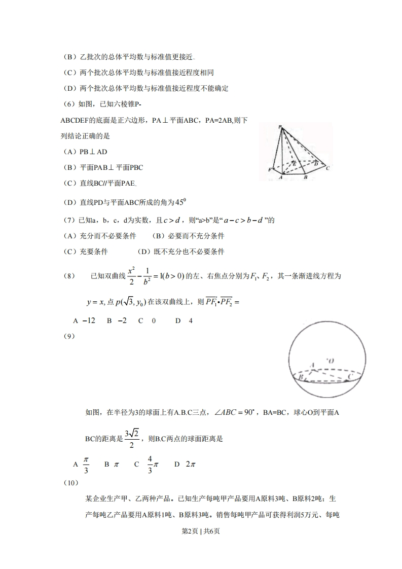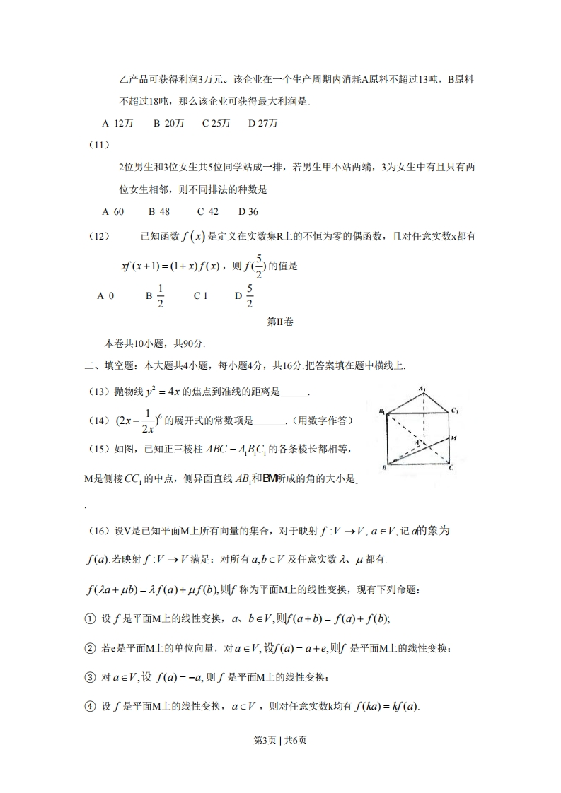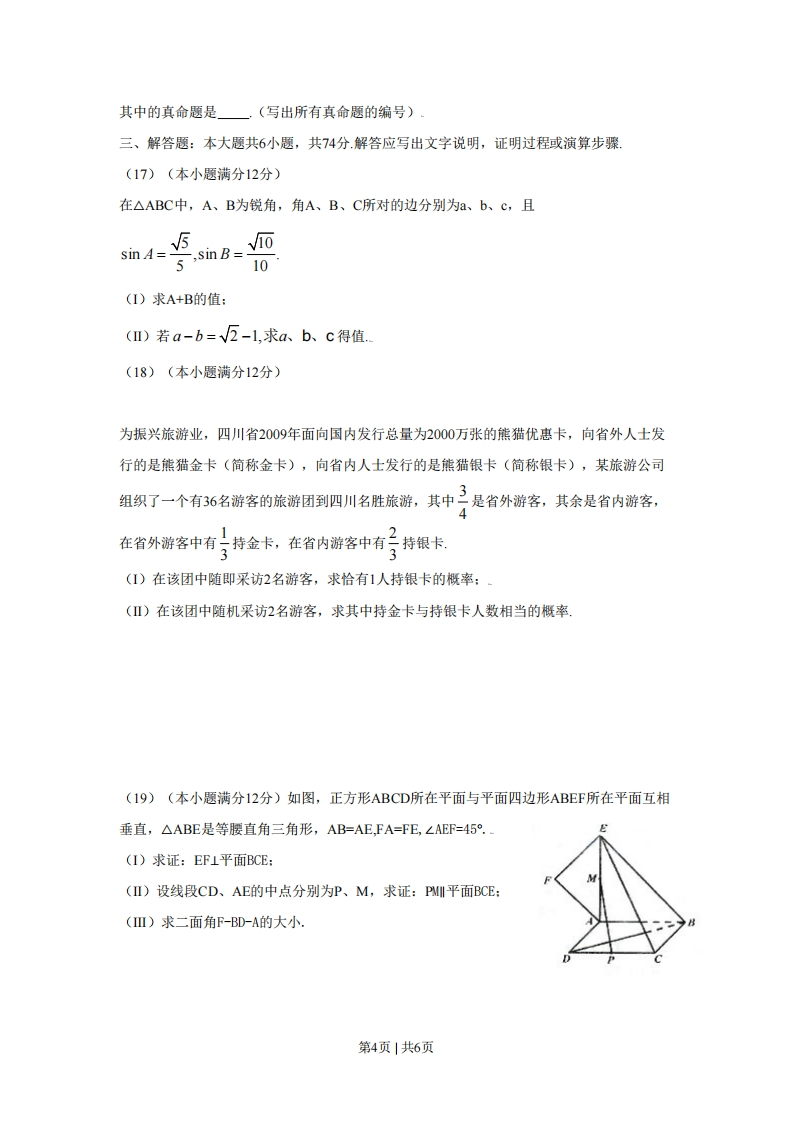 2009年普通高等学校招生全国统一考试(四川卷)数学(文史类)一,选择题:(1)设集合S={x<5},T={xx+7)(x-3)<0},则SnT=(A){x-70)(B)1og2(x-1)(x>1)(C)y=-1+log2(x>0)(D)log2(x+1)(x>-1)(3)等差数列{am}的公差不为零,首项a,=l,4是a,和a等比中项,则数列{a.}的前10项之和是(A)90(B)100(C)145D)190④已知函数f)=sinx-x∈R),下面结论错误的是(A)函数f(x)的最小正周期为2元πB)函数f(x)在区上是增函数(C)函数f(x)的图像关于直线x=0对称(D)函数f(x)是奇函数)设矩形的长为a,宽为b,其比满足b:a=5二≈0.618,这种矩形给人美感,称2为黄金矩形。黄金矩形常应用于工艺品设计中。下面是某工艺品厂随机抽取两个批次的初加工矩形宽度与长度的比值样本:甲批次:0.5980.6250.6280.5950.639乙批次:0.6180.6130.5920.6220.620根据上述两个样本来估计两个批次的总体平均数,与标准值0.618比较,正确结论是(A)甲批次的总体平均数与标准值更接近。第1页|共6页(B)乙批次的总体平均数与标准值更接近(C)两个批次总体平均数与标准值接近程度相同(D)两个批次总体平均数与标准值接近程度不能确定(6)如图,己知六棱锥PABCDEF的底面是正六边形,PA⊥平面ABC,PA=2AB,则下列结论正确的是(A)PB⊥AD(B)平面PAB⊥平面PBC(C)直线BC∥平面PAE(D)直线PD与平面ABC所成的角为45(7)己知a,b,c,d为实数,且c>d,则a>b”是“a-c>b-d”的(A)充分而不必要条件(B)必要而不充分条件(C)充要条件(D)既不充分也不必要条件(8)已知双曲线、12京=1(6>0)的左、右焦点分别为F,其一条渐进线方程为y=x,点p(√5,)在该双曲线上,则P瓦P瓦=A-12B-2C0D4(9)如图,在半径为3的球面上有A.B.C三点,∠ABC=90°,BA=BC,球心O到平面ABC的距离是3则B.C两点的球面距离是24A3BππD2π3(10)某企业生产甲、乙两种产品。己知生产每吨甲产品要用A原料3吨、B原料2吨:生产每吨乙产品要用A原料1吨、B原料3吨。销售每吨甲产品可获得利润5万元、每吨第2页|共6页乙产品可获得利润3万元。该企业在一个生产周期内消耗A原料不超过13吨,B原料不超过18吨,那么该企业可获得最大利润是A12万B20万C25万D27万(11)2位男生和3位女生共5位同学站成一排,若男生甲不站两端,3为女生中有且只有两位女生相邻,则不同排法的种数是A60B48C42D36(12)己知函数f(x)是定义在实数集R上的不恒为零的偶函数,且对任意实数x都有(x+1)=(1+x)f(x),则f()的值是A0C1D第卷本卷共10小题,共90分.二、填空题:本大题共4小题,每小题4分,共16分.把答案填在题中横线上,(13)抛物线y2=4x的焦点到准线的距离是(14)2x-卢的展开式的常数项是(用数字作答)2x(15)如图,己知正三棱柱ABC-AB,C的各条棱长都相等,M是侧棱CC,的中点,侧异面直线AB,和BM所成的角的大小是(16)设V是已知平面M上所有向量的集合,对于映射f:V→V,a∈V,记a的象为f(a).若映射f:V→V满足:对所有a,b∈V及任意实数入、4都有」f(a+b)=f(a)+4f(b),则f称为平面M上的线性变换,现有下列命题:①设f是平面M上的线性变换,a、b∈V,则f(a+b)=f(a)+f(b):②若e是平面M上的单位向量,对a∈V,设f(a)=a+e,则f是平面M上的线性变换:③对aeV,设f(a=-a,则f是平面M上的线性变换:④设f是平面M上的线性变换,a∈V,则对任意实数k均有f(ka)=f(a),第3页|共6页