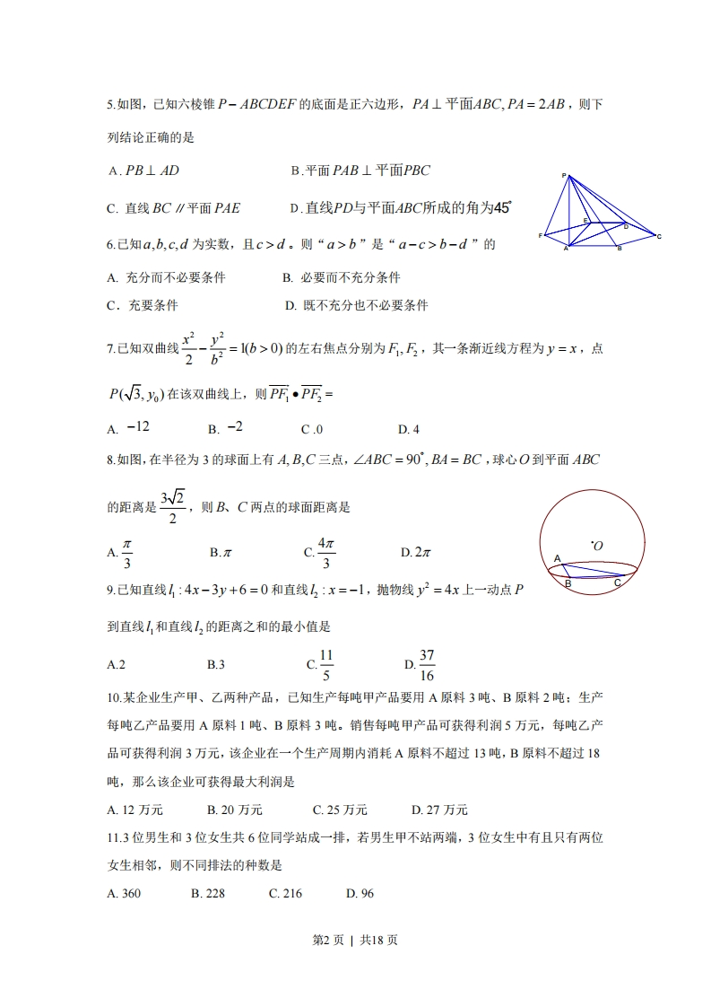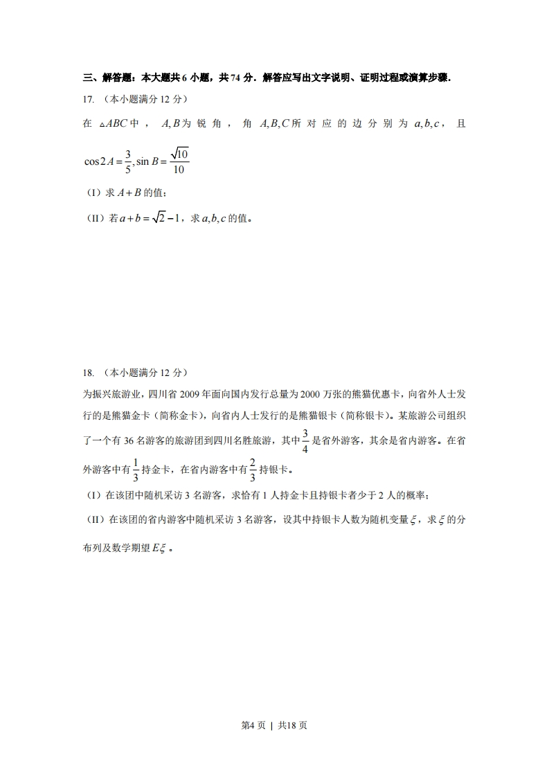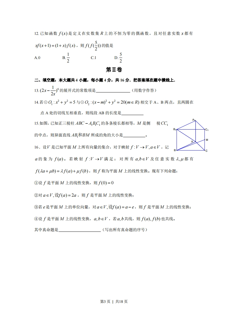 2009年普通高等学校招生全国统一考试((四川卷)理科数学第I卷本试卷共12小题,每小题5分,共60分。在每小题给出的四个选项中,只有一项是符合题目要求的。参考公式:如果事件A,B互斥,那么球的表面积公式S=4πR2P(A+B)=P(A)+P(B)其中R表示球的半径如果事件A,B相互独立,那么球的体积公式V=4P(A-B)=P(A)P(B)其中R表示球的半径一、选择题:1.设集合S={xx<5},T={xx2+4x-21<0,则SnT=A.{x-7d。则“a>b”是“a-c>b-d”的A.充分而不必要条件B.必要而不充分条件C.充要条件D.既不充分也不必要条件7.已知双曲线上、2b2=1(b>O)的左右焦点分别为F,F,其一条渐近线方程为y=x,点P(W5,%)在该双曲线上,则P℉·PE=A.-12B.-2C.0D.48.如图,在半径为3的球面上有A,B,C三点,∠ABC=90°,BA=BC,球心O到平面ABC的距离是35,则B、C两点的球面距离是2CD.2π0B.π39.己知直线1:4x-3y+6=0和直线/:x=-1,抛物线y2=4x上一动点P到直线1,和直线12的距离之和的最小值是37A.2B.3c号D1610某企业生产甲、乙两种产品,己知生产每吨甲产品要用A原料3吨、B原料2吨:生产每吨乙产品要用A原料1吨、B原料3吨。销售每吨甲产品可获得利润5万元,每吨乙产品可获得利润3万元,该企业在一个生产周期内消耗A原料不超过13吨,B原料不超过18吨,那么该企业可获得最大利润是A.12万元B.20万元C.25万元D.27万元11.3位男生和3位女生共6位同学站成一排,若男生甲不站两端,3位女生中有且只有两位女生相邻,则不同排法的种数是A.360B.228C.216D.96第2页|共18页12.己知函数f(x)是定义在实数集R上的不恒为零的偶函数,且对任意实数x都有f(x+1)=(1+)f(x),则ff()的值是5A.0c.10第Ⅱ卷二、填空题:本大题共4小题,每小题4分,共16分。把答案填在题中横线上1B(2x-宁°的展开式的常数项是(用数字作答)14.若⊙O:x2+y2=5与⊙O,:(x-m)2+y2=20(m∈R)相交于A、B两点,且两圆在点A处的切线互相垂直,则线段AB的长度是15.如图,己知正三棱柱ABC-A,B,C的各条棱长都相等,M是侧棱CC的中点,则异面直线AB和BM所成的角的大小是16.设V是己知平面M上所有向量的集合,对于映射f:V→V,a∈V,记a的象为f(a)。若映射f:V→V满足:对所有a,b∈V及任意实数元,u都有f(a+b)=元f(a)+4f(b),则f称为平面M上的线性变换。现有下列命题:①设f是平面M上的线性变换,则f(O)=0②对a∈V,设f(a)=2a,则f是平面M上的线性变换:③若e是平面M上的单位向量,对a∈V,设f(a)=a-e,则f是平面M上的线性变换:④设f是平面M上的线性变换,a,b∈V,若a,b共线,则f(a),f(b)也共线。其中真命题是(写出所有真命题的序号)第3页|共18页
