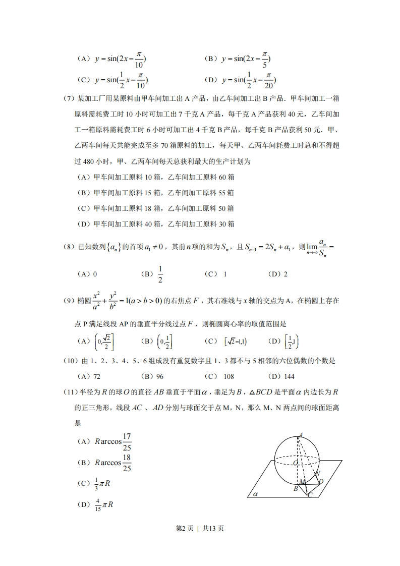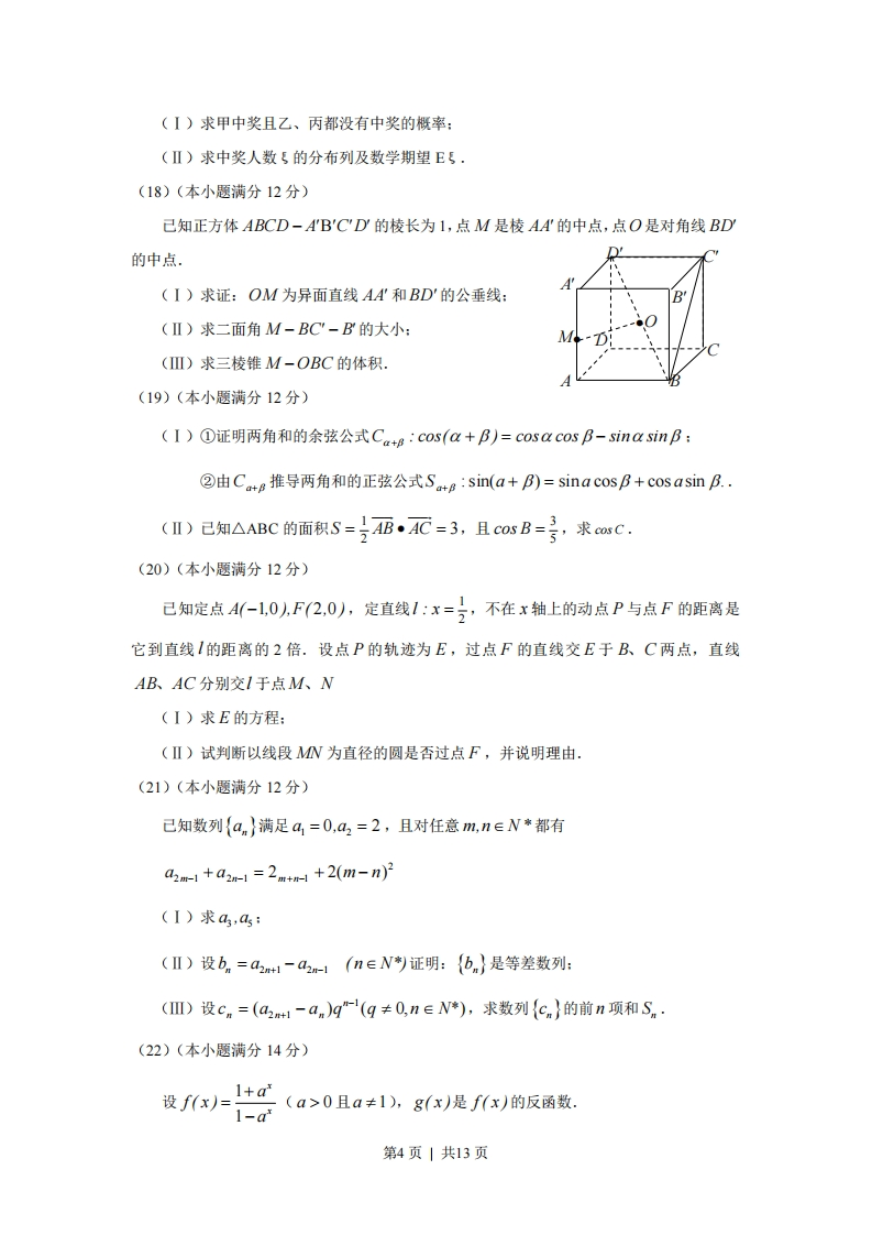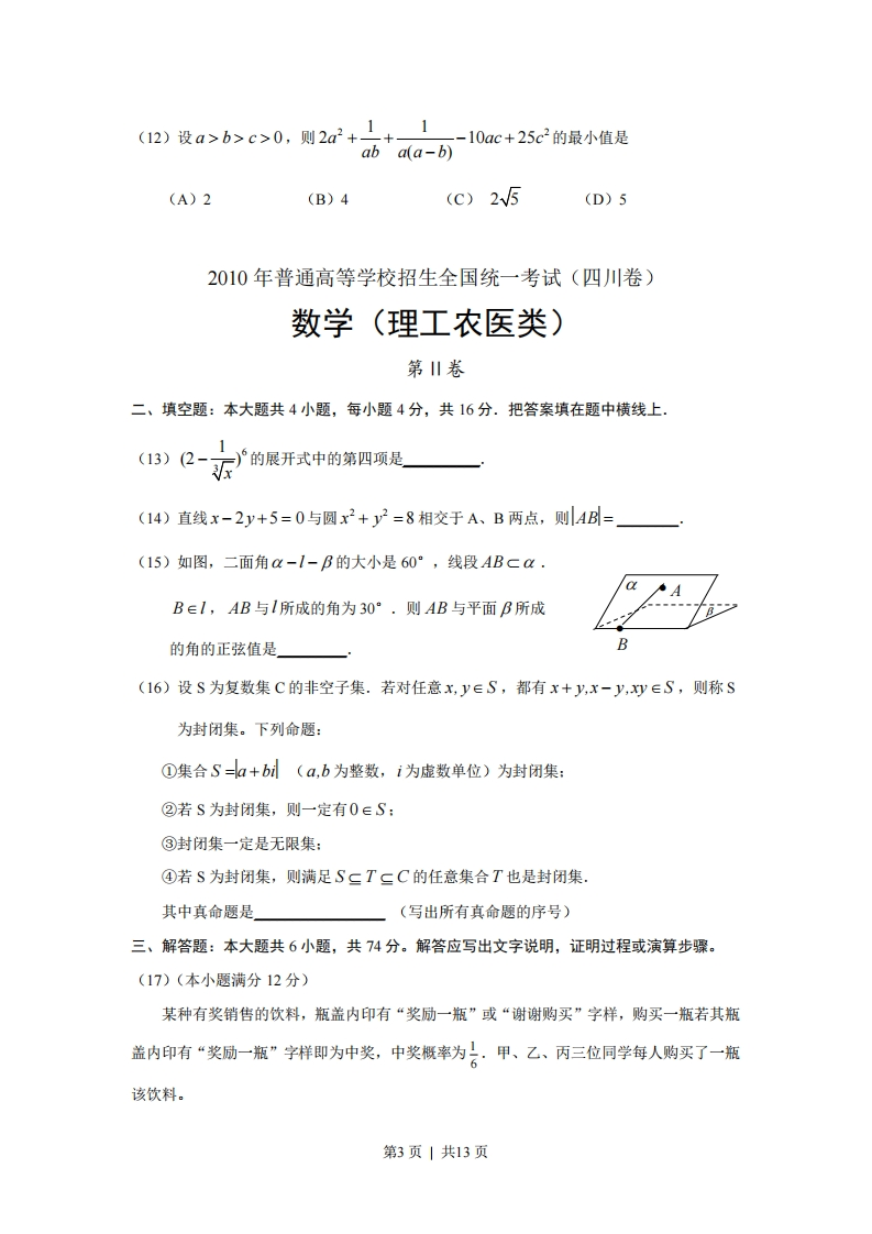 2010年普通高等学校招生全国统一考试(四川卷)数学(理工农医类)第I卷一、选择题:(1)i是虚数单位,计算i+2+=(A)-1(B)1(c)-i(D)i(2)下列四个图像所表示的函数,在点x=0处连续的是(A)(B)(C)(D)(3)2log510+log50.25=(A)0(B)1(C)2(D)4(4)函数f(x)=x2+r+1的图像关于直线x=1对称的充要条件是(A)m=-2(B)m=2(C)m=-1(D)m=1(5)设点M是线段BC的中点,点A在直线BC外,BC=16,AB+AC=AB-AC,则AM=(A)8(B)4(C)2(D)1(6)将函数y=Six的图像上所有的点向右平行移动文个单位长度,再把所得各点的横10坐标伸长到原来的2倍(纵坐标不变),所得图像的函数解析式是第1页|共13页)y=m2x-司(B)y=sin(2x-Z)5c)y=吃-1(7)某加工厂用某原料由甲车间加工出A产品,由乙车间加工出B产品.甲车间加工一箱原料需耗费工时10小时可加工出7千克A产品,每千克A产品获利40元,乙车间加工一箱原料需耗费工时6小时可加工出4千克B产品,每千克B产品获利50元.甲、乙两车间每天共能完成至多70箱原料的加工,每天甲、乙两车间耗费工时总和不得超过480小时,甲、乙两车间每天总获利最大的生产计划为(A)甲车间加工原料10箱,乙车间加工原料60箱(B)甲车间加工原料15箱,乙车间加工原料55箱(C)甲车间加工原料18箱,乙车间加工原料50箱(D)甲车间加工原料40箱,乙车间加工原料30箱(8)己知数列{an}的首项a,≠0,其前n项的和为Sn,且Snt1=2Sn+a,则limS(A)0(B)(C)1(D)22【9)椭圆小b2=1(a>b>0)的右焦点F,其右准线与x轴的交点为A,在椭圆上存在点P满足线段AP的垂直平分线过点F,则椭圆离心率的取值范围是(A)(c)[5-1,)(D))(10)由1、2、3、4、5、6组成没有重复数字且1、3都不与5相邻的六位偶数的个数是(A)72(B)96(C)108(D)144(11)半径为R的球O的直径AB垂直于平面M,垂足为B,△BCD是平面a内边长为R的正三角形,线段AC、AD分别与球面交于点M,N,那么M、N两点间的球面距离是(A)Rarccos172518(B)Rarccos25(C)SπR(D)πR第2页|共13页(12)设a>b>c>0,则2a2+1+1--10ac+25c2的最小值是ab a(a-b)(A)2(B)4(C)2W5(D)52010年普通高等学校招生全国统一考试(四川卷)数学(理工农医类)第川卷二、填空题:本大题共4小题,每小题4分,共16分.把答案填在题中横线上.(13)(2-”的展开式中的第四项是(14)直线x-2y+5=0与圆x2+y2=8相交于A、B两点,则AB=(15)如图,二面角-1-B的大小是60°,线段ABca.B∈1,AB与1所成的角为30°.则AB与平面B所成的角的正弦值是B(16)设S为复数集C的非空子集.若对任意x,y∈S,都有x+y,x-y,y∈S,则称S为封闭集。下列命题:①集合S=a+bi(a,b为整数,i为虚数单位)为封闭集:②若S为封闭集,则一定有0∈S:③封闭集一定是无限集:④若S为封闭集,则满足S二T二C的任意集合T也是封闭集。其中真命题是」(写出所有真命题的序号)三、解答题:本大题共6小题,共74分。解答应写出文字说明,证明过程或演算步骤。(17)(本小题满分12分)某种有奖销售的饮料,瓶盖内印有“奖励一瓶”或“谢谢购买”字样,购买一瓶若其瓶盖内印有“奖励一瓶”字样即为中奖,中奖概率为二.甲、乙、丙三位同学每人购买了一瓶该饮料。第3页|共13页