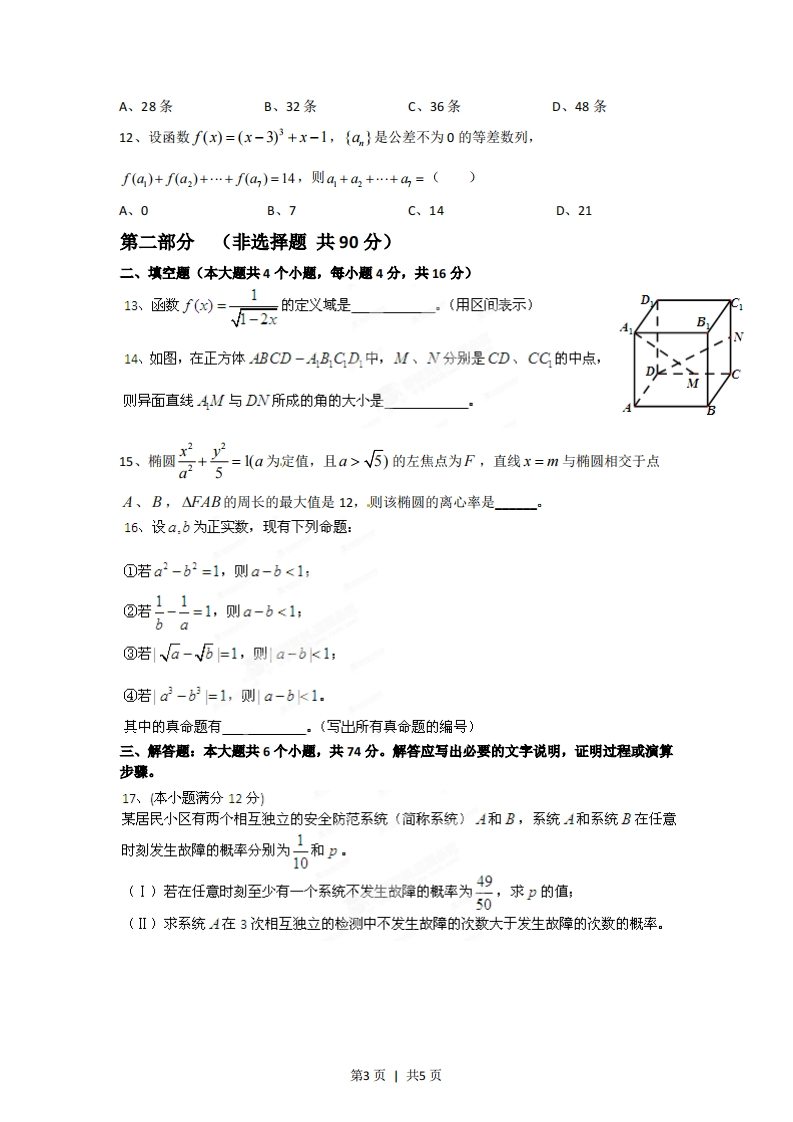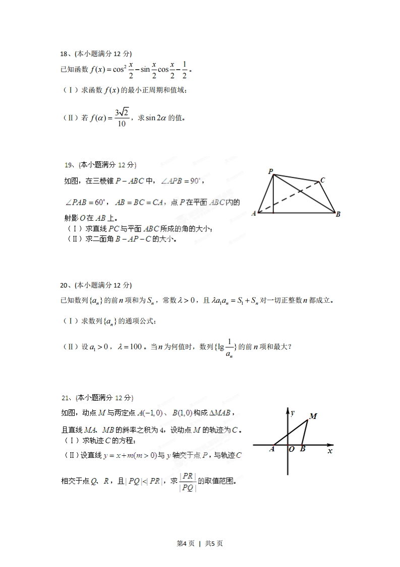 2012年普通高等学校招生全国统一考试(四川卷)数学(文)参考公式:如果事件互斥,那么球的表面积公式P(A+B)=P(A)+P(B)S=4πR2如果事件A、B相互独立,那么其中R表示球的半径P(A·B)=P(A)·P(B)球的体积公式如果事件A在一次试验中发生的概率是p,那么v=4mp3在n次独立重复试验中事件A恰好发生k次的概率其中R表示球的半径Pk)=Ctp*1-p)*(k=0,1,2,…,m)第一部分(选择题共60分)一、选择题:本大题共12小题,每小题5份,共60份。在每小题给出的四个选项中,只有一项是符合题目要求的。1、设集合A={ab},B={.c},则AUB=()A、{b}B、{.c.d}c、{a.c.d}D、{a.b.c.cd}2、(1+)的展开式中x的系数是〔)A、21B、28C、35D、423、交通管理部门为了解机动车驾驶员(简称驾驶员)对某新法规的知晓情况,对甲、乙、丙、丁四个社区做分层抽样调查。假设四个社区驾驶员的总人数为,其中甲社区有驾驶员96人。若在甲、乙、丙、丁四个社区抽取驾驶员的人数分别为12,21,25,43,则这四个社区驾驶员的总人数N为()A、101·B、808C、1212D、20124、函数y=a-a(a>0.a≠)的图象可能是()第1页1共5页5、如图,正方形ABCD的边长为1,延长BA至E,使AE=1,连接EC、ED则sin∠CED=(D3v108、òCD101010156、下列命题正确的是()4、若两条直线和同一个平面所成的角相等,则这两条直线平行B、若一个平面内有三个点到另一个平面的距离相等,则这两个平面平行〔、若一条直线平行于两个相交平面,则这条直线与这两个平面的交线平行D、若两个平面都垂直于第三个平面,则这两个平面平行7设a、b都是非零向量,下列四个条件中,使是=b可成立的充分条件是()A、a=b且a/bB、a=-b.c、abD、a=2bx-y2-3x+2y≤128、若变量x,y满足约束条件2x+y≤12,则z=3x+4y的最大值是()x20y≥0A、12B、26C、28D、339、己知抛物线关于x轴对称,它的顶点在坐标原点O,并且经过点M(2,)。若点M到该抛物线焦点的距离为3,则|OM=()A、2W5B、25c、4D、2510、如图,半径为R的半球0的底面圆0在平面内,过点0作平面以的垂线交半球面于点A,过圆O的直径CD作平面a成45B角的平面与半球面相交,所得交线上到平面的距离最大的点为B,该交线上的一点P满足∠BOP=60°,则A、P两点间的球面距离为(A、R arccos迈8RπRC、R arccosD、443311、方程y=bx2+c中的a,b,c∈{-2,0,1,2,3},且a,b,c互不相同,在所有这些方程所表示的曲线中,不同的抛物线共有()第2页丨共5页A、28条B、32条C、36条D、48条12、设函数f(x)=(x-3)3+x-1,{a}是公差不为0的等差数列,f(a)+f(a2)+…+f(a,)=14,则a+a2++4,=()A、0B、7C、14D、21第二部分(非选择题共90分)二、填空题(本大题共4个小题,每小题4分,共16分)13、函数f(x)=1一的定义域是。(用区间表示)V1-2x14、如图,在正方体ABCD-ABCD,中,M、N分别是CD、CC的中点,则异面直线AM与DN所成的角的大小是5、椭圆二+大三a为定值,且a>V5的左焦点为F,直线x=m与椭圆相交于点A、B,△FAB的周长的最大值是12,则该椭圆的离心率是16、设a.b为正实数,现有下列命题:①若a2-b2=1,则a-b<1②若1-1=,则a-b<1,b a③若1√a-√5=1,则1a-bk1;④若1ad3-b=1,则a-bk1.其中的真命题有。(写出所有真命题的编号)三、解答题:本大题共6个小题,共74分。解答应写出必要的文字说明,证明过程或演算步骤。17、(本小题满分12分)某居民小区有两个相互独立的安全防范系统(简称系统)A和B,系统A和系统B在任意时刻发生故障的概率分别为二和P·10(I)若在任意时刻至少有一个系统不发生故障的概率为49,求p的值;50(Ⅱ)求系统A在3次相互独立的检测中不发生故障的次数大于发生故障的次数的概率。第3页丨共5页