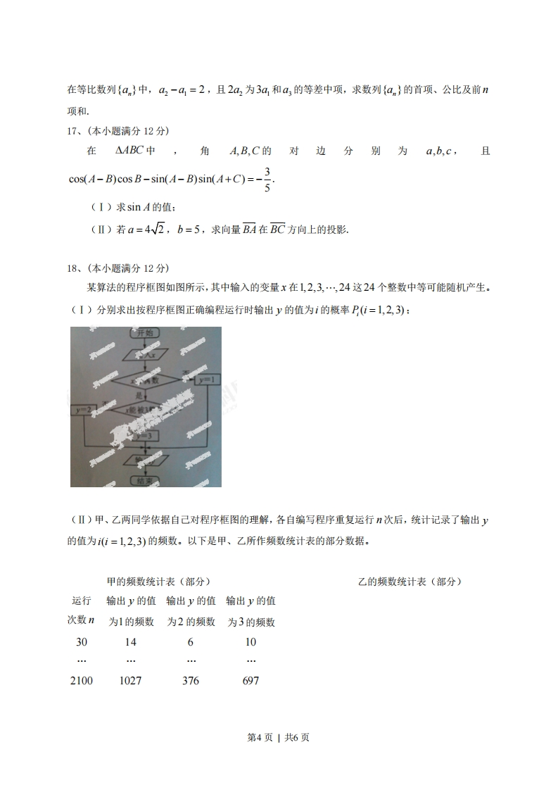 纯密★启用前2013年普通高等学校招生全国统一考试(四川卷)数学(文史类)本试题卷分第I卷(选择题)和第Ⅱ卷(非选择题)。第I卷1至2页,第Ⅱ卷3至4页,共4页。考生作答时,须将答案答在答题卡上,在本试题卷、草稿纸上大题无效。满分150分。考试时间120分钟。考试结束后,将本试题卷和答题卡上一并交回。第I卷(选择题共50分)注意事项:必须使用2B铅笔在答题卡上将所选答案对应的标号涂黑。一、选择题:本大题共10小题,年小题5分,共50分。在年小题给出的四个选项中,只有一个是符合题目要求的。1、设集合A={1,2,3},集合B={-2,2},则A∩B=()(A)(B){2侧规图(C){-2,2(D){-2,1,2,3}正视图2、一个几何体的三视图如图所示,则该几何体可以是()(A)棱柱(B)棱台信视图(C)圆柱(D)圆台3、如图,在复平面内,点A表示复数z,则图中表示z的共轭复数的点是((A)A(B)BA。(C)C(D)DB。·D4、设x∈Z,集合A是奇数集,集合B是偶数集.若命题p:x∈A,2x∈B,则()(A)p:3x∈A,2x∈B(B)p:3xEA,2x∈B(C)p:3x∈A,2x生B(D)p:xEA,2x年B5、抛物线y2=8x的焦点到直线x-√3y=0的距离是()(A)2W5(B)2第1页|共6页(C)5(D)16、函数f=2sin(or+p)(0>0,-7<<艺)的部分图象如图所示,则0,p的值分别是w2-号®2-(C)4,-604号7、某学校随机抽取20个班,调查各班中有网上购物经历的人数,所得数据的茎叶图如图所示。以组距为5将数据分组成[0,5),[5,10),…,[30,35),[35,40]时,所作的频率分布直方图是()频率须率组距0.05组距组距组距0.040.040.040.040.030.030.030.030.020.020.020.020.010.010.010.010510152025303540人数0510152025303540人数010203040人数010203040人数(A)(B)(C)(D)073176443075432038430x+y≤8,2y-x≤4,8、若变量x,y满足约束条件且z=5y-x的最大值为a,最小值为b,则a-b的值是x≥0,y≥0,第2页|共6页(A)48(B)30(C)24(D)169、从椭圆万-1(a>b>0)上一点P向x轴作垂线,垂足恰为左焦点F,A是椭圆与x轴正半轴的交点,B是椭圆与y轴正半轴的交点,且AB//OP(O是坐标原点),则该椭圆的离心率是()(A)1(B)52(C)(D)210、设函数f(x)=√e+x-a(a∈R,e为自然对数的底数)。若存在b∈[0,]使f(f(b)=b成立,则a的取值范围是((A)[L,e](B)[1,1+e](c)[e,l+e](D)[0,]第二部分(非选择题共100分)注意事项:必须使用0.5毫米黑色签字笔在答题卡上题目所指示的答题区域内作答。作图题可先用铅笔绘出,确认后再用0.5毫米黑色墨迹签字笔描清楚。答在试题卷上无效。二、填空题:本大题共5小题,每小题5分,共25分。11、lgV+lgV20的值是12、如图,在平行四边形ABCD中,对角线AC与BD交于点O,AB+AD=1AO,则2=13、已知函数fx)=4x+a(x>0,a>0)在x=3时取得最小值,则a=1”4设sin2a=-sina,ae(5,,则ian2a的值15、在平面直角坐标系内,到点A(1,2),B(1,5),C(3,6),D(7,-1)的距离之和最小的点的坐标是三、解答题:本大题共6小题,共75分。解答应写出文字说明,证明过程或演算步骤。16、(本小题满分12分)第3页|共6页