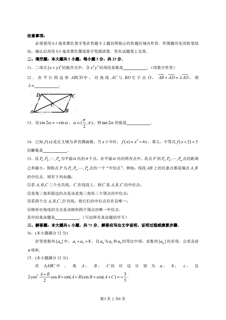 纯密★启用前2013年普通高等学校招生全国统一考试(四川卷)数学(理工类)本试题卷分第I卷(选择题)和第Ⅱ卷(非选择题).第I卷1至2页,第Ⅱ卷3至4页,共4页.考生作答时,须将答案答在答题卡上,在本试题卷、草稿纸上大题无效.满分150分.考试时间120分钟.考试结束后,将本试题卷和答题卡上一并交回第I卷(选择题共50分)注意事项:必须使用2B铅笔在答题卡上将所选答案对应的标号涂黑.一、选择题:本大题共10小题,每小题5分,共50分.在每小题给出的四个选项中,只有一个是符合题目要求的.1.设集合A={x|x+2=0},集合B={xx2-4=0},则A∩B=()(A){-2}(B){2(C){-2,2}(D)2.如图,在复平面内,点A表示复数z,则图中表示z的共轭复数的点是()(A)A(B)B(C)C(D)DD3.一个几何体的三视图如图所示,则该几何体的直观图可以是()(A)(B)(C4.设x∈Z,集合A是奇数集,集合B是偶数集.若命题p:x∈A,2x∈B,则()(A)p:3x∈A,2xEB(B)p:x生A,2xB第1页|共6页(C)p:3x年A,2x∈B(D)p:3x∈A,2x生B5,函数f)=2sin(ox+)(0>0,-7<0<)的部分图象如图所2示,则@,的值分别是()26w2-号π(B)2,-6c)4-君(D)4,36.抛物线广=4红的焦点到双曲线r-=1的渐近线的距离是()3(A)(B)5(c)1(D)√57.函数y=的图象大致是()3-1一一一8.从1,3,5,7,9这五个数中,每次取出两个不同的数分别为a,b,共可得到1ga-lgb的不同值的个数是()(A)9(B)10(C)18(D)209.节日前夕,小李在家门前的树上挂了两串彩灯,这两串彩灯的第一次闪亮相互独立,且都在通电后的4秒内任一时刻等可能发生,然后每串彩灯以4秒为间隔闪亮,那么这两串彩灯同时通电后,它们第一次闪亮的时刻相差不超过2秒的概率是(11(B)(c)(D)72810.设函数f(x)=√e+x-a(a∈R,e为自然对数的底数).若曲线y=sinx上存在(xo,%)使得f(f)》=%,则a的取值范围是()(A)[l,e](B)[e,](c)[l,1+e](D)[e,e+l]第二部分(非选择题共100分)第2页|共6页注意事项:必须使用0.5毫米黑色签字笔在答题卡上题目所指示的答题区域内作答.作图题可先用铅笔绘出,确认后再用0.5毫米黑色墨迹签字笔描清楚.答在试题卷上无效,二、填空题:本大题共5小题,每小题5分,共25分.11.二项式(x+y)5的展开式中,含x2y的项的系数是.(用数字作答)12.在平行四边形ABCD中,对角线AC与BD交于点O,AB+AD=AO,则九=43.设sin2a=-sm,a∈5π),则an2a的值是14.己知f(x)是定义域为R的偶函数,当x≥0时,f(x)=x-4x,那么,不等式f(x+2)<5的解集是15.设P,,…,Pn为平面α内的n个点,在平面内的所有点中,若点P到乃,,…,Pn点的距离之和最小,则称点P为P,P,,Pn点的一个“中位点”.例如,线段AB上的任意点都是端点A,B的中位点.则有下列命题:①若A,B,C三个点共线,C在线段上,则C是A,B,C的中位点:②直角三角形斜边的点是该直角三角形三个顶点的中位点:③若四个点A,B,C,D共线,则它们的中位点存在且唯一:④梯形对角线的交点是该梯形四个顶点的唯一中位点.其中的真命题是(写出所有真命题的序号)三、解答题:本大题共6小题,共75分.解答应写出文字说明,证明过程或演算步骤.16.(本小题满分12分)在等差数列{an}中,a,+a3=8,且a,为a2和a,的等比中项,求数列{an}的首项、公差及前n项和.17.(本小题满分12分)在△ABC中,角A,B,C的对边分别为a,b,c,且2cos24-B2cos B-sin(A-B)sin B+cos(+C)=-3第3页|共6页