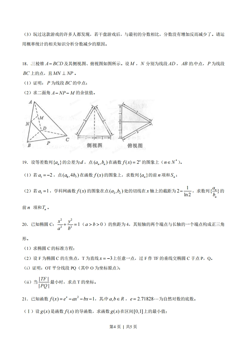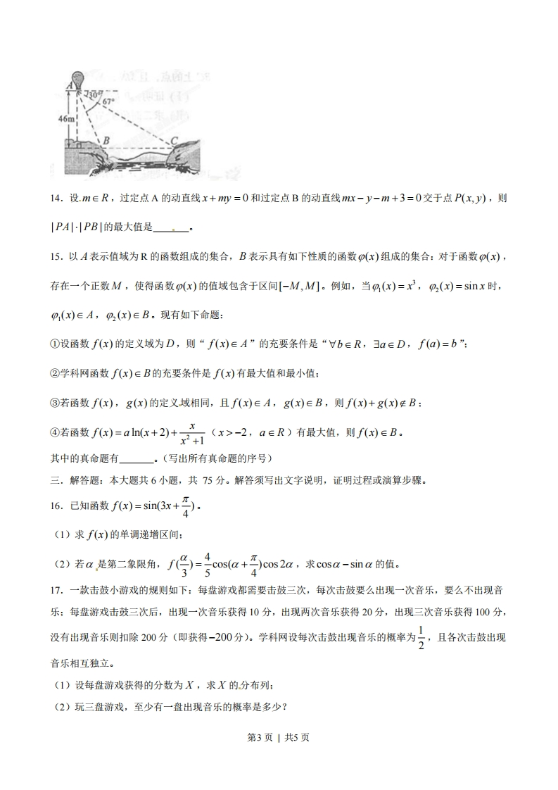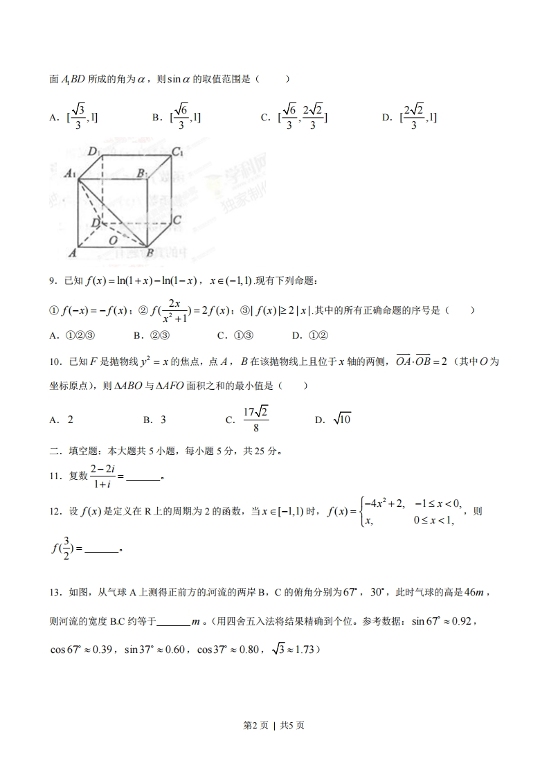 2014年普通高等学校招生全国统一考试(四川卷理科)一,选择题:本大题共10小题,每小题5分,共50分.在每小题给出的四个选项中,只有一个是符合题目要求的。1.已知集合A={xx2-x-2≤0},集合B为整数集,则AOB=()A.{-1,0,1,2}B.{-2,-1,0,1}C.{0,1}D.{-1,032.在x(1+x)的展开式中,含x3项的系数为()A.30B.20C.15D.103.为了得到函数y=sin(2x+1)的图象,只需把函数y=sin2x的图象上所有的点()A.向左平行移动二个单位长度B.向右平行移动二个单位长度C.向左平行移动1个单位长度D.向右平行移动1个单位长度4.若a>b>0,cb B.asb C.azb D.asbc dd cdc5.执行如图1所示的程序框图,如果输入的x,y∈R,则输出的S的最大值为()A.0B.1C.2D.3开输入无,S-2xtyS-1输出36.六个人从左至右排成一行,最左端只能排甲或乙,学科网最右端不能排甲,则不同的排法共有()A.192种B.216种C.240种D.288种7.平面向量a=(1,2),b=(4,2),c=ma+b(m∈R),且c与a的夹角等于c与b的夹角,则m=()A.-2B.-1C.1D.28.如图,在正方体ABCD-A,BCD中,点O为线段BD的中点。设点P在线段CC上,直线OP与平第1页|共5页面ABD所成的角为a,则sina的取值范围是()A.B.3cB学刑独家制9.己知f(x)=ln(1+x)-ln(1-x),x∈(-l,1).现有下列命题:2x①f八-)=-f):②f八+)=2f):③f)P2x,其中的所有正确命题的序号是()A.①②③B.②③C.①③D.①②10.己知F是抛物线y2=x的焦点,点A,B在该抛物线上且位于x轴的两侧,OAOB=2(其中O为坐标原点),则△4BO与△AFO面积之和的最小值是()A.2B.3c.17D.V10二.填空题:本大题共5小题,每小题5分,共25分。11.复数2-21+i12.设f(x)是定义在R上的周期为2的函数,当x∈[-1,1)时,f(x)=-4x2+2,-1≤x<0,则x,0≤x<1,13.如图,从气球A上测得正前方的河流的两岸B,C的俯角分别为6T,30°,此时气球的高是46m,则河流的宽度B.C约等于m。(用四舍五入法将结果精确到个位。参考数据:sin6T≈0.92,cos6T≈0.39,sin37°≈0.60,cos3T≈0.80,√3≈1.73)第2页|共5页日,点的7307-6746m14.设m∈R,,过定点A的动直线x+my=0和过定点B的动直线mx-y-m+3=0交于点P(x,y),则|PAPB|的最大值是。15.以A表示值域为R的函数组成的集合,B表示具有如下性质的函数p(x)组成的集合:对于函数p(x),存在一个正数M,使得函数p(x)的值域包含于区间[-M,M门。例如,当g,(x)=x3,p,(x)=six时,p,(x)∈A,2(x)∈B。现有如下命题:①设函数f(x)的定义域为D,则“f(x)∈A”的充要条件是“Vb∈R,3a∈D,f(a)=b”:②学科网函数f(x)∈B的充要条件是f(x)有最大值和最小值:③若函数f(x),g(x)的定义域相同,且f(x)∈A,g(x)∈B,则f(x)+g(x)生B:④若函数fx)=aln(x+2)+xx2+1-(x>-2,a∈R)有最大值,则f(x)∈B。其中的真命题有。(写出所有真命题的序号)三.解答题:本大题共6小题,共75分。解答须写出文字说明,证明过程或演算步骤。16.己知函数f(x)=sin(3x+4(1)求f(x)的单调递增区间:4)若&是第三象限角,f)=cos(a+)cos2a,求cosa-sina的417.一款击鼓小游戏的规则如下:每盘游戏都需要击鼓三次,每次击鼓要么出现一次音乐,要么不出现音乐:每盘游戏击鼓三次后,出现一次音乐获得10分,出现两次音乐获得20分,出现三次音乐获得100分,没有出现音乐则扣除200分(即获得-200分)。学科网设每次击鼓出现音乐的概率为2,且各次击鼓出现音乐相互独立。(1)设每盘游戏获得的分数为X,求X的分布列:(2)玩三盘游戏,至少有一盘出现音乐的概率是多少?第3页|共5页