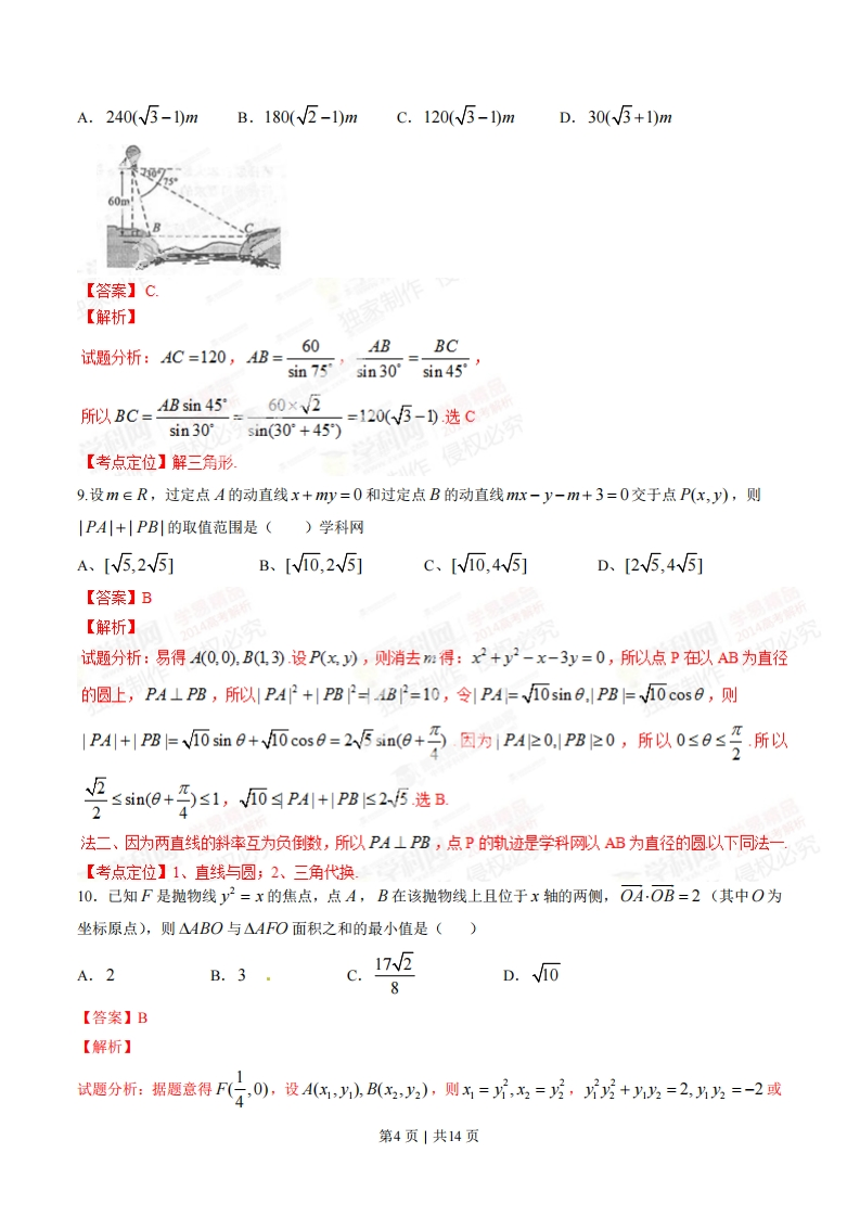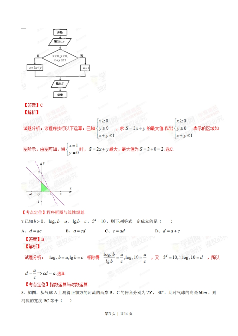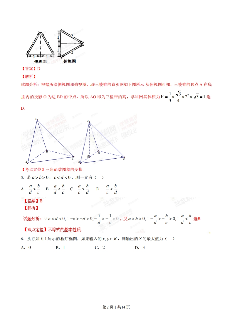 2014年普通高等学校招生全国统一考试(四川卷文科)一.选择题:本大题共10小题,每小题5分,共50分.在每小题给出的四个选项中,只有一个是符合题目要求的。1.己知集合A={x|(x+1)(x-2)≤0},集合B为整数集,则A⌒B=()A.{-1,0}B.{0,1C.{-2,-1,0,1D.{-1,0,1,2}【答案】D【解析】试题分析:A={x-1≤x≤2}.∴.4∩B={-1,0,1,2},选D【考点定位】集合的基本运算2.在“世界读书日”前夕,为了了解某地5000名居民某天的阅读时间,从中抽取了200名居民的阅读时间进行统计分析。在这个问题中,5000名居民的阅读时间的全体是()A.总体B.个体C样本的容量D.从总体中抽取的一个样本【答案】A【解析】试题分析:从5000份中抽取200份,样本的容量是200,抽取的200份是一个样本,每个居民学科网的阅读时间就是一个个体,5000名居民的阅读时间的全体是总体所以选A【考点定位】统计基本概念3.为了得到函数y=sin(x+l)的图象,只需把函数y=sinx的图象上所有的点()A.向左平行移动1个单位长度B.向右平行移动1个单位长度C.向左平行移动π个单位长度D.向右平行移动π个单位长度【答案】A【解析】试题分析:只需把y=six的图像上所有的点向左平移1个单位,便得团数y=sin(x+)的图象选A【考点定位】三角函数图象的变换4某三棱锥的侧视图、俯视图如图所示,则该三棱锥的体积是()(锥体体积公式:V=二Sh,其中S为底面面积,h为高)学科网A、3B、2D、第1页|共14页侧汽图俯衫图【答案】D【解析】试题分析:根据所给侧视图和俯视图,该三棱锥的直观图如下图所示.从俯视图可知,三棱锥的顶点A在底面内的投影0为边BD的中点,所以A0即为三校维的高,学科网其体积为V=×5×2:×5=1选34D.侵权必D一分、【考点定位】三角函数图象的变换5.若a>b>0,c-d>0,->-1>0,又a>b>0-9>-2>0,:9<2选Bd【考点定位】不等式的基本性质6.执行如图1所示的程序框图,如果输入的x,y∈R,则输出的S的最大值为()A.0B.1C.2D.3第2页|共14页棕出x,yx20.y20x+yS1?8=2x+】结束【答案】C【解析】[x20x20试题分析:该程序执行以下运算:已知y20,求S=2x+y的最大值.作出{y≥0表示的区域如x+y≤1x+y≤1x=1图所示,由图可知,当时,S=2x+y最大,最大值为S=2+0=2选Cy=0【考点定位】程序框图与线性规划7.已知b>0,log5b=a,1gb=c,5=10,则下列等式一定成立的是()A、d=acB、a=cdC、c=adD、d=a+c【答案】B层双必【解析】侵权必试题分析:1og5b=a,lgb=c相除得logsb a2-91og,10=日,又59=10.log510=d,所以d=已→cd=a选B【考点定位】指数运算与对数运算8.如图,从气球A上测得正前方的河流的两岸B,C的俯角分别为75,30°,此时气球的高是60m,则河流的宽度BC等于()第3页|共14页