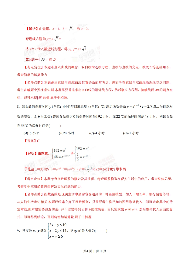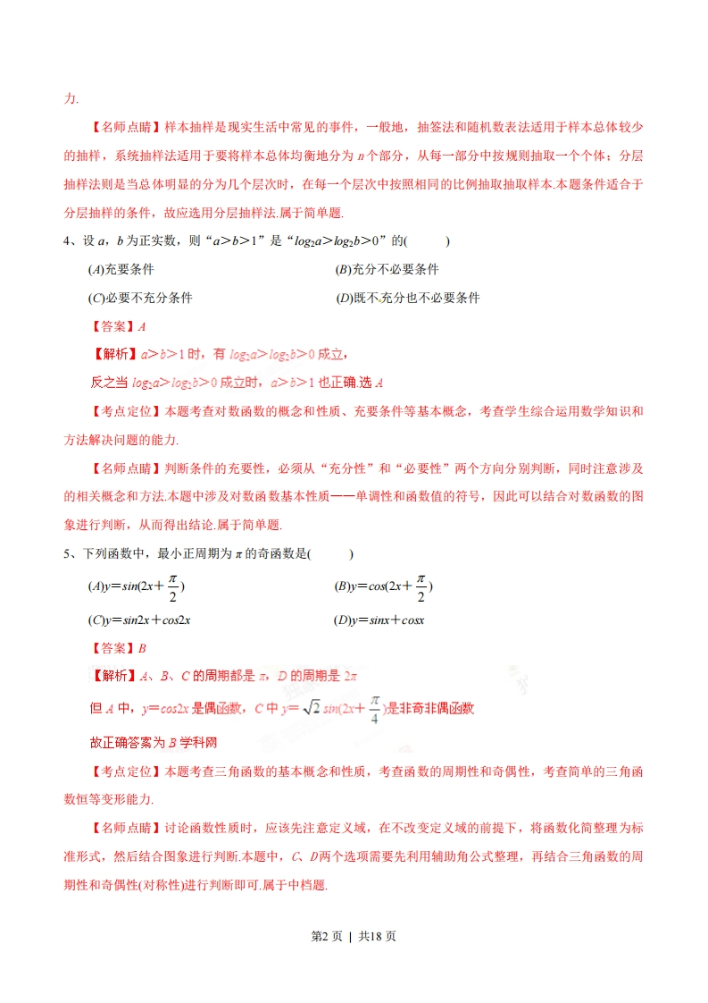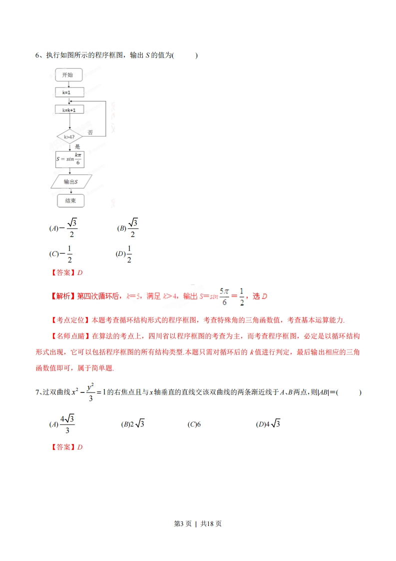 2015年全国普通高等学校招生考试(四川文科数学一、选择题1、设集合A={-1b>1”是“1og2a>log2b>0”的((A)充要条件(B)充分不必要条件(C必要不充分条件(D)既不充分也不必要条件【答案】A【解析】a>b>1时,有10ga>10g:b>0成立,反之当1oga>1og:>0成立时,a>b>1也正确.选A【考点定位】本题考查对数函数的概念和性质、充要条件等基本概念,考查学生综合运用数学知识和方法解决问题的能力.【名师点睛】判断条件的充要性,必须从“充分性”和“必要性”两个方向分别判断,同时注意涉及的相关概念和方法本题中涉及对数函数基本性质一一单调性和函数值的符号,因此可以结合对数函数的图象进行判断,从而得出结论属于简单题5、下列函数中,最小正周期为π的奇函数是((A)y=sin(2x+2(By=cOs2r+T)】(C)y=sin2x+cos2x(D)y=sinx+cosx【答案】B【解析】A、B、C的周期都是,D的周期是2a但A中,)=cos2x是偶函数,C中)=√反2x十区是非奇非偶函数4故正确答案为B学科网【考点定位】本题考查三角函数的基本概念和性质,考查函数的周期性和奇偶性,考查简单的三角函数恒等变形能力【名师点睛】讨论函数性质时,应该先注意定义域,在不改变定义域的前提下,将函数化简整理为标准形式,然后结合图象进行判断本题中,CD两个选项需要先利用辅助角公式整理,再结合三角函数的周期性和奇偶性(对称性)进行判断即可.属于中档题,第2页|共18页6、执行如图所示的程序框图,输出S的值为(开始k=1kk+1<4?1是。kπs=sin 6输出S结束(B)522时【答案】D【解析】第四次循环后,=5,满足>4,输出S=55=1,,选D62【考点定位】本题考查循环结构形式的程序框图,考查特殊角的三角函数值,考查基本运算能力【名师点睛】在算法的考点上,四川省以程序框图的考查为主,而考查程序框图,必定是以循环结构形式出现,它可以包括程序框图的所有结构类型.本题只需对循环后的值进行判定,最后输出相应的三角函数值即可,属于简单题7过双曲线x2-=I的右焦点且与x轴垂直的直线交该双曲线的两条渐近线于A、B两点,则AB=()3(4A04W53(B2V5(C6(D)4V5【答案】D第3页|共18页