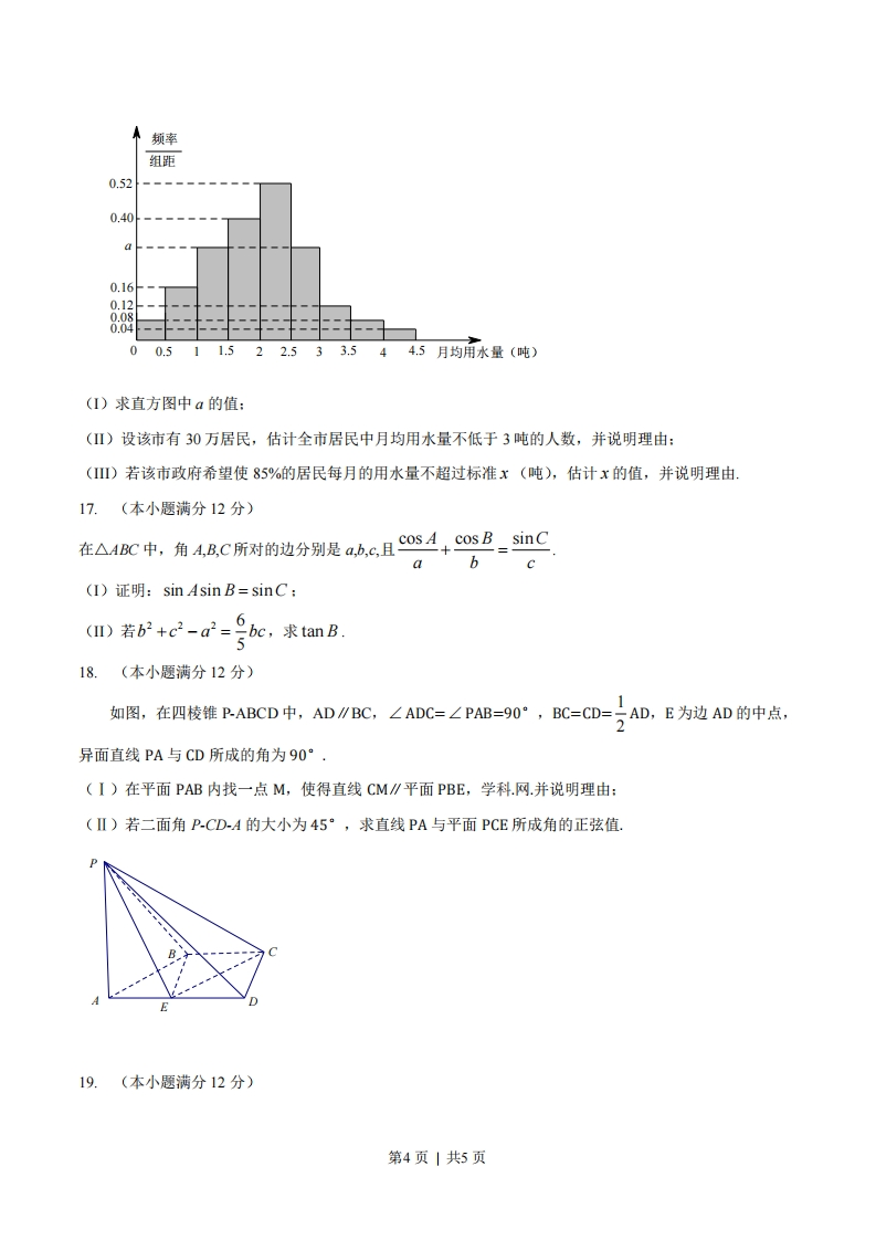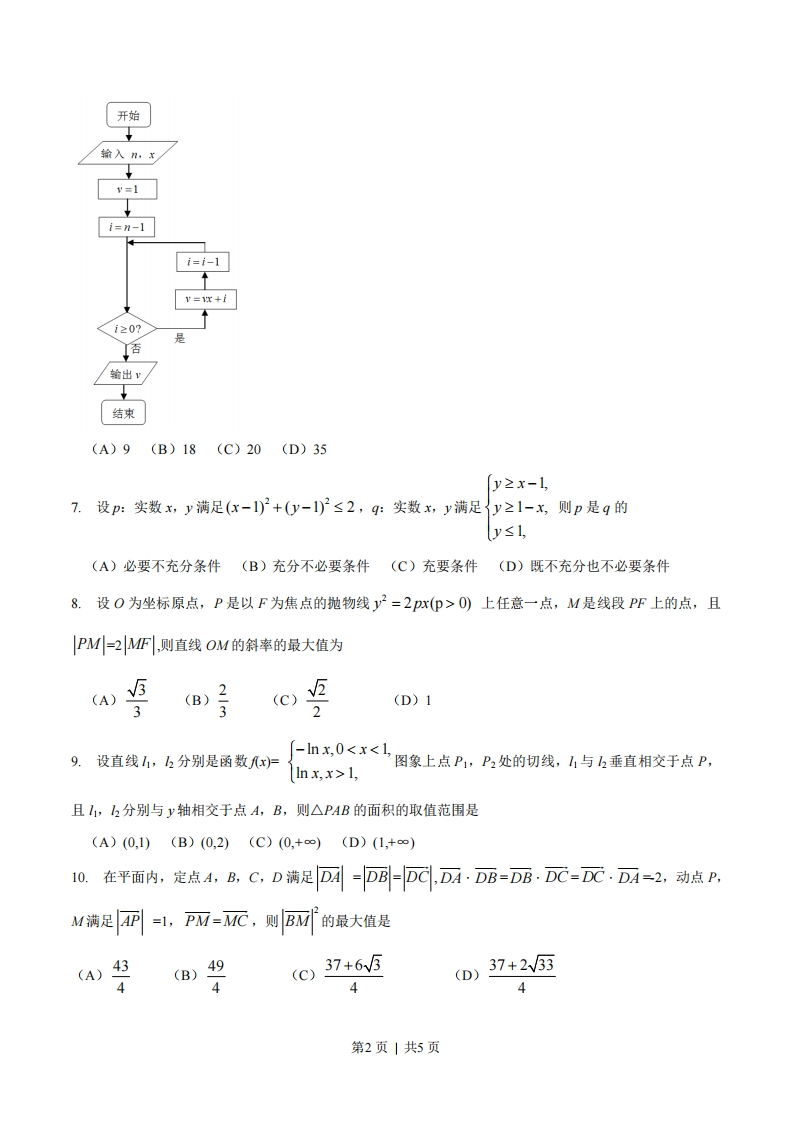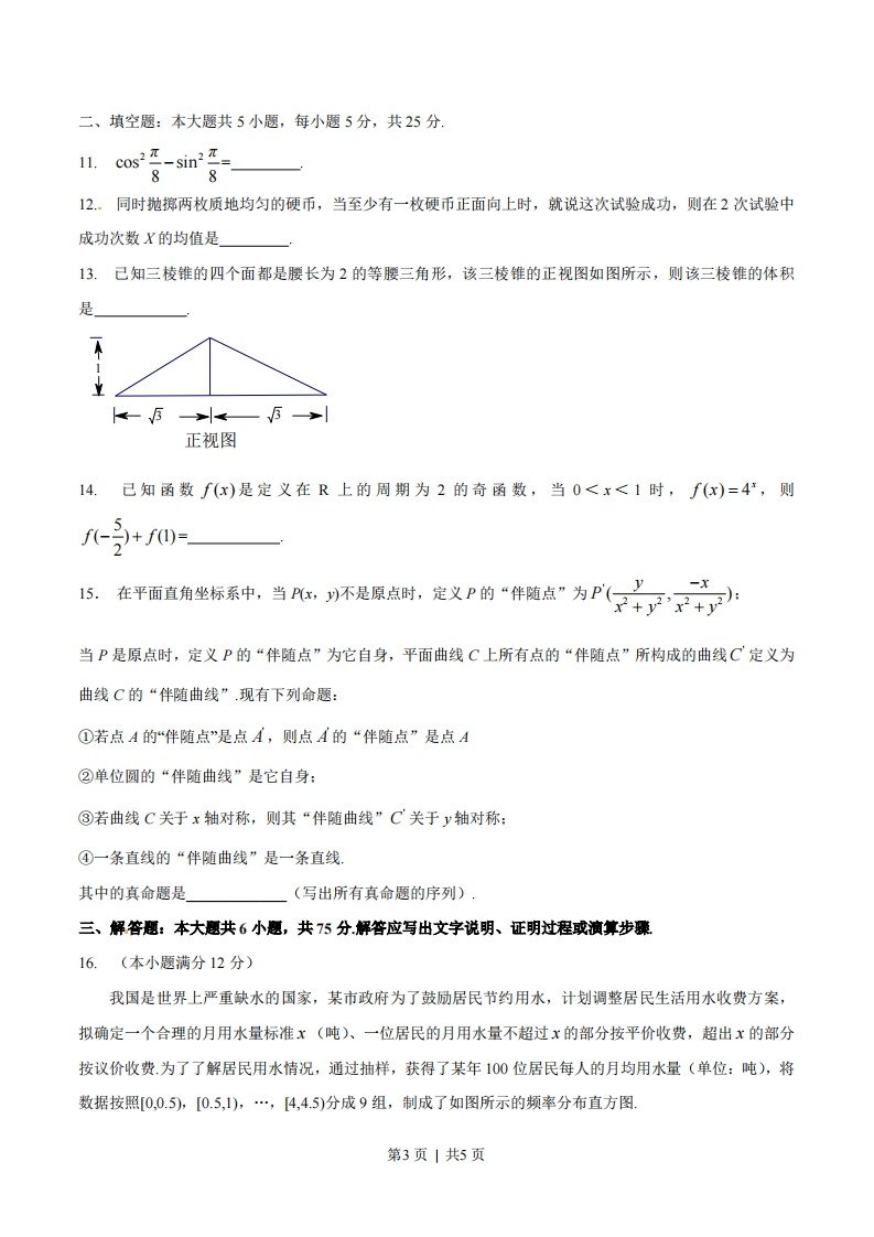 1,且1,2分别与y轴相交于点A,B,则△PAB的面积的取值范围是(A)(0,1)(B)(0,2)(C)(0,+∞)(D)(1,+∞)10.在平面内,定点A,B,C,D满足D=D-DC,DA·DB=DB·DC=DC·DA-2,动点PM满足AP=1,PM=MC,则B☑的最大值是(A)4337+2W33(B)49(c)37+6v5(D)4第2页|共5页二、填空题:本大题共5小题,每小题5分,共25分11.cos2-sin2812.。同时抛掷两枚质地均匀的硬币,当至少有一枚硬币正面向上时,就说这次试验成功,则在2次试验中成功次数X的均值是13.己知三棱锥的四个面都是腰长为2的等腰三角形,该三棱锥的正视图如图所示,则该三棱锥的体积是正视图14.己知函数f(x)是定义在R上的周期为2的奇函数,当0