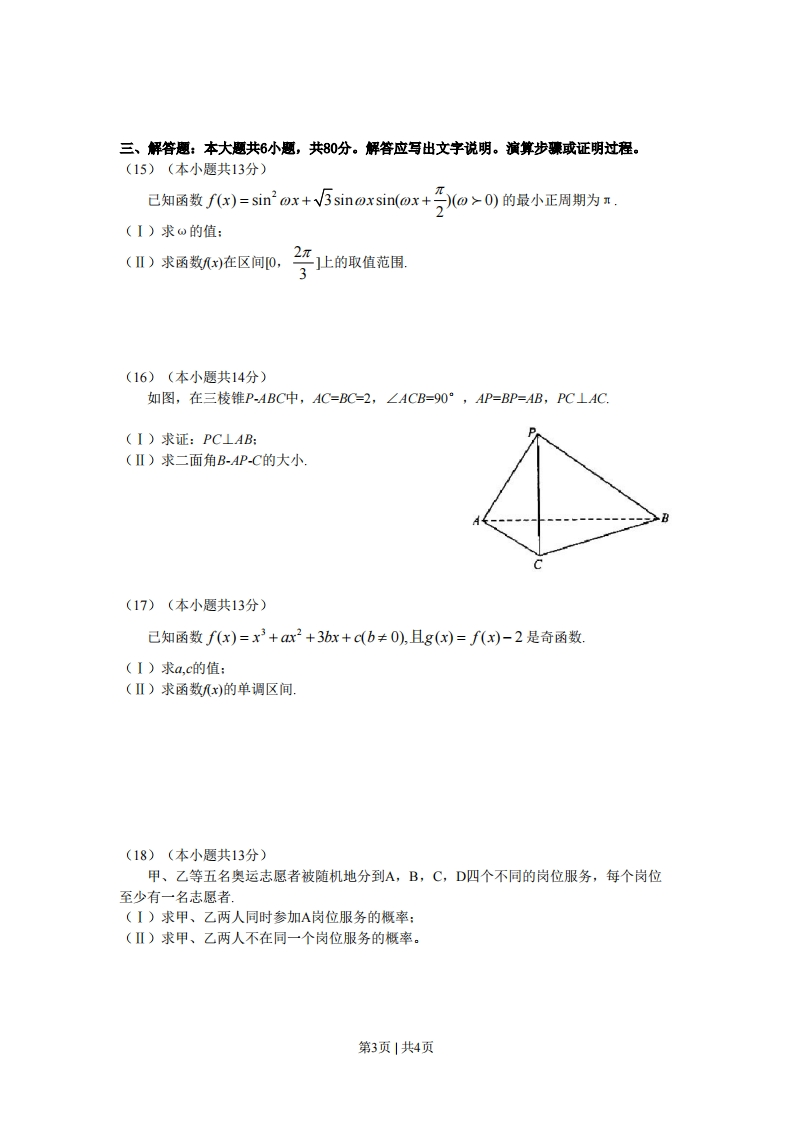 绝密★启用前2008年普通高等学校招生全国统一考试(北京卷)数学(文史类)本试卷分第I卷(选择题)和第Ⅱ卷(非选择题)两部分。第I卷1至2页。第Ⅱ卷3至9页,共150分,考试时间120分钟。考试结束,将本试卷和答题卡一并交回。第I卷(选择题共40分)注意事项:1.答第I卷前,考生务必将自己的姓名、准考证号、考试科目涂写在答题卡上。2.每小题选出答案后,用铅笔把答题卡上对应题目的答案标号涂黑。如需改动,用橡颇擦干净后,再选涂其他答案。不能答在试卷上。一、本大题共8小题,第小题5分,共40分。在每小题列出的四个选项中,选出符合题目要求的一项。(1)若集合A={x叶2≤x≤3}≤3,B={x<-1或>4},则集合AnB等于(A){x中r≤3或x>4}(B){-1b>c(B)b>a>c(C)cza>b(D)b>c>ax2(3)“双曲线的方程为y2,=1”是“双曲线的准线方程为=9”的9165(A)充分而不必要条件(B)必要而不充分条件(C)充分必要条件(D)既不充分也不必要条件(4)己知△ABC中,F√5,b=√5,B=60°,那么角A等于(A)135(B)90(C)45(D)30°(5)函数x)=(r1)241(r<1)的反函数为(A)f-1x=1+√x-1(x>1)(B)Fx)=1-V√x-1(x>1)(C)-(xF1+√x-1(x≥1)(D)P1(xF1-Vx-1(x≥1)xy41≥0,(6)若实数x,满足+y≥0,则=x+2的最小值是r≤0,1(A)0(B)2(C)1(D)2(7)己知等差数列{an}中,a26,as=15.若b.=a2m,则数列{bm}的前5项和等于(A)30(B)45(C)90D)186第1页|共4页(8)如图,动点P在正方体ABCDA1B1C1D1的对角线BD1上,过点P作垂直平面BB,D1D的直线,与正方体表面相交于M、N.设BP=x,MN=,则函数=x)的图象大致是(A)B绝密★使用完毕前2008年普通高等学校校招生全国统一考试数学(文史类)(北京卷)第Ⅱ卷(共110分)注意事项:1.用钢笔或圆珠笔将答案直接写在试卷上。2.答卷前将密封线内的项目填写清楚。题号二总分151617181920分数二、填空题:本大题共6小题,每小题5分,共30分。把答案填在题中横线上。(9)若角a的终边经过点P1,-2),则tan2a的值为(10不等式x->1的解集是】x+2(11)已知向量a与b的夹角为120°,且1a|=l=4,那么a·b的值为(2若6+》展开式中常数项为:各项系数之和为.(用数字作答)(13)如图,函数x)的图象是折线段ABC其中A,B,C的坐标分别为(0,4),(2,0),(6,4),则0)=:函数x)在x=1处的导数(1)=(14)已知函数x)=x2.cos对于[一T,T]上的任意12有如下条件:22①x>x,②xr2Px22;③kPx2,其中能使xPx2)恒成立的条件序号是第2页|共4页三、解答题:本大题共6小题,共80分。解答应写出文字说明。演算步骤或证明过程。(15)(本小题共13分)己知函数f(x)=sin2ox+V5 sinxsin(ox+T)(o>0)的最小正周期为.2(I)求o的值:(Ⅱ)求函数x)在区间O,2π]上的取值范围,3(16)(本小题共14分)如图,在三棱锥P-ABC中,AC=BC=2,∠ACB=90°,AP=BP=AB,PC⊥AC.(I)求证:PC⊥AB:(Ⅱ)求二面角B-AP-C的大小(17)(本小题共13分)己知函数f(x)=x3+a2+3br+c(b≠0),且g(x)=f(x)-2是奇函数.(I)求a,c的值(Ⅱ)求函数x)的单调区间.(18)(本小题共13分)甲、乙等五名奥运志愿者被随机地分到A,B,C,D四个不同的岗位服务,每个岗位至少有一名志愿者(I)求甲、乙两人同时参加A岗位服务的概率:(Ⅱ)求甲、乙两人不在同一个岗位服务的概率。第3页|共4页