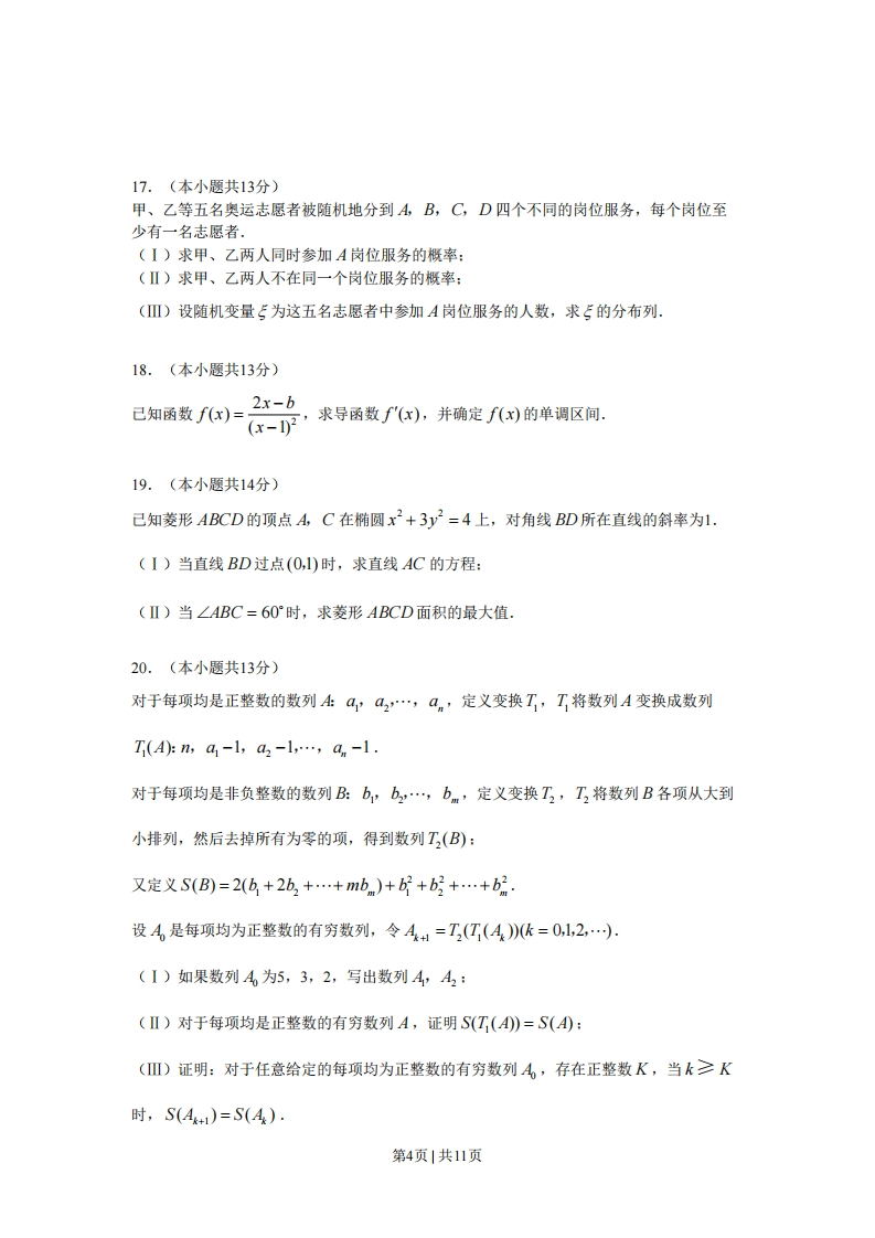 2008年普通高等学校招生全国统一考试数学(理工农医类)(北京卷)本试卷分第I卷(选择题)和第Ⅱ卷(非选择题)两部分,第I卷1至2页,第Ⅱ卷3至9页,共150分.考试时间120分钟.考试结束,将本试卷和答题卡一并交回.第I卷(选择题共40分)注意事项:1.答第I卷前,考生务必将自己的姓名、准考证号、考试科目涂写在答题卡上2.每小题选出答案后,用铅笔把答题卡上对应题目的答案标号涂黑.如需改动,用橡皮擦干净后,再选涂其他答案.不能答在试卷上,一、本大题共8小题,每小题5分,共40分。在每小题列出的四个选项中,选出符合题目要求的一项.1.已知全集U=R,集合A={x-2≤x≤3},B={x|x<-1或x>4},那么集合A∩(B)等于()A.{x-2≤x<4}B.{x|x≤3或x≥4C.{x-2≤x<-l}D.{x-1≤x≤3}2π2.若a=205,b=log.3,c=sin兮,则()A.a>b>cB.b>a>cC.c>a>bD.b>c>a3.“函数f(x)(x∈R)存在反函数”是“函数f(x)在R上为增函数”的()A.充分而不必要条件B.必要而不充分条件C.充分必要条件D.既不充分也不必要条件4.若点P到直线x=-1的距离比它到点(2,0)的距离小1,则点P的轨迹为()A.圆B.椭圆C.双曲线D.抛物线x-y+1≥0,5.若实数x,y满足{x+y≥0,则z=3+2y的最小值是()x≤0,A.0B.1c.5D.96.已知数列{an}对任意的p,9∈N满足ap+g=ap+ag,且a2=6,那么ao等于(第1页1共11页A.-165B.-33C.-30D.-217.过直线y=x上的一点作圆(x-5)2+(y-1)2=2的两条切线,,当直线,关于y=x对称时,它们之间的夹角为()A.30B.45C.60D.90°8.如图,动点P在正方体ABCD-A,B,CD的对角线BD上.过点P作垂直于平面BBDD的直线,与正方体表面相交于M,N.设BP=x,MN=y,则函数y=f(x)的图象大致是()2008年普通高等学校招生全国统一考试数学(理工农医类)(北京卷)第Ⅱ卷(共110分)注意事项:1.用钢笔或圆珠笔将答案直接写在试卷上.2.答卷前将密封线内的项日填写清楚。二、填空题:本大题共6小题,每小题5分,共30分.把答案填在题中横线上,9.已知(a-i)2=2i,其中i是虚数单位,那么实数a=一10.己知向量a与b的夹角为120°,且4=l=4,那么b(2a+b)的值为11.若展开式的各项系数之和为32,则n=】其展开式中的常数项为·(用数字作答)12.如图,函数f(x)的图象是折线段ABC,其中A,B,C的坐标分别为(04)(2,0)64),则f(f(0)=第2页1共11页0123456limf1+△)-f四=(用数字作答)4r→0△x13.已知函数f(x)=x2-cosx,对于[上的任意x,x2,有如下条件:①x>x2:②x>x号:国>x2其中能使f(x)>f(x2)恒成立的条件序号是14.某校数学课外小组在坐标纸上,为学校的一块空地设计植树方案如下:第k棵树种植在点P(x,y)处,其中x=1,片=1,当k≥2时,=+1-7)-(y=y+T-T(a)表示非负实数a的整数部分,例如T(2.6)=2,T(0.2)=0.按此方案,第6棵树种植点的坐标应为:第2008棵树种植点的坐标应为三、解答题:本大题共6小题,共$0分。解答应写出文字说明,演算步骤或证明过程。15.(本小题共13分)己知函数f(x)=sin2ox+√3 sin@xsin(0>0)的最小正周期为π.(I)求@的值:(Ⅱ)求函数f(x)在区间上的取值范围.316.(本小题共14分)如图,在三棱锥P-ABC中,AC=BC=2,∠ACB=90°,AP=BP=AB,PC⊥AC.(I)求证:PC⊥AB:(Ⅱ)求二面角B-AP-C的大小:(I)求点C到平面APB的距离.第3页1共11页