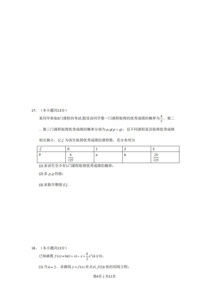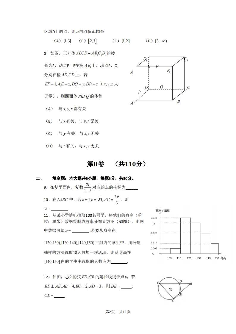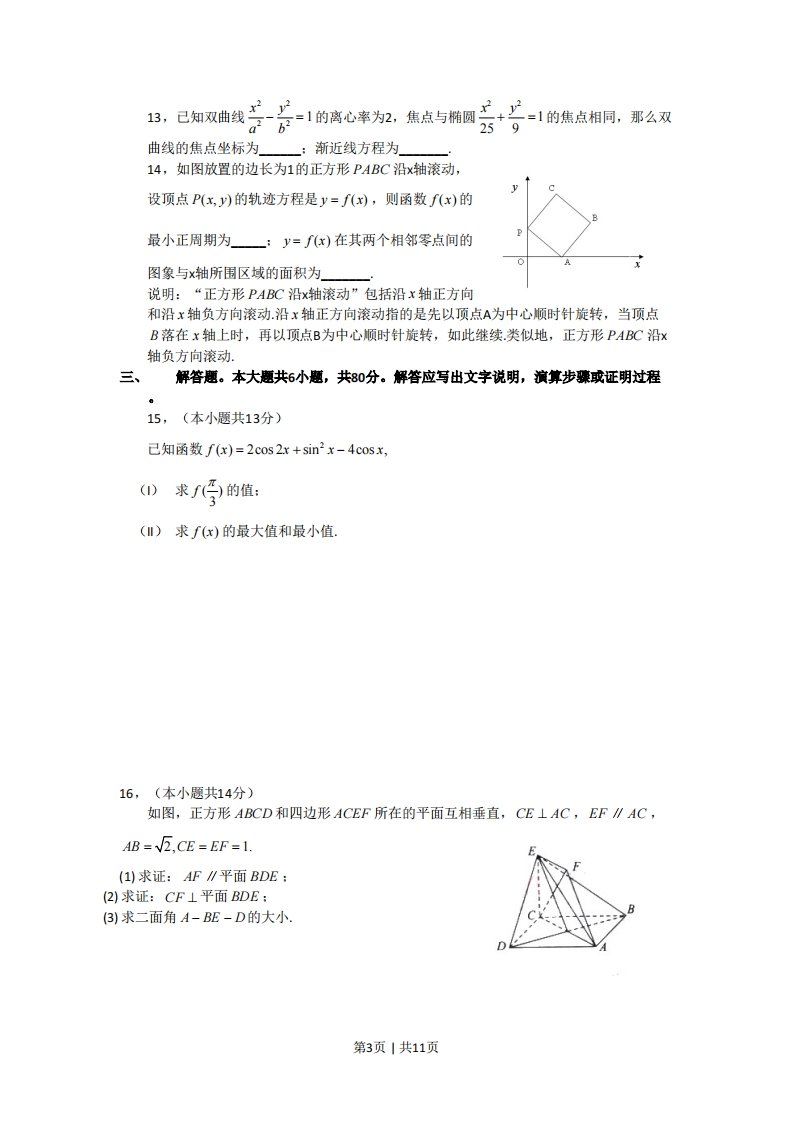 2010年普通高等学校招生全国统一考试数学(理)第1卷选择题(共40分)一、本大题共8小题,每小题5分,共40分。在年小题列出的4个选项中,选出符合题目要求的一项。1,集合P={x∈ZI0≤x<3},M={x∈R|x2≤9},则P∩M=(A){L,2}(B){0,1,2}(c){xI0≤x<3}(D){x0≤x≤3}2,在等比数列{an}中,4=1,公比q≠1若am=a,424,a,a5,则m=(A)9(B)10(c)11(D)123,一个长方体去掉一个小长方体,所得集合体的正(主)视图与侧(左)视图分别如右图所示,则该几何体的俯视图为正(主)视侧(左)视4,8名学生和2位老师站成一排合影,2位老师不相邻的排法总数为(A)(B)AC(c)A4号(D)AC5,极坐标方程(p-1(0-π)=0(p≥0)表示的图形是(A)两个圆(B)两条直线(c)一个圆和一条射线(D)一条直线和一条射线6,a,b为非零向量,“a⊥”是“函数f(x)=(xa+b(xb-a为一次函数”的(A)充分而不必要条件(B)必要而不充分条件(C)充分必要条件(D)既不充分也不必要条件x+y-11207,设不等式组3x-y+3≥0表示的平面区域为D,若指数函数y=的图象上存在5x-3y+9≤0第1页1共11页区域D上的点,则a的取值范围是(A)1,31(B)[2,3](c)1,2](D)[3,+0)8,如图,正方体ABCD-A,B,C,D的棱长为2,动点E,在棱AB上,动点P,QB分别在棱AD,CD上,若AEF=1,AE=x,DO=y,DP=z (x,y,于零),则四面体PEFQ的体积B(A)与x,片:都有关(B)与x有关,与y,:无关(C)与y有关,与x,z无关(D)与:有关,与x,y无关第卷(共110分)二、填空题:本大题共6小题,每题5分,共30分。9,在复平面内,复数艺对应的点的坐标为—]10,在a1BC中,若b=lc=5,∠C=号,则q=顿率/组距11,从某小学随机抽取100名同学,将他们的身高(单0.035位:厘米)数据绘制成频率分布直方图(如图),由图中数据可知a=.若要从身高在0.020[120,130),[130,140),[140,150)三组内的学生中,用分层0.0100.005抽样的方法选取18人参加一项活动,则从身高在0100110120130140150身高[140,150]内的学生中选取的人数应为一12,如图,⊙0的弦ED,CB的延长线交于点A,若BD⊥AE,AB=4,BC=2,AD=3,则DE=一CE=第2页1共11页13,己知双曲线卡=1的高心率为加,焦点与椭圆云号1的焦点相同,那么双x2 y259曲线的焦点坐标为一:渐近线方程为14,如图放置的边长为1的正方形PABC沿x轴滚动,设顶点P(x,y)的轨迹方程是y=f(x),则函数f(x)的最小正周期为一:y=f(x)在其两个相邻零点间的图象与x轴所围区域的面积为说明:“正方形PABC沿x轴滚动”包括沿x轴正方向和沿x轴负方向滚动.沿x轴正方向滚动指的是先以顶点A为中心顺时针旋转,当顶点B落在x轴上时,再以顶点B为中心顺时针旋转,如此继续类似地,正方形PABC沿x轴负方向滚动:三、解答题。本大题共6小题,共80分。解答应写出文字说明,演算步骤或证明过程15,(本小题共13分)己知函数f(x)=2cos2x+sin2x-4cosx,①求孕的值:(I)求f(x)的最大值和最小值,16,(本小题共14分)如图,正方形ABCD和四边形ACEF所在的平面互相垂直,CE⊥AC,,EF∥AC,AB =2,CE EF =1.(1)求证:AF∥平面BDE:(2)求证:CF⊥平面BDE:(3)求二面角A-BE-D的大小.第3页1共11页