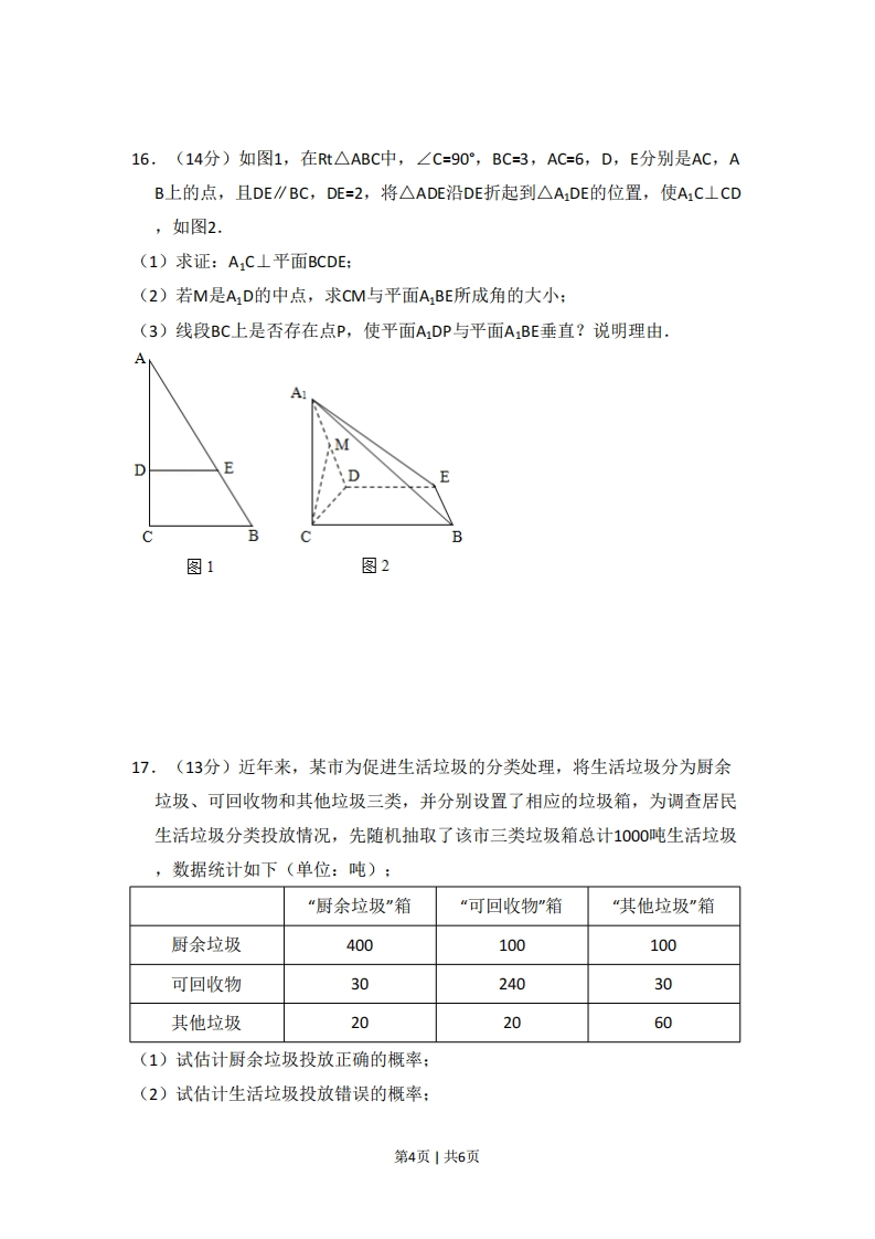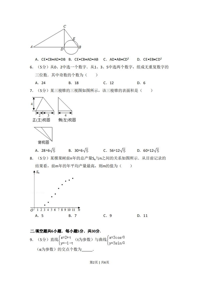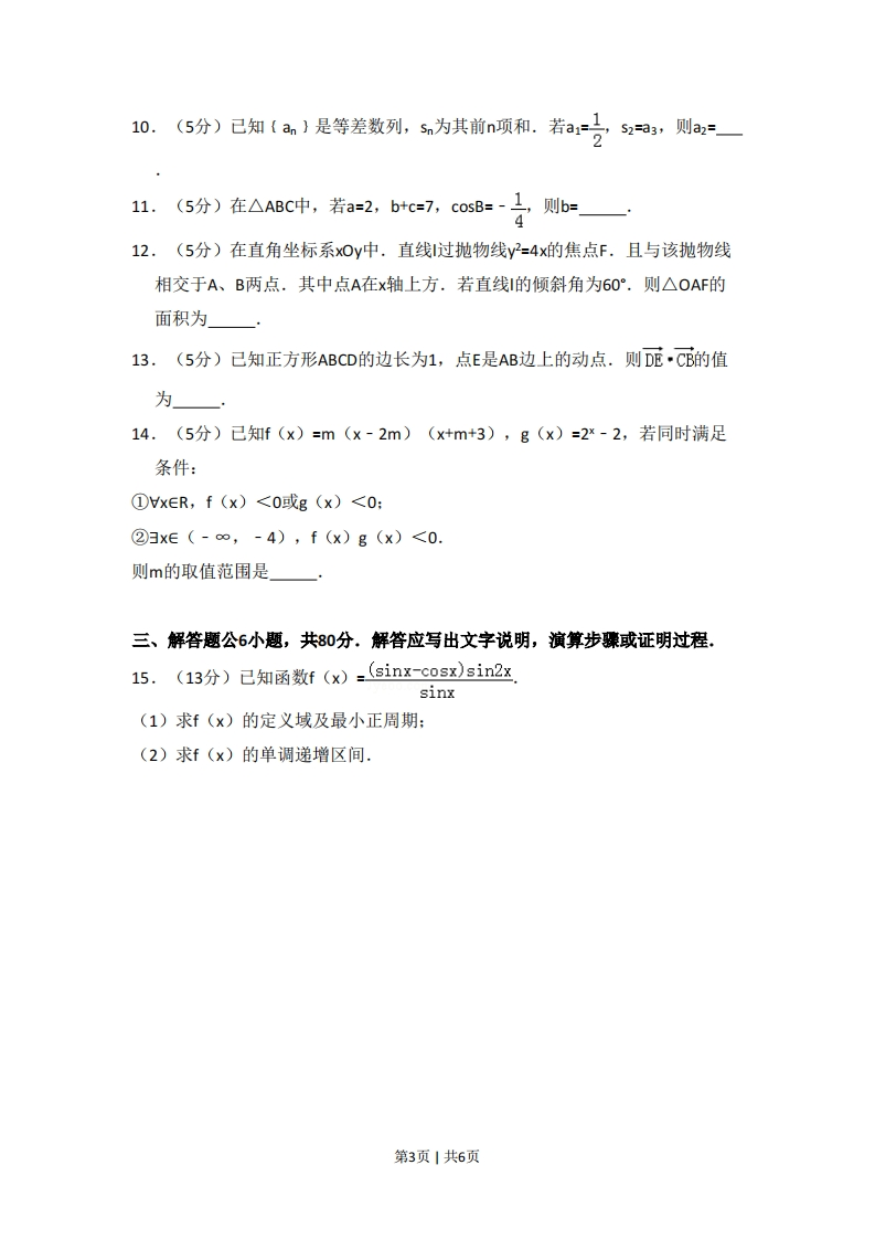 2012年北京市高考数学试卷(理科)一、选择题共8小题.每小题5分.共40分.在每小题列出的四个选项中,选出符合胜目要求的一项1.(5分)已知集合A={x∈R3x+2>0},B={x∈R(x+1)(x-3)>O},则A∩B=()A(-,-1)B.(-1,3C.(号3)D.(3,+∞)2.(5分)设不等式组「0x≤2表示的平面区域为D,在区域D内随机取一个0≤y≤2点,则此点到坐标原点的距离大于2的概率是()A.B.π-2D.4-π4C.B43.(5分)设a,bER.“a=0"是"复数a+bi是纯虚数"的()A.充分而不必要条件B.必要而不充分条件C.充分必要条件D.既不充分也不必要条件4.(5分)执行如图所示的程序框图,输出的S值为()开始=1,s=1k=k+15=5X2<3输出s结束A.2B.4C.8D.165.(5分)如图,∠ACB=90°,CD⊥AB于点D,以BD为直径的圆与BC交于点E.则()第1页1共6页DA.CECB=AD·DBB.CE·CB=AD.AB C.ADAB=CD2D.CE·EB=CD26.(5分)从0、2中选一个数字.从1、3、5中选两个数字,组成无重复数字的三位数.其中奇数的个数为()A.24B.18C.12D.67.(5分)某三棱锥的三视图如图所示,该三棱锥的表面积是()3正(主)视图侧(左)视图俯视图A.28+6V5B.30+6V5C.56+12W5D.60+12W58.(5分)某棵果树前n年的总产量S,与n之间的关系如图所示.从目前记录的结果看,前m年的年平均产量最高,则m的值为()S012345678910112A.5B.7C.9D.11二填空题共6小题。每小题5分.共30分.9.(5分)直线x=2+t(t为参数)与曲线x=3c0sCy-1-ty=3sina(α为参数)的交点个数为第2页1共6页10。(5分)已知《a)是等差数列,s为其前n项和.若a号5司,则a=11.(5分)在△ABC中,若a=2,b+c=7,cosB=-马,则b=·412.(5分)在直角坐标系xOy中,直线过抛物线y2=4x的焦点F.且与该抛物线相交于A、B两点.其中点A在x轴上方,若直线I的倾斜角为60°.则△OAF的面积为一·13.(5分)已知正方形ABCD的边长为1,点E是AB边上的动点.则DE·CB的值为一14.(5分)已知f(x)=m(x-2m)(x+m+3),g(x)=2x-2,若同时满足条件:①Hx∈R,f(x)<0或g(x)<0:②3xe(-∞,-4),f(x)g(x)<0.则m的取值范围是三、解答题公6小题,共80分。解答应写出文字说明,演算步骤或证明过程。15.(13分)已知函数f(x)=(sinx-cosx)sin2xsinx(1)求f(x)的定义域及最小正周期:(2)求f(x)的单调递增区间.第3页1共6页