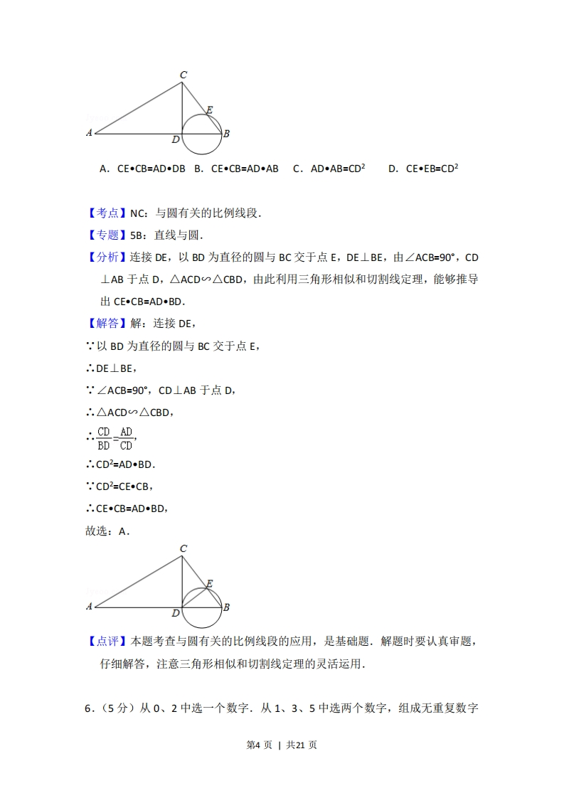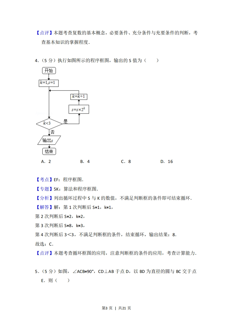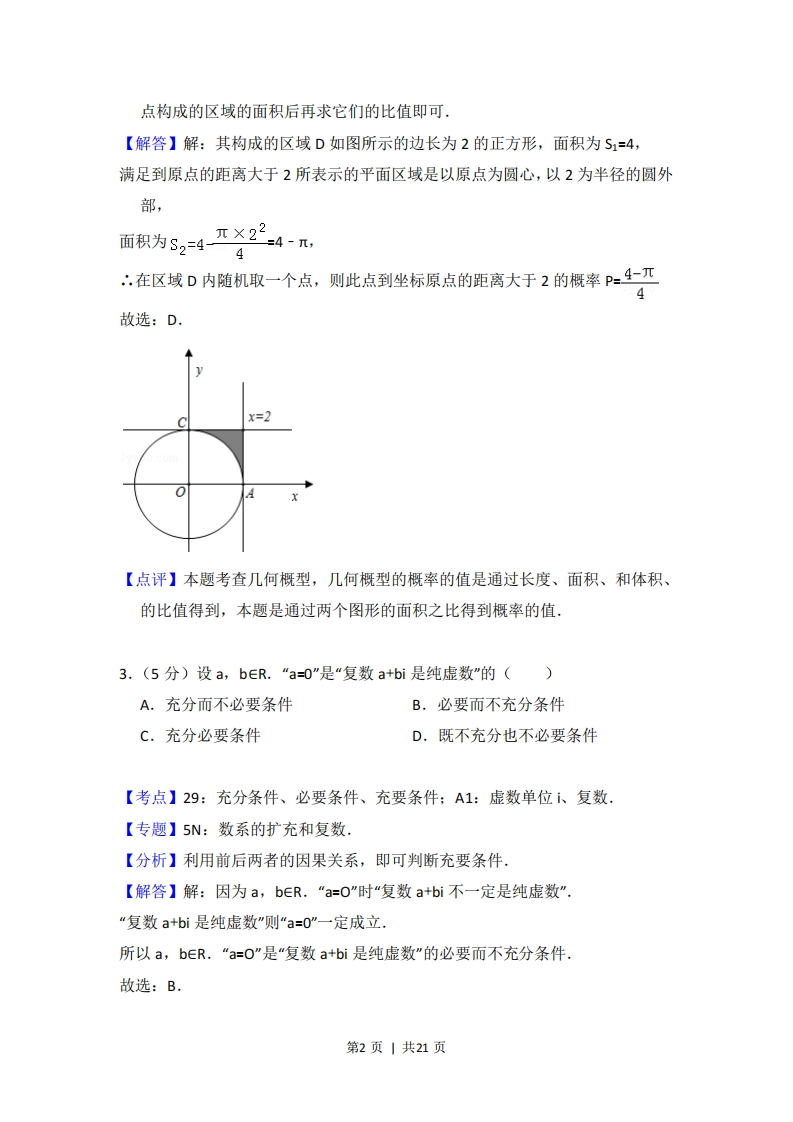 2012年北京市高考数学试卷(理科)考答来与试题解析一、选择题共8小题.每小题5分.共40分在年小题列出的四个选项中,选出符合胜目要求的一项。1.(5分)已知集合A={xER3x+2>0},B={x∈R(x+1)(x-3)>0},则A∩B=()A.∞,-1)B。(1,3c.(,3)D.(3,+∞)【考点】1E:交集及其运算:73:一元二次不等式及其应用.【专题】5:集合.【分析】求出集合B,然后直接求解A∩B.【解答】解:因为B={xER(x+1)(x-3)>0}={xx<-1或x>3},又集合A=el3x2>01=xx>号,所以AnB={xx>召)n{xx<-1或x>3}={xx>3},故选:D【点评】本题考查一元二次不等式的解法,交集及其运算,考查计算能力.2.(5分)设不等式组0心x≤2表示的平面区域为D,在区域D内随机取一个0≤y≤2点,则此点到坐标原点的距离大于2的概率是()A买B.π-22C.D.4-r64【考点】7B:二元一次不等式(组)与平面区域:cF:几何概型.【专题】5:概率与统计.【分析】本题属于几何概型,利用“测度”求概率,本例的测度即为区域的面积,故只要求出题中两个区域:由不等式组表示的区域和到原点的距离大于2的第1页|共21页点构成的区域的面积后再求它们的比值即可.【解答】解:其构成的区域D如图所示的边长为2的正方形,面积为S1=4,满足到原点的距离大于2所表示的平面区域是以原点为圆心,以2为半径的圆外部,面积为S2=4一×22-4-,∴在区域D内随机取一个点,则此点到坐标原点的距离大于2的概率P=4兀4故选:D.X=2【点评】本题考查几何概型,几何概型的概率的值是通过长度、面积、和体积、的比值得到,本题是通过两个图形的面积之比得到概率的值,3.(5分)设a,bER.“a=0"是“复数a+bi是纯虚数"的()A.充分而不必要条件B.必要而不充分条件C.充分必要条件D.既不充分也不必要条件【考点】29:充分条件、必要条件、充要条件:A1:虚数单位i、复数.【专题】5N:数系的扩充和复数.【分析】利用前后两者的因果关系,即可判断充要条件【解答】解:因为a,bER.“a=O"时“复数a+bi不一定是纯虚数".“复数a+bi是纯虚数"则“a=0”一定成立.所以a,bER.“a=O”是“复数a+bi是纯虚数"的必要而不充分条件.故选:B.第2页|共21页【点评】本题考查复数的基本概念,必要条件、充分条件与充要条件的判断,考查基本知识的掌握程度,4.(5分)执行如图所示的程序框图,输出的S值为()开始k=1,s=1k=k+15=5X2水<3输出s结束A.2B.4C.8D.16【考点】EF:程序框图.【专题】5K:算法和程序框图.【分析】列出循环过程中S与K的数值,不满足判断框的条件即可结束循环【解答】解:第1次判断后S=1,k=1,第2次判断后S=2,k=2,第3次判断后S=8,k=3,第4次判断后3<3,不满足判断框的条件,结束循环,输出结果:8.故选:C.【点评】本题考查循环框图的应用,注意判断框的条件的应用,考查计算能力.5,(5分)如图,∠ACB=90°,CD⊥AB于点D,以BD为直径的圆与BC交于点E.则()第3页|共21页