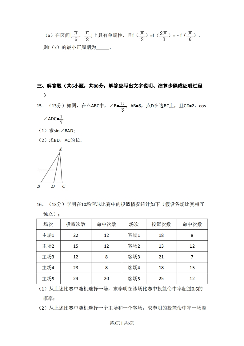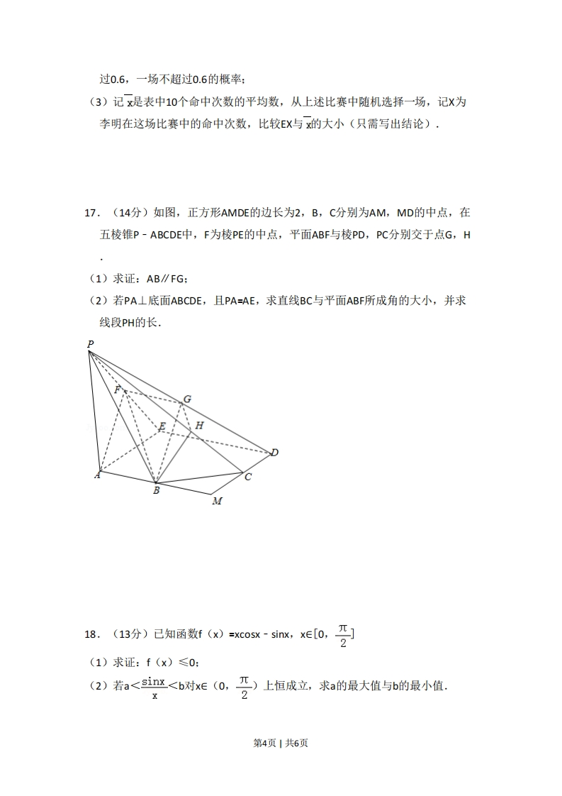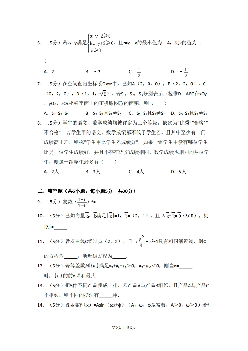 2014年北京市高考数学试卷(理科)一、选择题(共8小题,每小题5分,共40分.在每小题列出的四个选项中,选出符合题目要求的一项)1.(5分)已知集合A={xx2-2x=0},B={0,1,2},则A∩B=()A.(0}B.{0,1}C.{0,2}D.{0,1,2}2.(5分)下列函数中,在区间(0,+∞)上为增函数的是()A.y=Vx+1B.y=(x-1)2C.y=2-xD.y=logo.s (x+1)3.(5分)曲线x-1+c0s日(日为参数)的对称中心()y=2+sin日A.在直线y=2x上B.在直线y=-2x上C.在直线y=x-1上D.在直线y=x+1上4.(5分)当m=7,n=3时,执行如图所示的程序框图,输出的S的值为(开始输入m,n的值k=m,S=1K=k-1否S=S*k输出S结束A.7B.42C.210D.8405.(5分)设{an}是公比为q的等比数列,则“q>1”是“{an}为递增数列"的()A.充分而不必要条件B.必要而不充分条件C.充分必要条件D.既不充分也不必要条件第1页1共6页x+y-206.(5分)若x,y满足kxy+2>0,且z=y-x的最小值为-4,则k的值为((y0)A.2B.-2C.0.7.(5分)在空间直角坐标系0xyz中,已知A(2,0,0),B(2,2,0),C(0,2,0),D(1,1,√2),若S1,S2,S3分别表示三棱锥D-ABC在xOy,yOz,Ox坐标平面上的正投影图形的面积,则()A.S1=S2=S3B.S2=S1且S2≠S3C.S3=S1且S3≠S2D.S3=S2且S3≠S18.(5分)学生的语文、数学成绩均被评定为三个等级,依次为“优秀”“合格”“不合格”.若学生甲的语文、数学成绩都不低于学生乙,且其中至少有一门成绩高于乙,则称“学生甲比学生乙成绩好”,如果一组学生中没有哪位学生比另一位学生成绩好,并且不存在语文成绩相同、数学成绩也相同的两位学生,则这一组学生最多有()A.2人B.3人C.4人D.5人二、填空题(共6小题,每小题5分,共30分)9.(5分)复数(1柱)2=一1-i10.(5分)已知向量a,b满足1a=1,=(2,1),且入=0(ER),则λ=11.(5分)设双曲线c经过点(2,2》,且与y2-x1具有相同渐近线,则c4的方程为;渐近线方程为12.(5分)若等差数列{a}满足a+ag+ag>0,a7+a1o<0,则当n=时,{an}的前n项和最大.13.(5分)把5件不同产品摆成一排,若产品A与产品B相邻,且产品A与产品C不相邻,则不同的摆法有种.14,(5分)设函数f(x)=Asin(wx+中)(A,w,中是常数,A>0,w>0)若f第2页1共6页(x)在区间零]上具有单调性,且(空)f(2变)f(否),236则F(x)的最小正周期为三、解答题(共6小题,共80分,解答应写出文字说明、演算步骤或证明过程)5,(13分)如图,在△ABC中,∠B=7,AB=8,点D在边BC上,且CD=2,cDs∠Aoc号(1)求sin∠BAD:(2)求BD,AC的长.A16,(13分)李明在10场篮球比赛中的投篮情况统计如下(假设各场比赛相互独立):场次投篮次数命中次数场次投篮次数命中次数主场12212客场1188主场21512客场21312主场3128客场3217主场4238客场41815主场52420客场52512(1)从上述比赛中随机选择一场,求李明在该场比赛中投篮命中率超过0.6的概率;(2)从上述比赛中随机选择一个主场和一个客场,求李明的投篮命中率一场超第3页1共6页