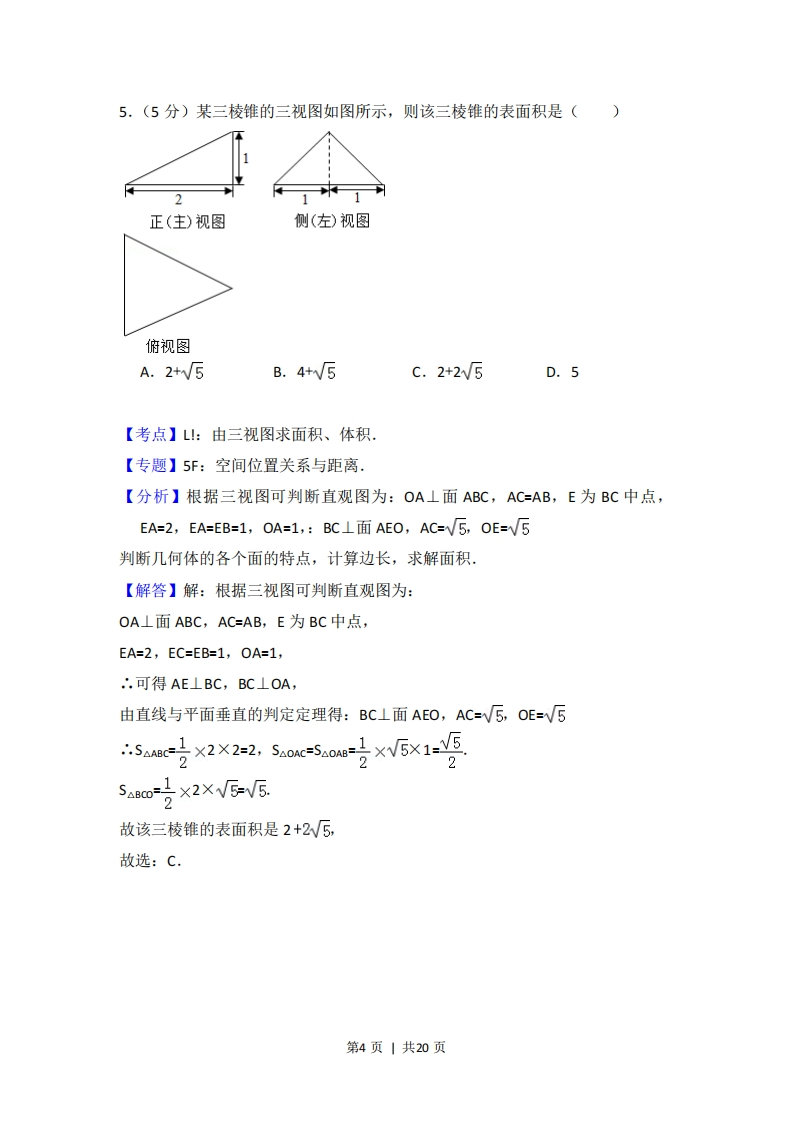 2015年北京市高考数学试卷(理科)事考答来与试想解析一、选择题(每小题5分,共40分)1.(5分)复数i(2-i)=()A.1+2iB.1-2iC.-1+2iD.-1-2i【考点】A5:复数的运算.【专题】5N:数系的扩充和复数【分析】利用复数的运算法则解答.【解答】解:原式=2i-i2=2i-(-1)=1+2i:故选:A.【点评】本题考查了复数的运算:关键是熟记运算法则.注意2=-1.xy≤02.(5分)若×,y满足{x+y<1,则z=x+2y的最大值为()(x0A.0B.1c.D.2【考点】7C:简单线性规划.【专题】59:不等式的解法及应用.【分析】作出题中不等式组表示的平面区域,再将目标函数z=x+2y对应的直线进行平移,即可求出z取得最大值x-y0【解答】解:作出不等式组{x+y<1表示的平面区域,x0当I经过点B时,目标函数z达到最大值∴.2最大值=0+2X1=2.故选:D第1页|共20页【点评】本题给出二元一次不等式组,求目标函数z=x+2y的最大值,着重考查了二元一次不等式组表示的平面区域和简单的线性规划等知识,属于基础题.3.(5分)执行如图所示的程序框图输出的结果为()开始x=1,Jy=1,k=0s=x-V,t=x+vX=5,y=1k=k+1k≥3否上是输出(x,)结束A.(-2,2)B.(-4,0)C.(-4,-4)D.(0,-8)【考点】EF:程序框图【专题】5K:算法和程序框图」【分析】模拟程序框图的运行过程,即可得出程序运行后输出的结果.【解答】解:模拟程序框图的运行过程,如下:x=1,y=1,k=0时,S=x-y=0,t=xty=2:第2页|共20页X=S=0,y=t=2,k=1时,s=x-y=-2,t=x+y=2;x=5=-2,y=t=2,k=2时,s=x-y=-4,t=x+y=0:X=5=-4,y=t=0,k=3时,循环终止,输出(x,y)是(-4,0).故选:B.【点评】本题考查了程序框图的应用问题,解题时应模拟程序框图的运行过程,是基础题目.4.(5分)设a,B是两个不同的平面,m是直线且mca,“m∥B“是“"a∥B"的()A.充分而不必要条件B.必要而不充分条件C.充分必要条件D.既不充分也不必要条件【考点】29:充分条件、必要条件、充要条件,【专题】5L:简易逻辑,【分析】m∥B并得不到a∥B,根据面面平行的判定定理,只有a内的两相交直线都平行于B,而a∥B,并且mca,显然能得到m∥B,这样即可找出正确选项、【解答】解:mca,m∥B得不到a∥B,因为a,B可能相交,只要m和a,B的交线平行即可得到m∥B:a∥B,mca,.m和B没有公共点,∴.m∥B,即a∥B能得到m∥B:∴.“m∥B"是“a∥B”的必要不充分条件.故选:B.【点评】考查线面平行的定义,线面平行的判定定理,面面平行的定义,面面平行的判定定理,以及充分条件、必要条件,及必要不充分条件的概念.第3页|共20页