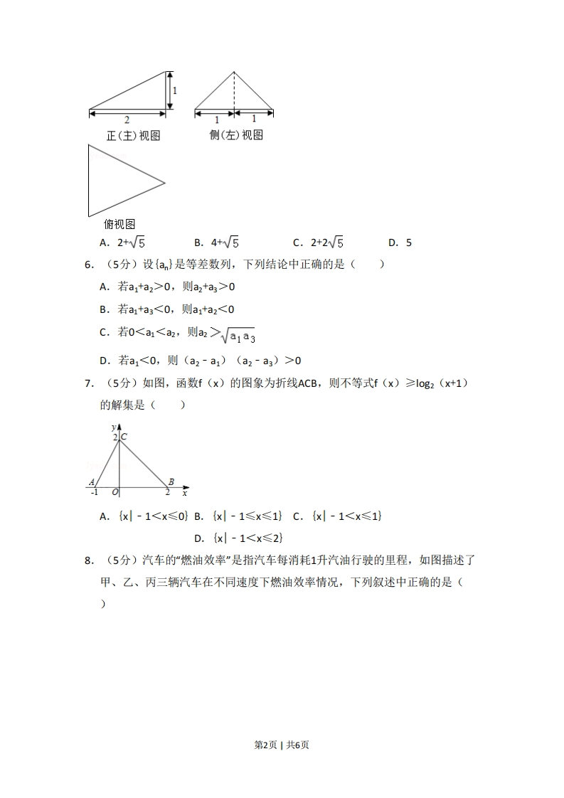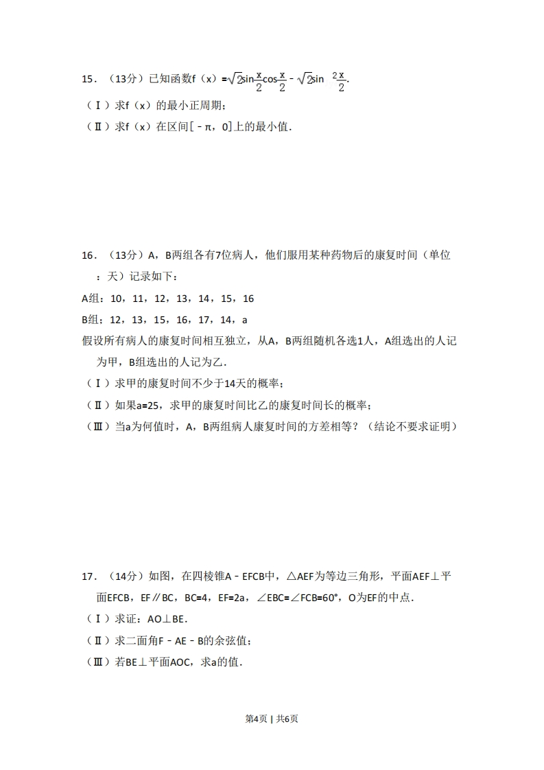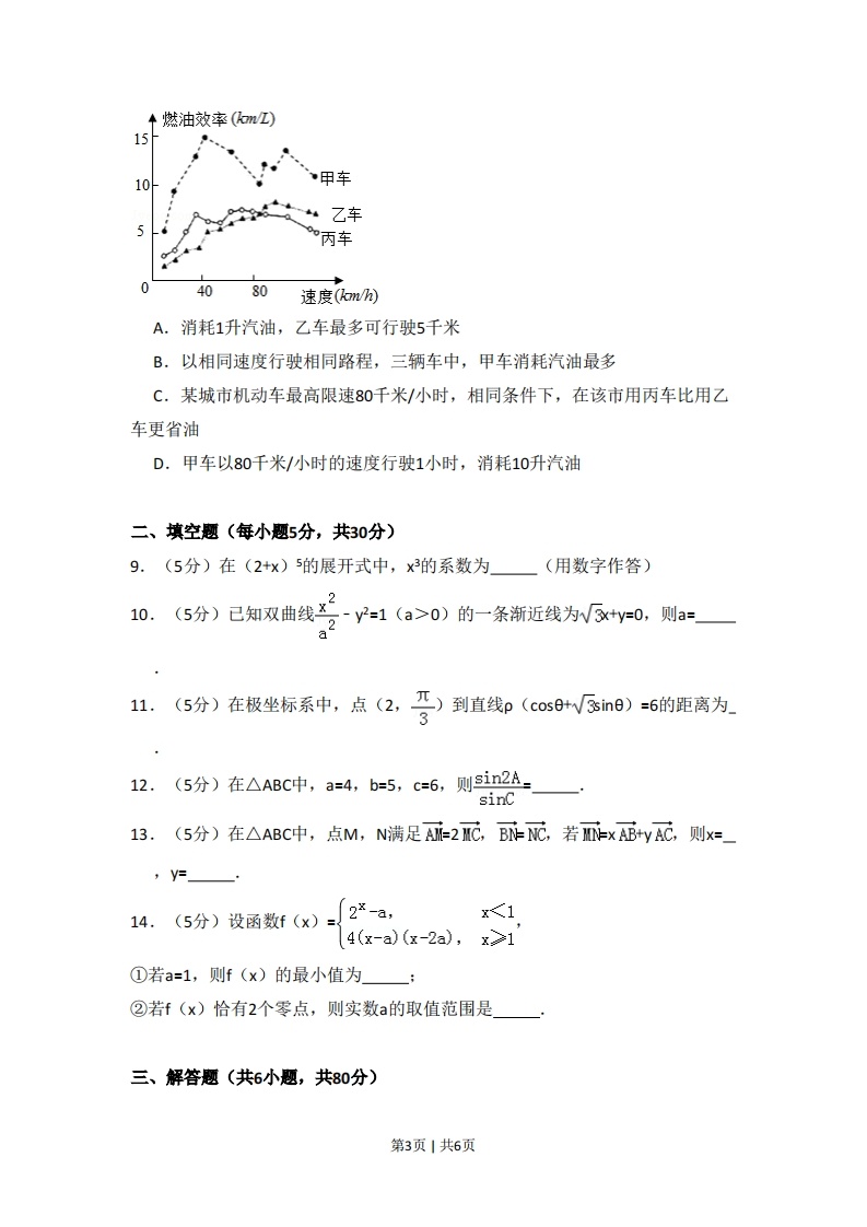 √a1a3D.若a1<0,则(a2-a1)(a2-a3)>07.(5分)如图,函数f(x)的图象为折线ACB,则不等式f(x)≥og2(x+1)的解集是()B-10A.{x|-10)的一条渐近线为5x+y-0,则a=11.(5分)在极坐标系中,点(2,兀)到直线p(cos+√sin)=6的距离为312.(5分)在△ABC中,a=4,b=5,c=6,则in2A=sinC13.(5分)在△ABC中,点M,N满足A=2元,BN,若x AB+y AC,则x=,ye14.(5分)设函数f(x)=。2x-a,x<14(x-a)(x-2a),x1①若a=1,则f(x)的最小值为②若f(x)恰有2个零点,则实数a的取值范围是三、解答题(共6小题,共80分)第3页1共6页