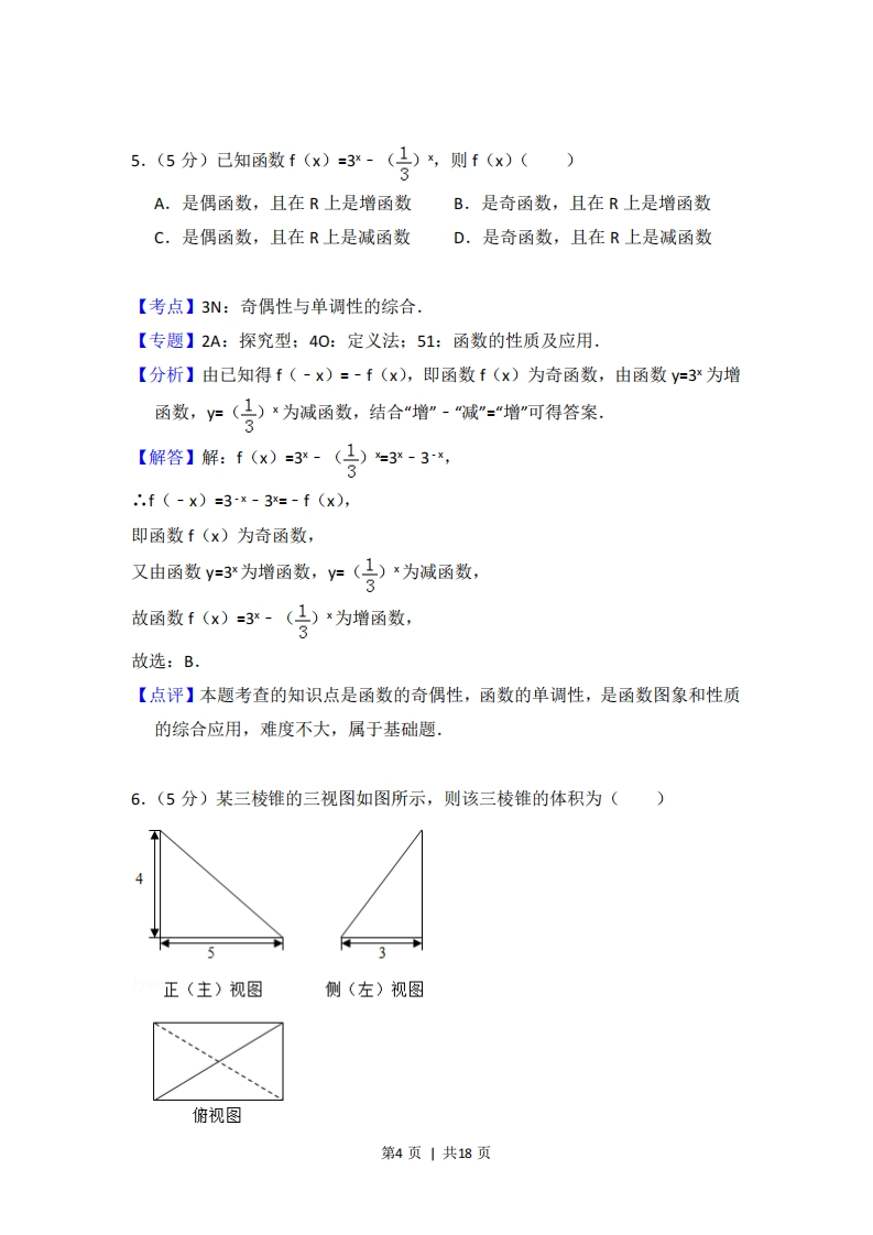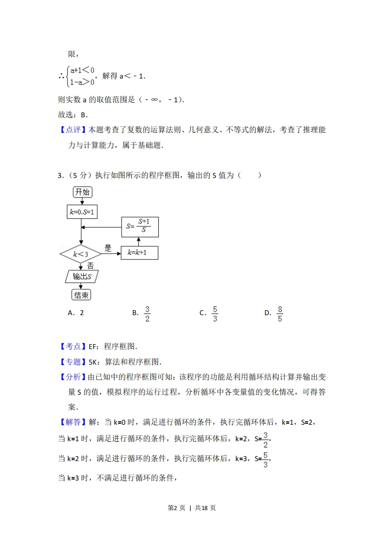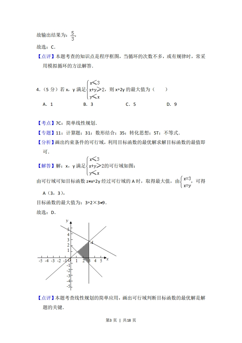 2017年北京市高考数学试卷(文科)考答来与试题解折一、选择题1.(5分)已知全集U=R,集合A={xx<-2或x>2},则CuA=()A.(-2,2)B.(-∞,-2)U(2,+∞)C.[-2,2]D.(-∞,-2]U[2,+∞)【考点】1F:补集及其运算.【专题】11:计算题:37:集合思想:5:集合.【分析】根据已知中集合A和U,结合补集的定义,可得答案.【解答】解:集合A={xx<-2或x>2}=(-∞,-2)U(2,+∞),全集U=R,∴.CuA=[-2,2],故选:C.【点评】本题考查的知识点是集合的补集及其运算,难度不大,属于基础题,2.(5分)若复数(1-i)(a+i)在复平面内对应的点在第二象限,则实数a的取值范围是()A.(-∞,1)B.(-∞,-1)C.(1,+∞)D.(-1,+∞)【考点】A1:虚数单位i、复数.【专题】35:转化思想:59:不等式的解法及应用:5N:数系的扩充和复数.【分析】复数(1-i)(a+i)=a+1+(1-a)i在复平面内对应的点在第二象限,可得a+1<0,解得a范围.1-a>01【解答】解:复数(1-i)(a+i)=a+1+(1-a)i在复平面内对应的点在第二象第1页1共18页限,:/a1<01-a>0解得a<-1.则实数a的取值范围是(-∞,-1).故选:B.【点评】本题考查了复数的运算法则、几何意义、不等式的解法,考查了推理能力与计算能力,属于基础题,3.(5分)执行如图所示的程序框图,输出的S值为()开始k=0,S-1S+1S=S是k<3=+1上否输出S结束A.2B是C.3【考点】EF:程序框图。【专题】5K:算法和程序框图.【分析】由已知中的程序框图可知:该程序的功能是利用循环结构计算并输出变量S的值,模拟程序的运行过程,分析循环中各变量值的变化情况,可得答案【解答】解:当k=0时,满足进行循环的条件,执行完循环体后,k=1,S=2,当k=1时,满足进行循环的条件,执行完循环体后,k=2,S=3,当k=2时,满足进行循环的条件,执行完循环体后,k=3,S=5,3当k=3时,不满足进行循环的条件,第2页|共18页故输出结果为:故选:C【点评】本题考查的知识点是程序框图,当循环的次数不多,或有规律时,常采用模拟循环的方法解答,x≤34.(5分)若x,y满足{x+y2,则x+2y的最大值为()yxA.1B.3C.5D.9【考点】7C:简单线性规划.【专题】11:计算题:31:数形结合:35:转化思想:5T:不等式.【分析】画出约束条件的可行域,利用目标函数的最优解求解目标函数的最值即可x≤3【解答】解:x,y满足x+y2的可行域如图:yx由可行域可知目标函数z=x2y经过可行域的A时,取得最大值,由=3,可得A(3,3),目标函数的最大值为:3+2×3=9,故选:D.-5-4-3-2-12845【点评】本题考查线性规划的简单应用,画出可行域判断目标函数的最优解是解题的关键.第3页|共18页