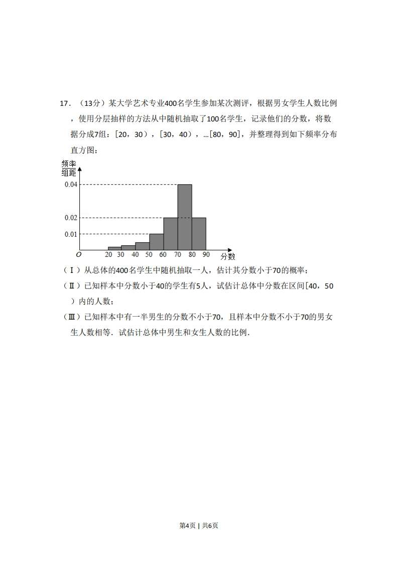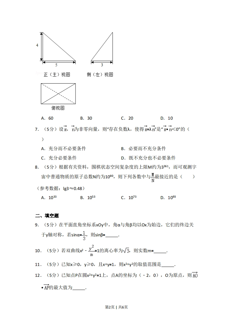 2017年北京市高考数学试卷(文科)一、选择题1.(5分)已知全集U=R,集合A={xx<-2或x>2},则CuA=()A.(-2,2)B.(-∞,-2)U(2,+∞)C.[-2,2]D.(-∞,-2]U[2,+∞)2.(5分)若复数(1-i)(a+i)在复平面内对应的点在第二象限,则实数a的取值范围是()A.(-∞,1)B.(-∞,-1)C.(1,+∞)D.(-1,+∞)3.(5分)执行如图所示的程序框图,输出的S值为()开始k=0,S=1S+1S=-是2,则x+2y的最大值为()yxA.1B.3C.5D.95.(5分)已知函数f(x)=3x-(1)×,则f(x)()3A.是偶函数,且在R上是增函数B.是奇函数,且在R上是增函数C.是偶函数,且在R上是减函数D.是奇函数,且在R上是减函数6.(5分)某三棱锥的三视图如图所示,则该三棱锥的体积为()第1页1共6页5正(主)视图侧(左)视图俯视图A.60B.30C.20D.107.(5分)设m,n为非零向量,则“存在负数入,使得=λ是“<0的(八A.充分而不必要条件B.必要而不充分条件C.充分必要条件D.既不充分也不必要条件8.(5分)根据有关资料,围棋状态空间复杂度的上限M约为361,而可观测宇宙中普通物质的原子总数N约为100,则下列各数中与慧最接近的是()(参考数据:lg3≈0.48)A.1033B.1053C.1073D.1093二、填空题9.(5分)在平面直角坐标系xOy中,角α与角B均以Ox为始边,它们的终边关于y轴对称,若sina=马,则sinB=一·3110.(5分)若双曲线-子=1的离心率为5,则实数m=、11.(5分)已知x≥0,y≥0,且x+y=1,则x2+y2的取值范围是,12.(5分)已知点P在圆x2+y2=1上,点A的坐标为(-2,0),O为原点,则Ad·AP的最大值为一第2页1共6页13,(5分)能够说明“设a,b,c是任意实数.若a>b>c,则a+b>c"是假命题的一组整数a,b,c的值依次为」14.(5分)某学习小组由学生和教师组成,人员构成同时满足以下三个条件:()男学生人数多于女学生人数:(i)女学生人数多于教师人数:()教师人数的两倍多于男学生人数,①若教师人数为4,则女学生人数的最大值为一·②该小组人数的最小值为一三、解答题15.(13分)已知等差数列{an}和等比数列{bn}满足a1=b1=1,a2+a4=10,b2b4=a5(I)求{an}的通项公式:(Ⅱ)求和:b+b3tbs+.+b2n-1:16.(13分)已知函数f(x)=√3cos(2x-兀)-2 2sinxcosx.(1)求f(x)的最小正周期:(D求证:当xE[-开T]时,f(x)≥号44第3页1共6页
