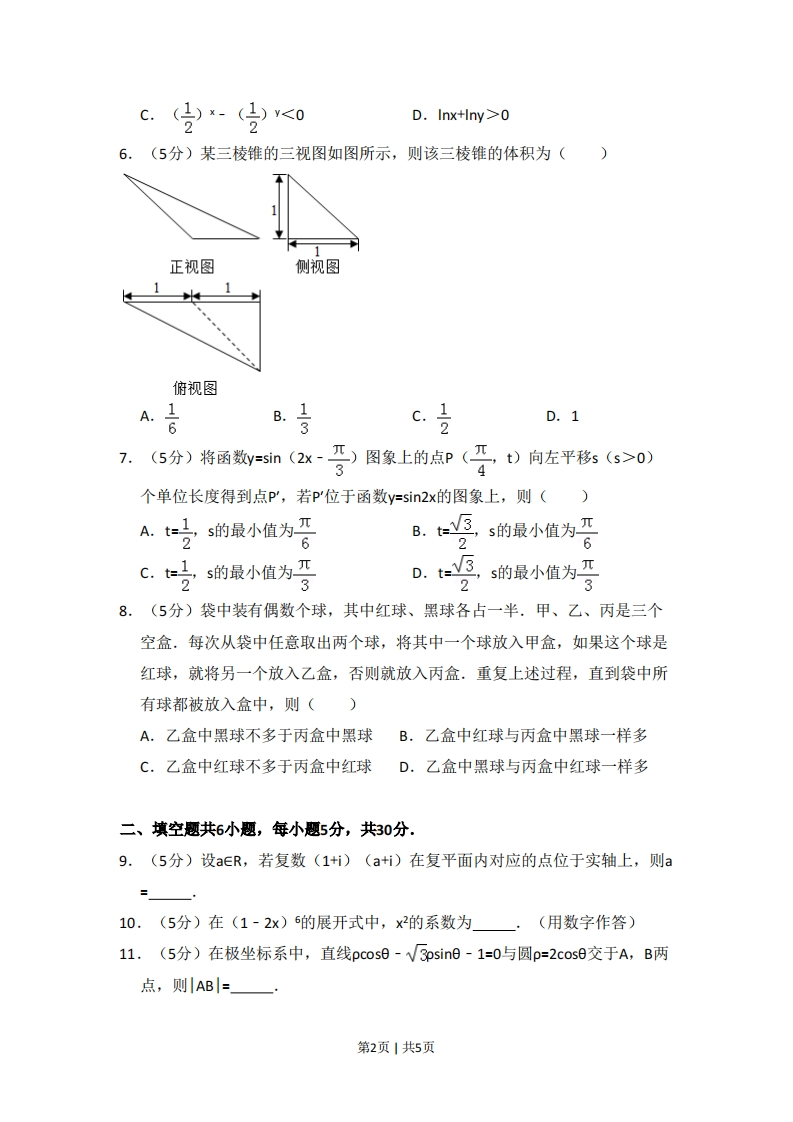 2016年北京市高考数学试卷(理科)一、选择题共8小题,每小题5分,共40分.在每小题列出的四个选项中,选出符合题目要求的一项。1.(5分)已知集合A={xx<2},集合B={-1,0,1,2,3},则A∩B=()A.{0,1}B.{0,1,2}C.{-1,0,1}D.{-1,0,1,2}2xy≤02.(5分)若×,y满足x+y<3,则2x+y的最大值为()(x0A.0B.3C.4D.53.(5分)执行如图所示的程序框图,若输入的a值为1,则输出的k值为(开始输入ak=0b=a-1a=1+ak=k+1Q=6否¥是输出k结束A.1B.2C.3D.44.(5分)设a,是向量,则叫al=6"是“b6=a-6"的()A.充分而不必要条件B.必要而不充分条件C.充分必要条件D.既不充分也不必要条件5.(5分)已知x,yeR,且x>y>0,则()A.1-1>0B.sinx -siny>0x y第1页1共5页C.()x-(1)<0D.Inx+Iny>022.(5分)某三棱锥的三视图如图所示,则该三棱锥的体积为()正视图侧视图俯视图A合c号D.17.(5分)将函数y=sin(2x-工)图象上的点p(T,t)向左平移s(s>0)4个单位长度得到点p',若P位于函数y=sin2x的图象上,则()A-宁s的最小值为零B.t=v2s的最小值为6C.号s的最小值为3D.t=V,s的最小值为38.(5分)袋中装有偶数个球,其中红球、黑球各占一半,甲、乙、丙是三个空盒.每次从袋中任意取出两个球,将其中一个球放入甲盒,如果这个球是红球,就将另一个放入乙盒,否则就放入丙盒.重复上述过程,直到袋中所有球都被放入盒中,则()A.乙盒中黑球不多于丙盒中黑球B.乙盒中红球与丙盒中黑球一样多C.乙盒中红球不多于丙盒中红球D.乙盒中黑球与丙盒中红球一样多二、填空题共6小题,每小题5分,共30分.9.(5分)设aeR,若复数(1+i)(a+i)在复平面内对应的点位于实轴上,则a10.(5分)在(1-2x)6的展开式中,x2的系数为·(用数字作答)11,(5分)在极坐标系中,直线pcos0-√3psin日-1=0与圆p=2cos0交于A,B两点,则川AB=一·第2页1共5页12.(5分)已知{a}为等差数列,Sn为其前n项和.若a1=6,a+as=0,则S6一13.(5分)双曲线x2号(a>0,b>0)的新近线为正方形0ABc的边0A一2a,OC所在的直线,点B为该双曲线的焦点.若正方形OABC的边长为2,则a=14.(5分)设函数f(x)=(x3-3x,x