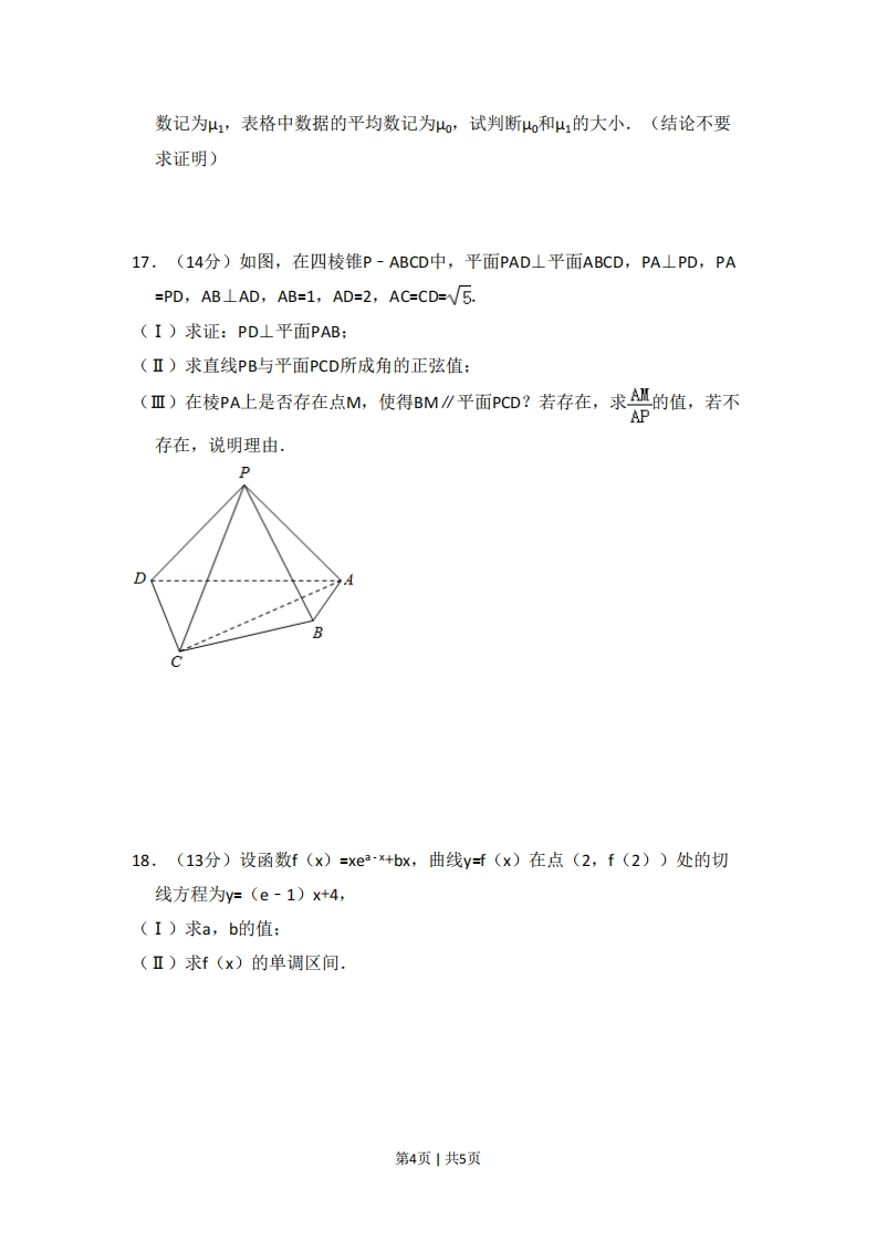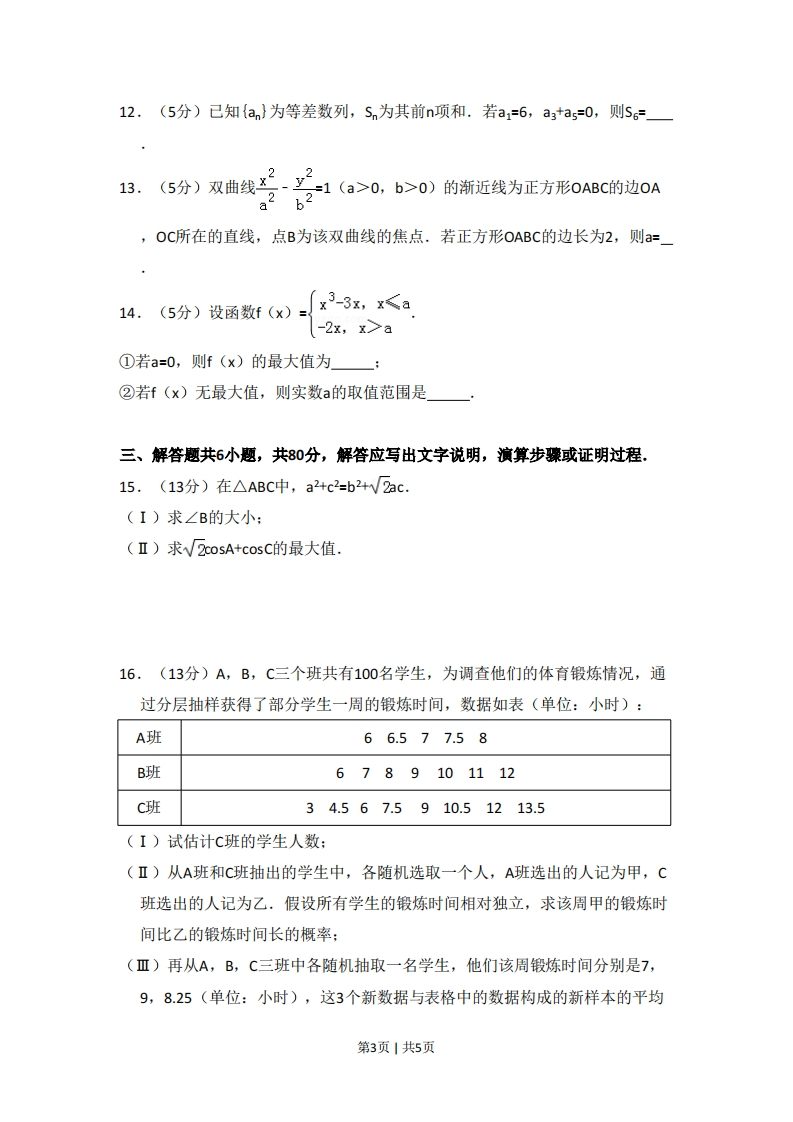 a①若a=0,则f(x)的最大值为:②若f(x)无最大值,则实数a的取值范围是三、解答题共6小题,共80分,解答应写出文字说明,演算步骤或证明过程,15.(13分)在△ABC中,a2+c2=b2+√2ac.(I)求∠B的大小:(Ⅱ)求√2cosA+cosC的最大值.16.(13分)A,B,C三个班共有100名学生,为调查他们的体育锻炼情况,通过分层抽样获得了部分学生一周的锻炼时间,数据如表(单位:小时):A班66.577.58B班6789101112C班34.567.5910.51213.5(I)试估计c班的学生人数:(Ⅱ)从A班和C班抽出的学生中,各随机选取一个人,A班选出的人记为甲,C班选出的人记为乙.假设所有学生的锻炼时间相对独立,求该周甲的锻炼时间比乙的锻炼时间长的概率:(Ⅲ)再从A,B,C三班中各随机抽取一名学生,他们该周锻炼时间分别是7,9,8.25(单位:小时),这3个新数据与表格中的数据构成的新样本的平均第3页1共5页