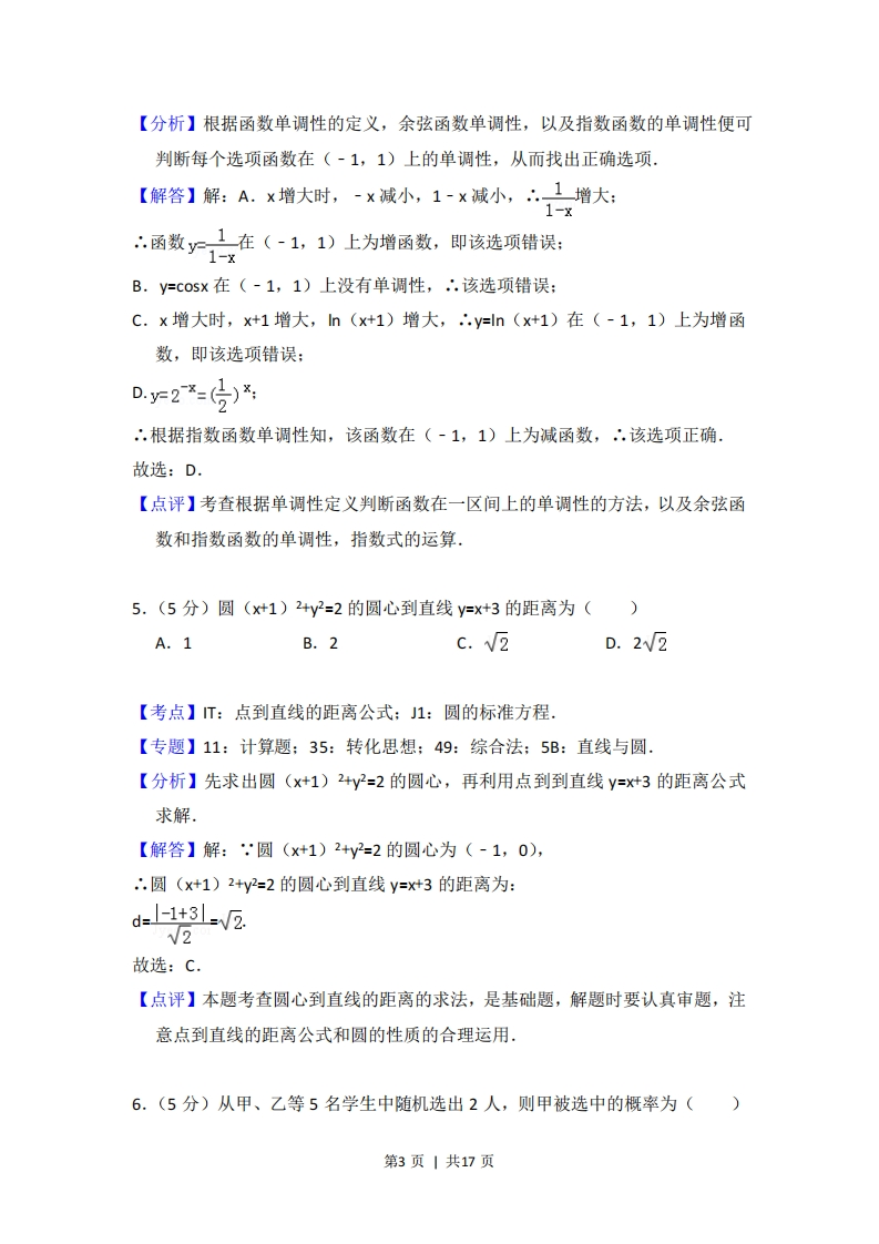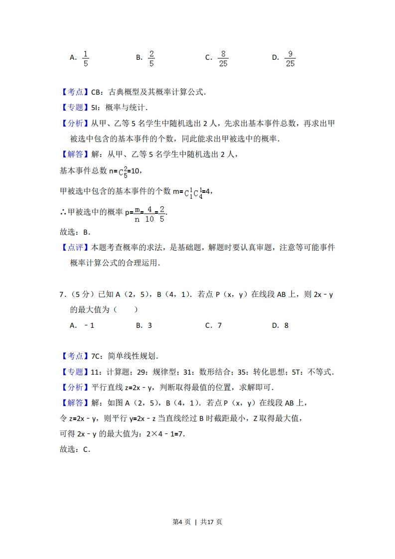 2016年高考数学试卷(文)(北京)(解析卷)虎虎1个月前发布关注0.23MB17页395 第1页 / 共17页 第2页 / 共17页 第3页 / 共17页 第4页 / 共17页 该文档为免费文档,您可直接下载完整版进行阅读 2016年高考数学试卷(文)(北京)(解析卷)此内容为免费资源,请登录后查看¥0 登录查看免费资源THE END数学 文本预览 2016年北京市高考数学试卷(文科)事考答案与试题佩析一、选择题(共8小题,每小题5分,满分40分)1.(5分)已知集合A={x25},则A∩B=()A.{x25}C.{x25}【考点】1E:交集及其运算.【专题】11:计算题;35:转化思想;49:综合法:5:集合.【分析】由已知条件利用交集的定义能求出A∩B.【解答】解:,集合A={x25},.A∩B={x2 查看更多 收起部分 喜欢就支持一下吧点赞5 分享QQ空间微博QQ好友海报分享复制链接收藏 相关推荐 2008年高考数学试卷(理)(四川)(非延考区)(解析卷)2009年高考数学试卷(理)(湖南)(解析卷)2011年高考数学试卷(文)(新课标)(解析卷)2011年高考数学试卷(文)(陕西)(空白卷)2011年高考数学试卷(理)(四川)(解析卷)2016年高考数学试卷(文)(天津)(解析卷)2018年高考数学试卷(文)(新课标Ⅰ)(解析卷)2015年高考数学试卷(文)(浙江)(空白卷)2011年高考数学试卷(文)(北京)(空白卷)