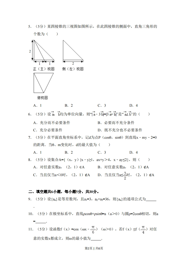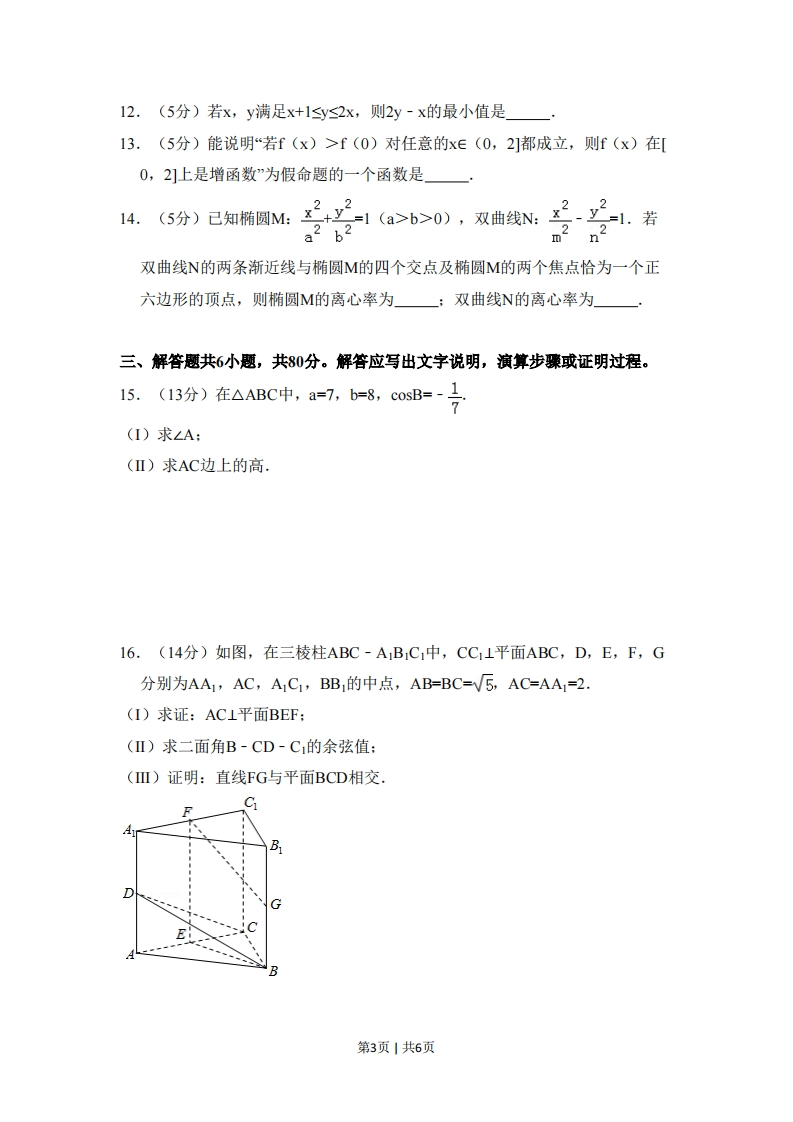 2018年北京市高考数学试卷(理科)一、选择题共8小题,每小题5分,共40分。在每小题列出的四个选项中,选出符合题目要求的一项。1.(5分)已知集合A={xN<2),B={-2,0,1,2;,则AnB=()A.{0,1}B.{-1,0,1}C.{-2,0,1,2}D.{-1,0,1,2}2.(5分)在复平面内,复数1的共轭复数对应的点位于()1-iA.第一象限B.第二象限C.第三象限D.第四象限3.(5分)执行如图所示的程序框图,输出的s值为()开始k=1,s=1+-1)k=k+1k≥3否上是输出结束A号B哥c.4.(5分)“十二平均律”是通用的音律体系,明代朱载堉最早用数学方法计算出半音比例,为这个理论的发展做出了重要贡献,十二平均律将一个纯八度音程分成十二份,依次得到十三个单音,从第二个单音起,每一个单音的频率与它的前一个单音的频率的比都等于12:若第一个单音的频率为,则第八个单音的频率为()A.2B.2C.12fD.127f第1页1共6页5.(5分)某四棱锥的三视图如图所示,在此四棱锥的侧面中,直角三角形的个数为()正(主)视图侧(左)视图俯视图A.1B.2C.3D.46.(5分)设a,b均为单位向量,则a-3=3t是“”的()A.充分而不必要条件B.必要而不充分条件C.充分必要条件D.既不充分也不必要条件7.(5分)在平面直角坐标系中,记d为点P(cos0,sin0)到直线x-my-2=0的距离.当0、m变化时,d的最大值为(A.1B.2C.3D.48.(5分)设集合A={(x,y)x-y2l,ax+y>4,x-ays2},则()A.对任意实数a,(2,1)EAB.对任意实数a,(2,1)EAC.当且仅当a<0时,(2,1)住AD.当且仅当a<3时,(2,1)EA二、填空题共6小题,每小题5分,共30分。9.(5分)设{an}是等差数列,且a1=3,a+a=36,则{a的通项公式为10.(5分)在极坐标系中,直线pcos0+psin0-a(a>0)与圆p=2cos0相切,则a11.(5分)设函数f(x)=cos(Ox-工)(0>0),若f(x)≤f(工)对任6意的实数x都成立,则O的最小值为第2页1共6页12.(5分)若x,y满足x+1y≤2x,则2y-x的最小值是13.(5分)能说明“若f(x)>f(0)对任意的x∈(0,2]都成立,则f(x)在[0,2]上是增函数”为假命题的一个函数是14.(5分)已知椭圆M:x2y21(a≥b>0),双曲线N:子y1.若m2 n22双曲线N的两条渐近线与椭圆M的四个交点及椭圆M的两个焦点恰为一个正六边形的顶点,则椭圆M的离心率为;双曲线N的离心率为一三、解答题共6小题,共80分。解答应写出文字说明,演算步骤或证明过程。15.(13分)在△ABC中,a7,b-8,cosB=号(I)求LA:(Ⅱ)求AC边上的高.16.(14分)如图,在三棱柱ABC-AB1C1中,CC⊥平面ABC,D,E,F,G分别为AA1,AC,AC1,BB的中点,AB=BC=V5,AC=AA=2.(I)求证:AC⊥平面BEF:(Ⅱ)求二面角B-CD-C,的余弦值:(I)证明:直线FG与平面BCD相交.B:GEB第3页1共6页